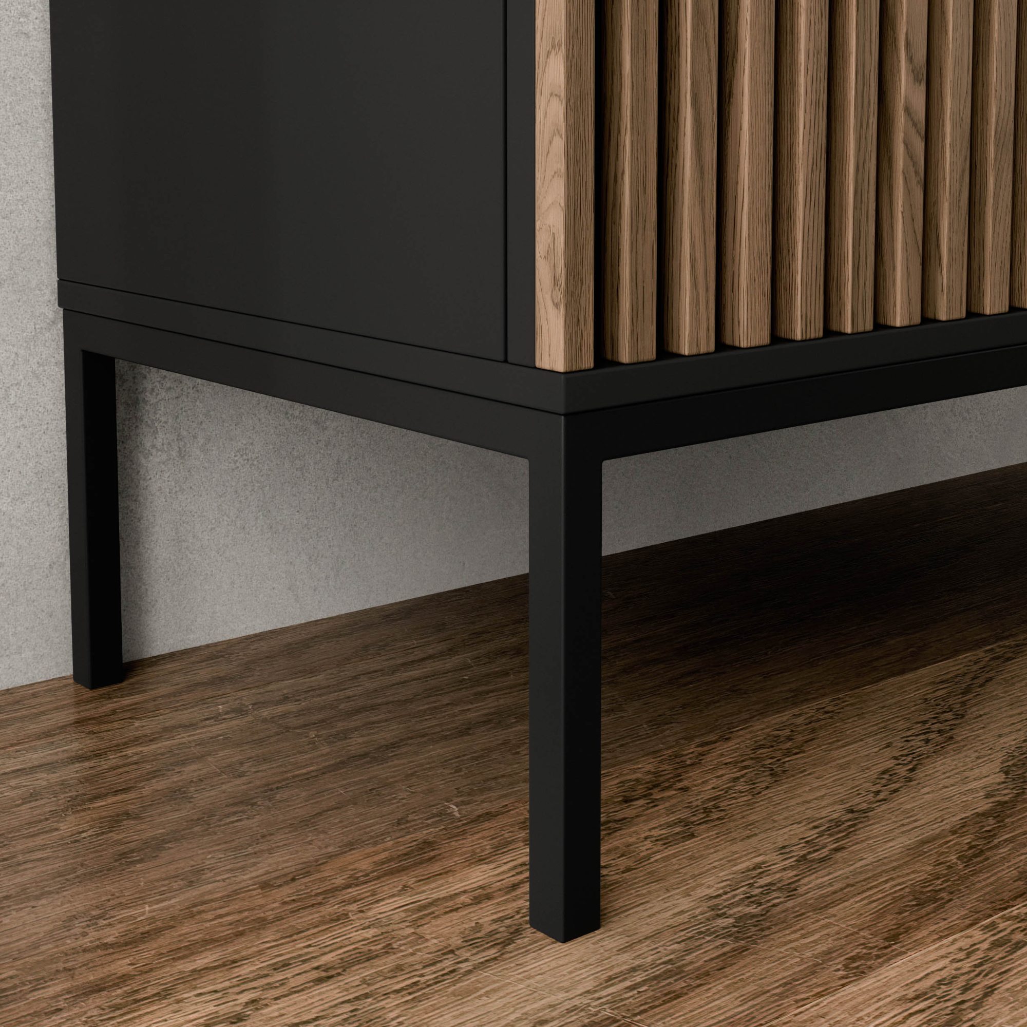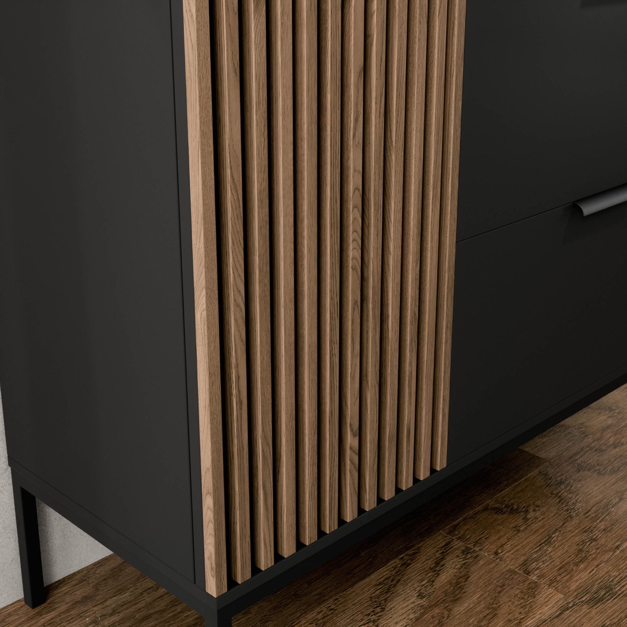 Vitrína ODETTE s výrazným korpusom v dekore duba artisan a odtieni čiernej farby príjemne zútulní vašu domácnosť.
