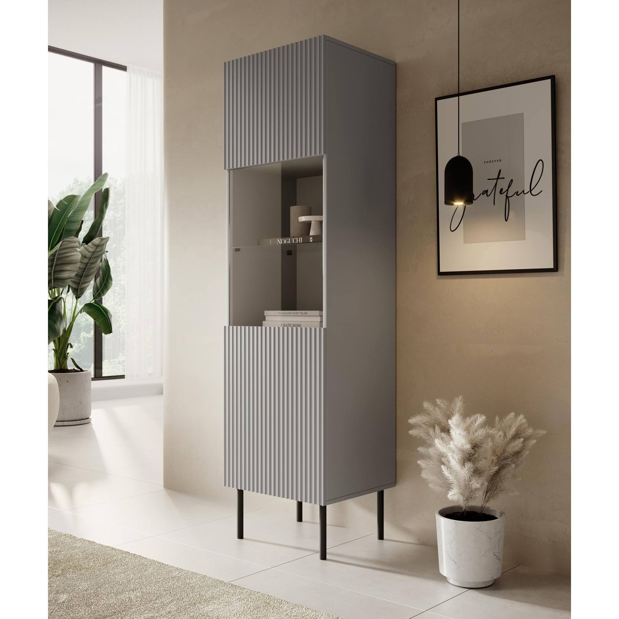 Vitrína OSINSAU KM-1 v minimalistickom štýle ozdobí každý moderný interiér. Vďaka svojmu vzhľadu a dostatočne veľkému úložného priestoru z nej robí praktický nábytok do akejkoľvek obývacej izbe alebo spálne. Drážkovanie predných častí dodáva nábytku ďalší charakter a originálny vzhľad.