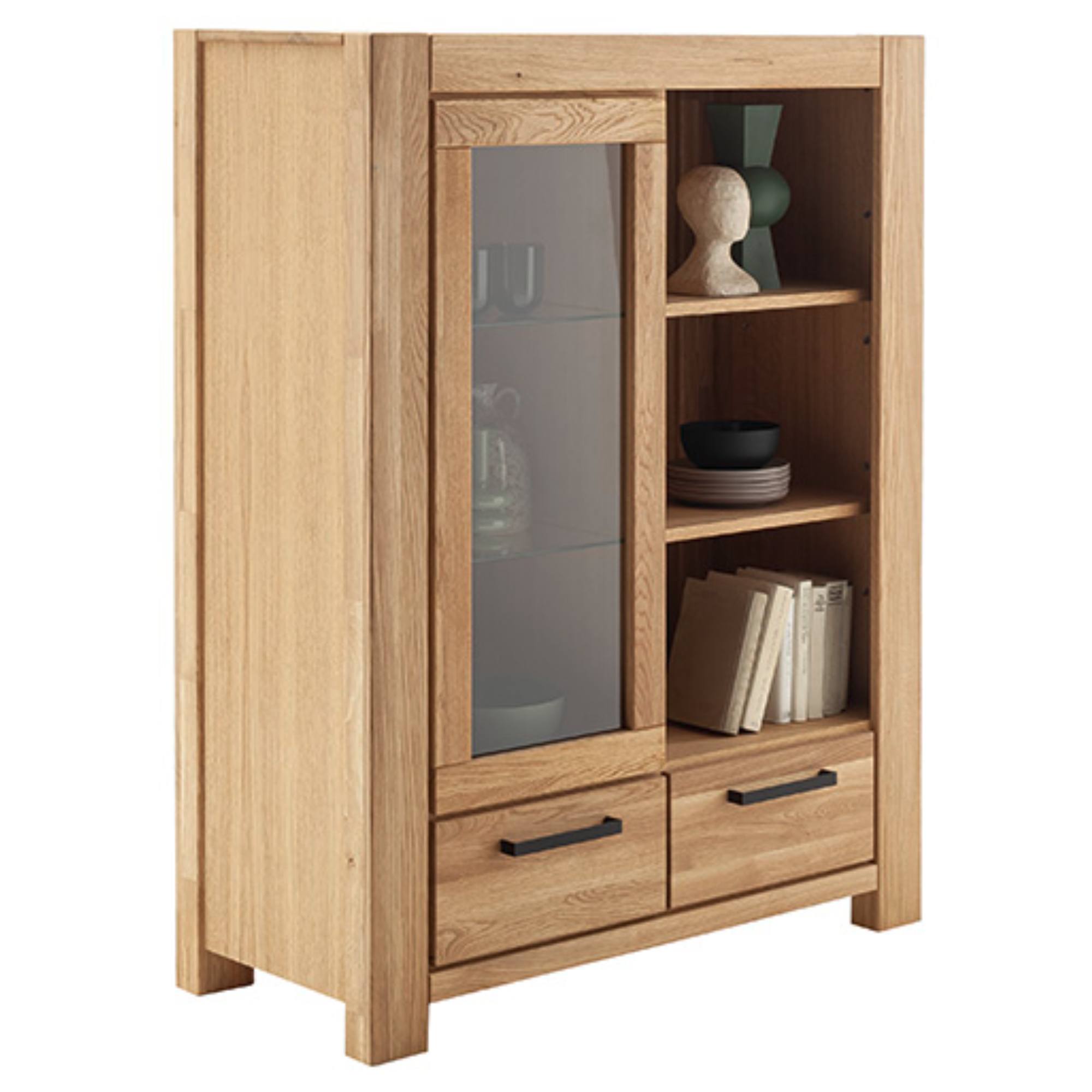 Horná sekcia je rozdelená na otvorenú a uzavretú časť, ktoré poskytujú dostatočné miesto na vystavenie kníh a dekorácií. Za presklenými dvierkami sa nachádzajú 2 sklenené police a otvorená časť disponuje 2 klasickými policami. Spodná sekcia poskytuje krytý priestor v podobe 2 zásuviek. Máte tak k dispozícii ďalšie odkladacie miesto na najrôznejšie predmety, ktoré nepotrebujete mať práve na očiach.