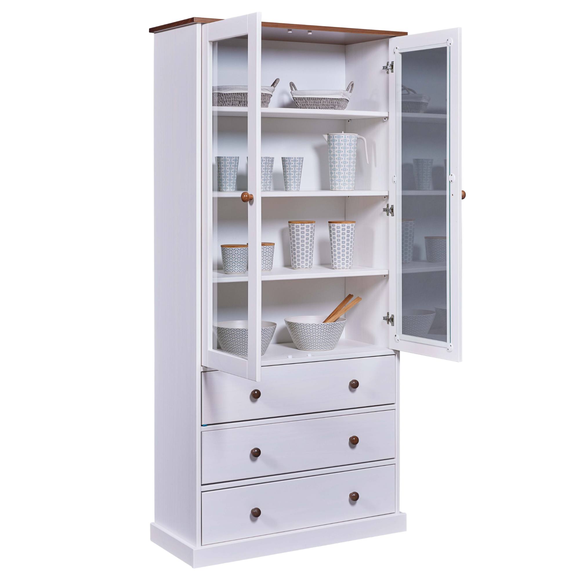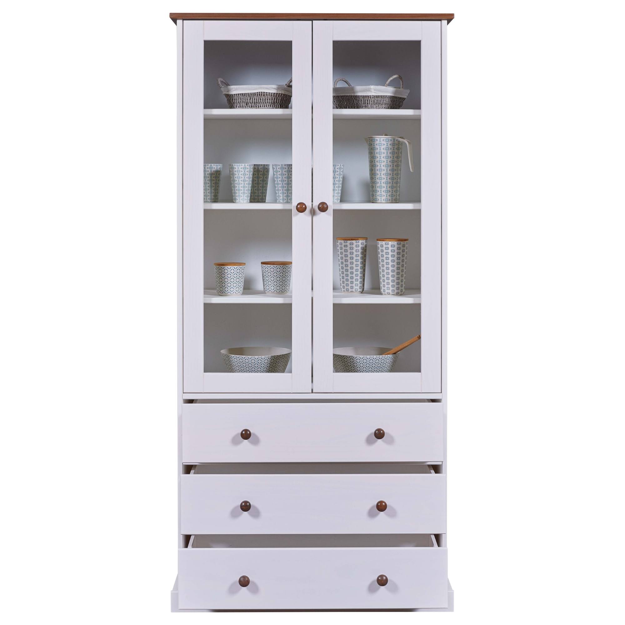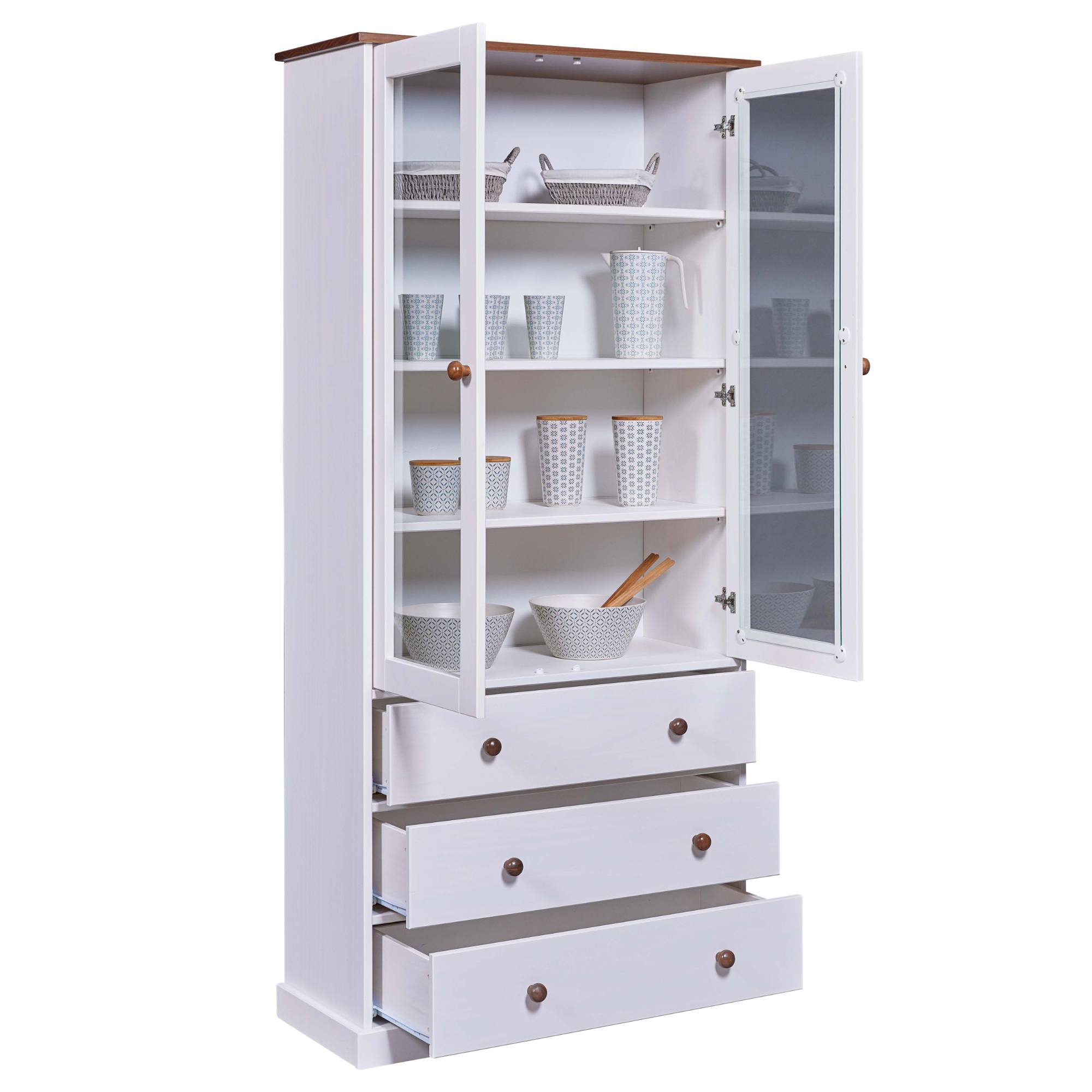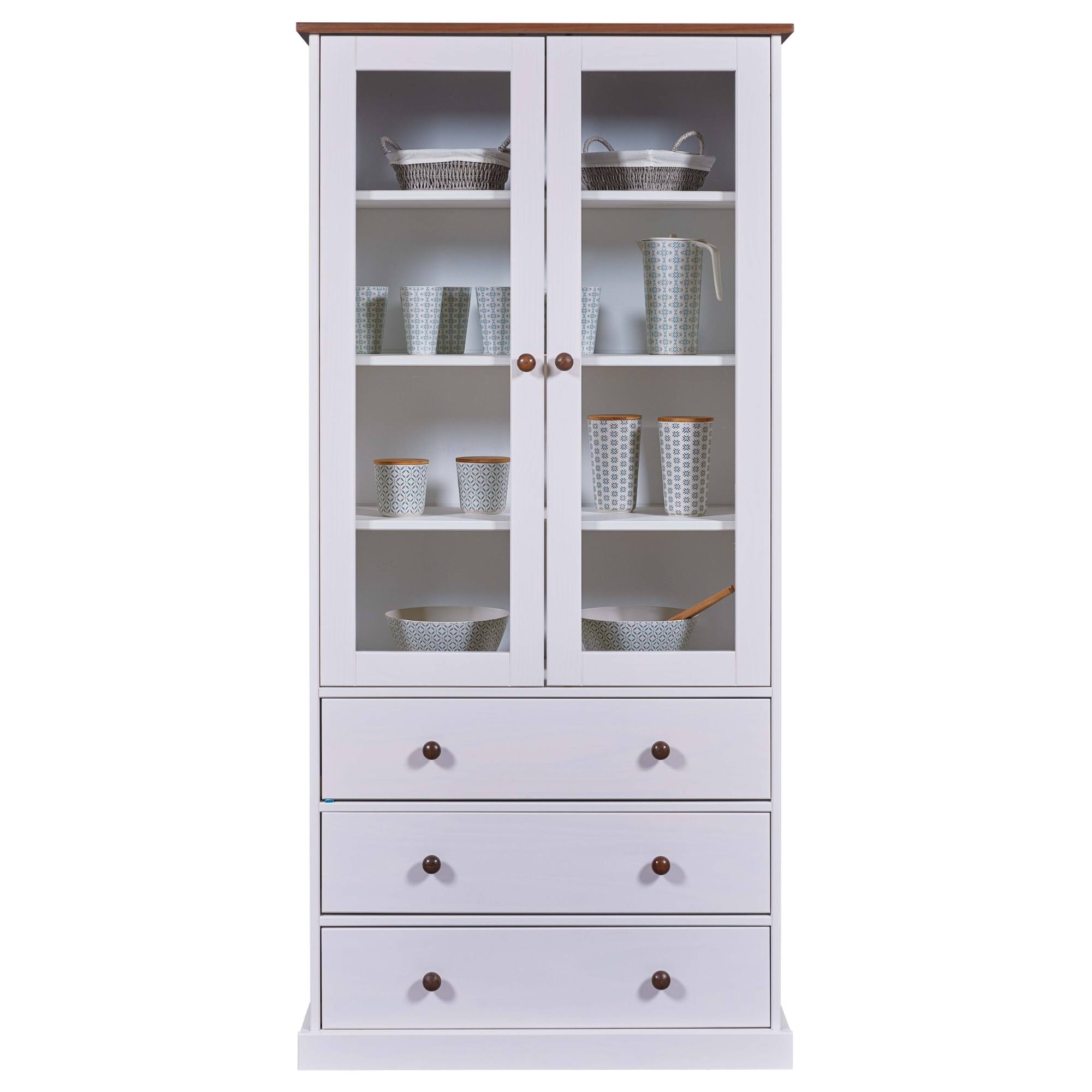 Vitrína WESLEY si vás získa kvalitným vyhotovením z masívnej borovice. Ideálna je do prostredia, ktorému dominuje vidiecky romantický štýl. Ponúka dostatok priestoru na všetko, čo potrebujete mať po ruke či už v jedálni, alebo v kuchyni. Vitrína má dvoje presklené dvierka s vnútornými policami a tri zásuvky. Povrch je lakovaný bielou farbou. Vitrína WESLEY bude praktickou ozdobou vašej domácnosti.