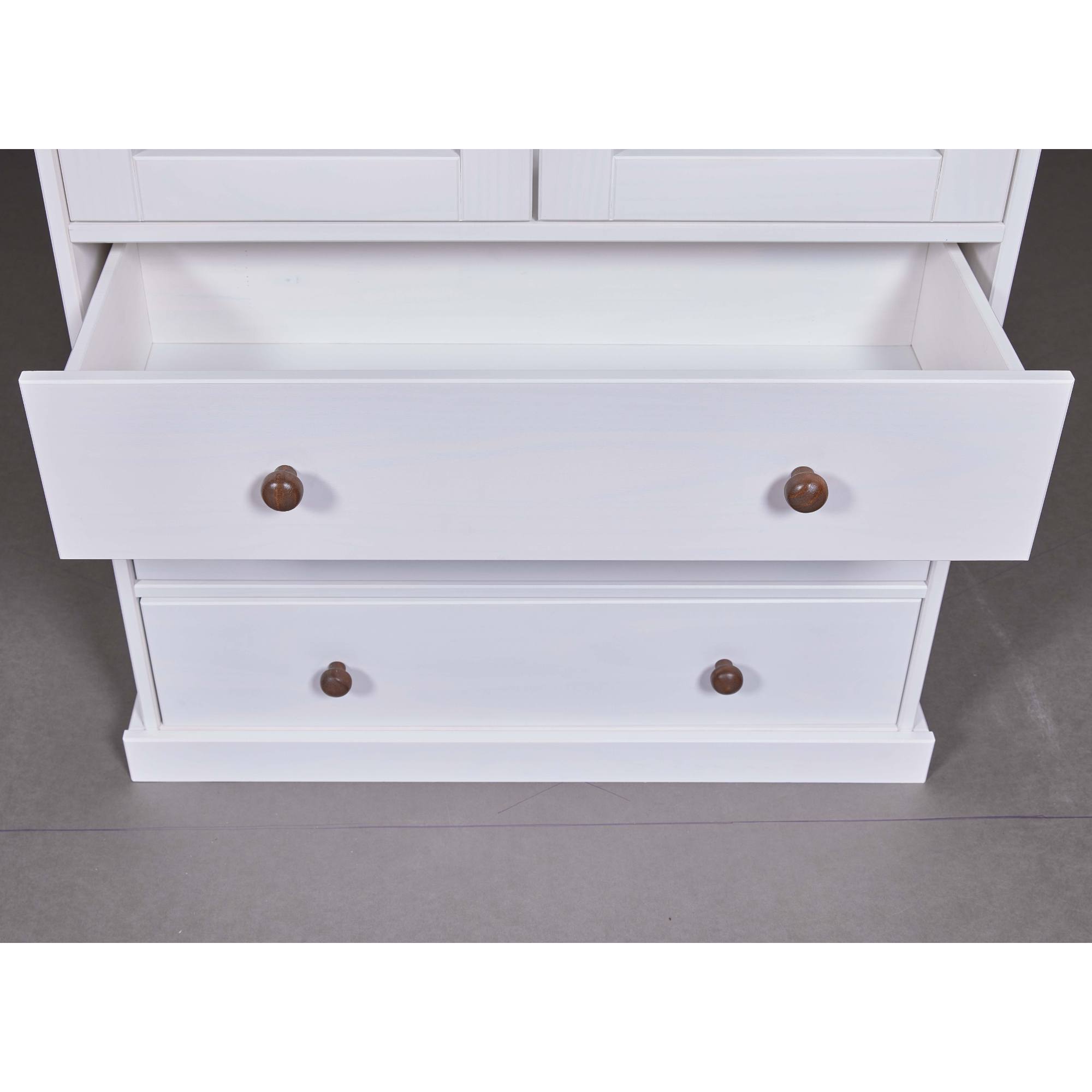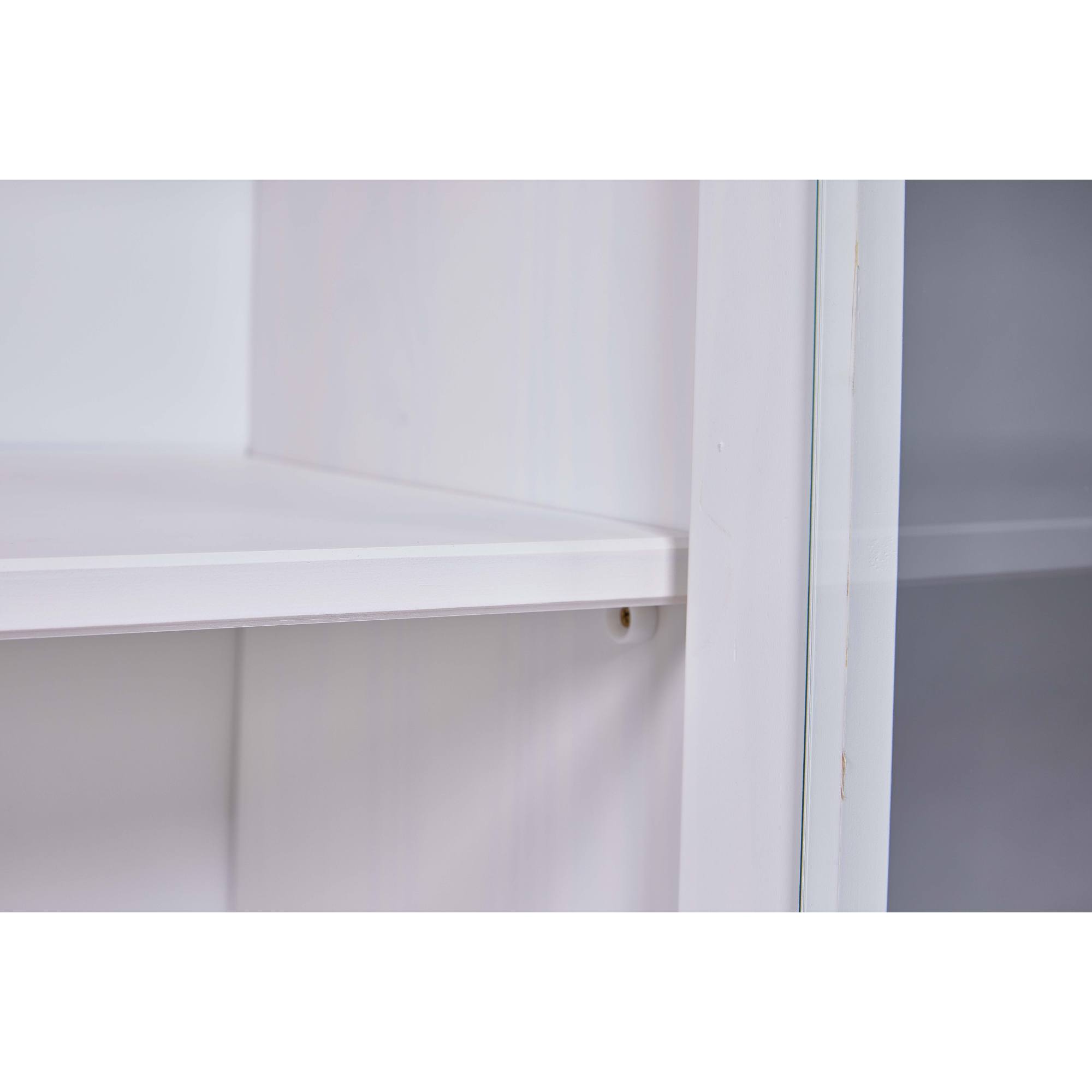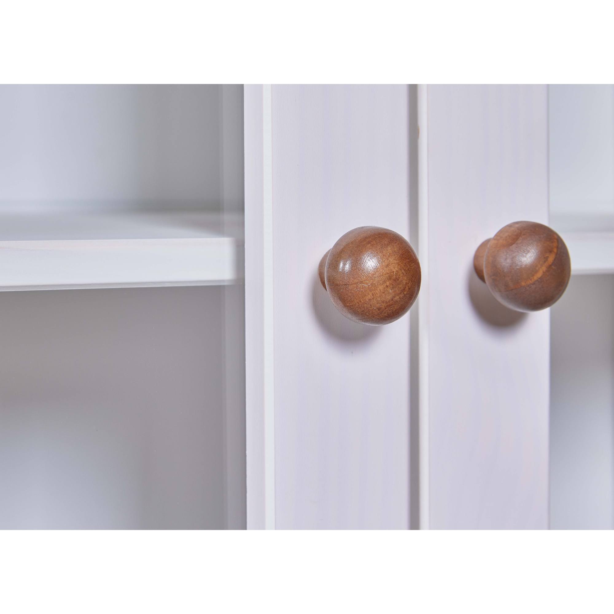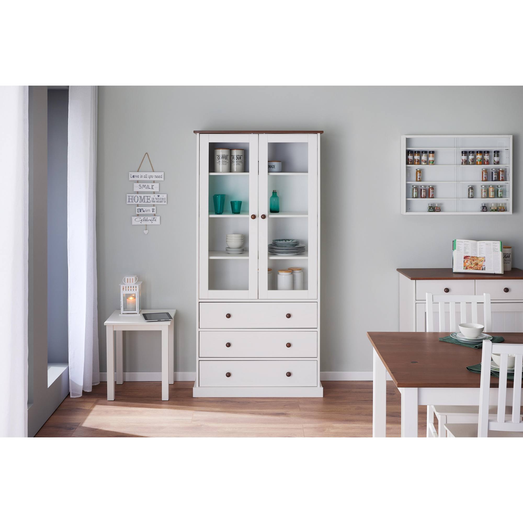 Vitrína WESLEY si vás získa kvalitným vyhotovením z masívnej borovice. Ideálna je do prostredia, ktorému dominuje vidiecky romantický štýl. Ponúka dostatok priestoru na všetko, čo potrebujete mať po ruke či už v jedálni, alebo v kuchyni. Vitrína má dvoje presklené dvierka s vnútornými policami a tri zásuvky. Povrch je lakovaný bielou farbou. Vitrína WESLEY bude praktickou ozdobou vašej domácnosti.