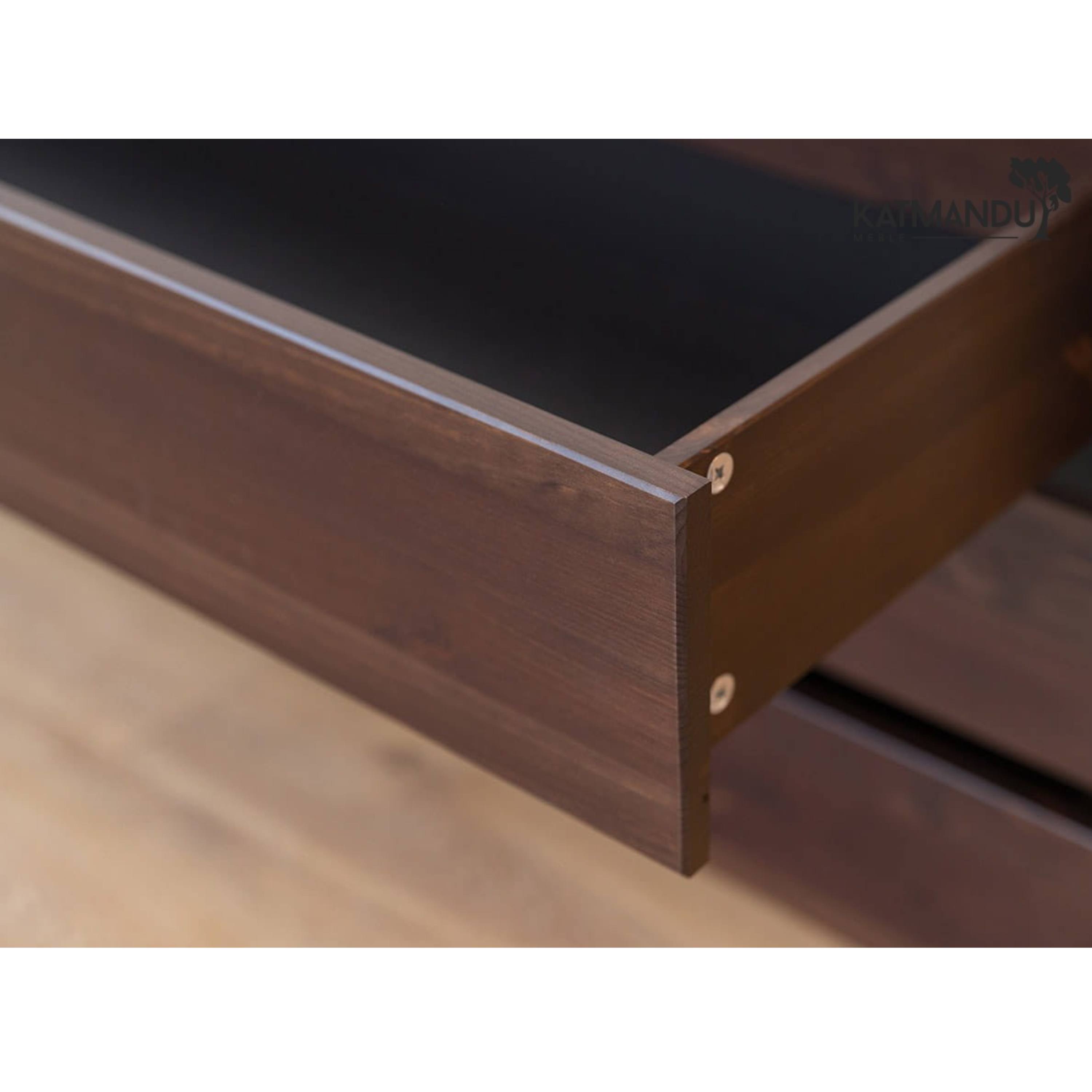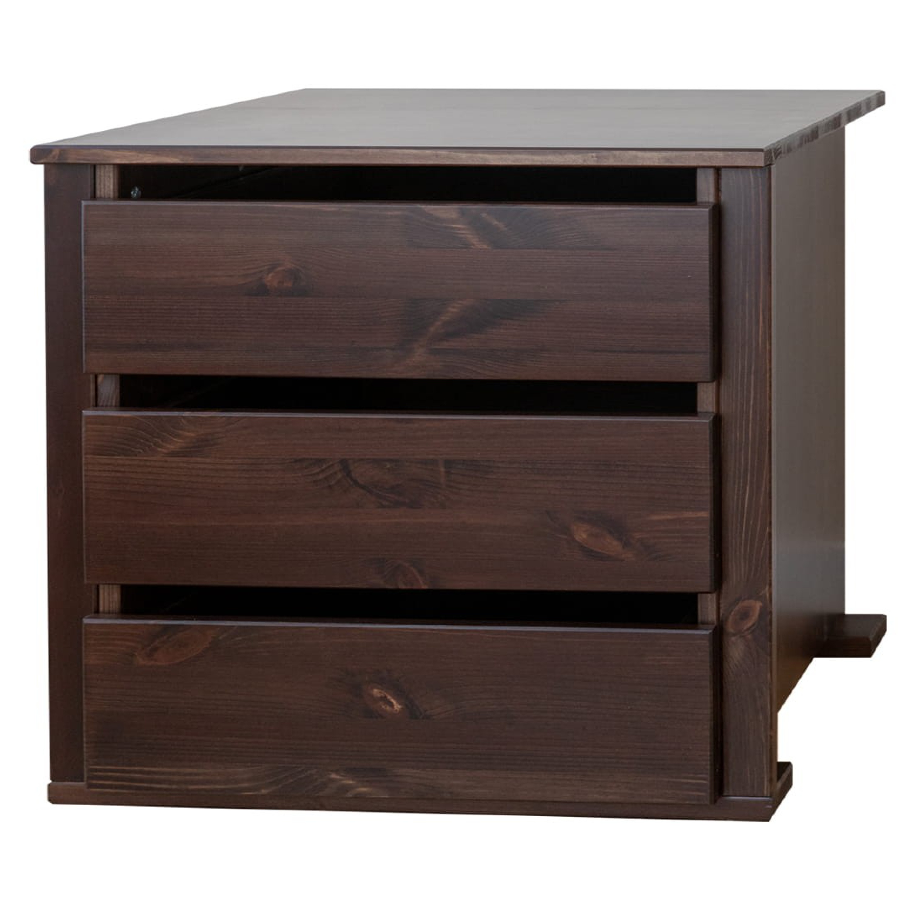 Vyrobený je z masívneho borovicového dreva, ktoré vyniká pevnosťou, dlhou životnosťou a prirodzeným vzhľadom. Jeho povrch je ošetrený farbou na vodnej báze s cca 70 % krytím, ktorá necháva vyniknúť prirodzenú štruktúru dreva a podporuje autentický vzhľad nábytku. Vybavený je 3 praktickými zásuvkami, ktoré pomôžu usporiadať drobné odevy a doplnky vo vnútri skrine. Systém tlmeného dovierania navyše umožňuje plynulé a tiché zatváranie zásuviek.