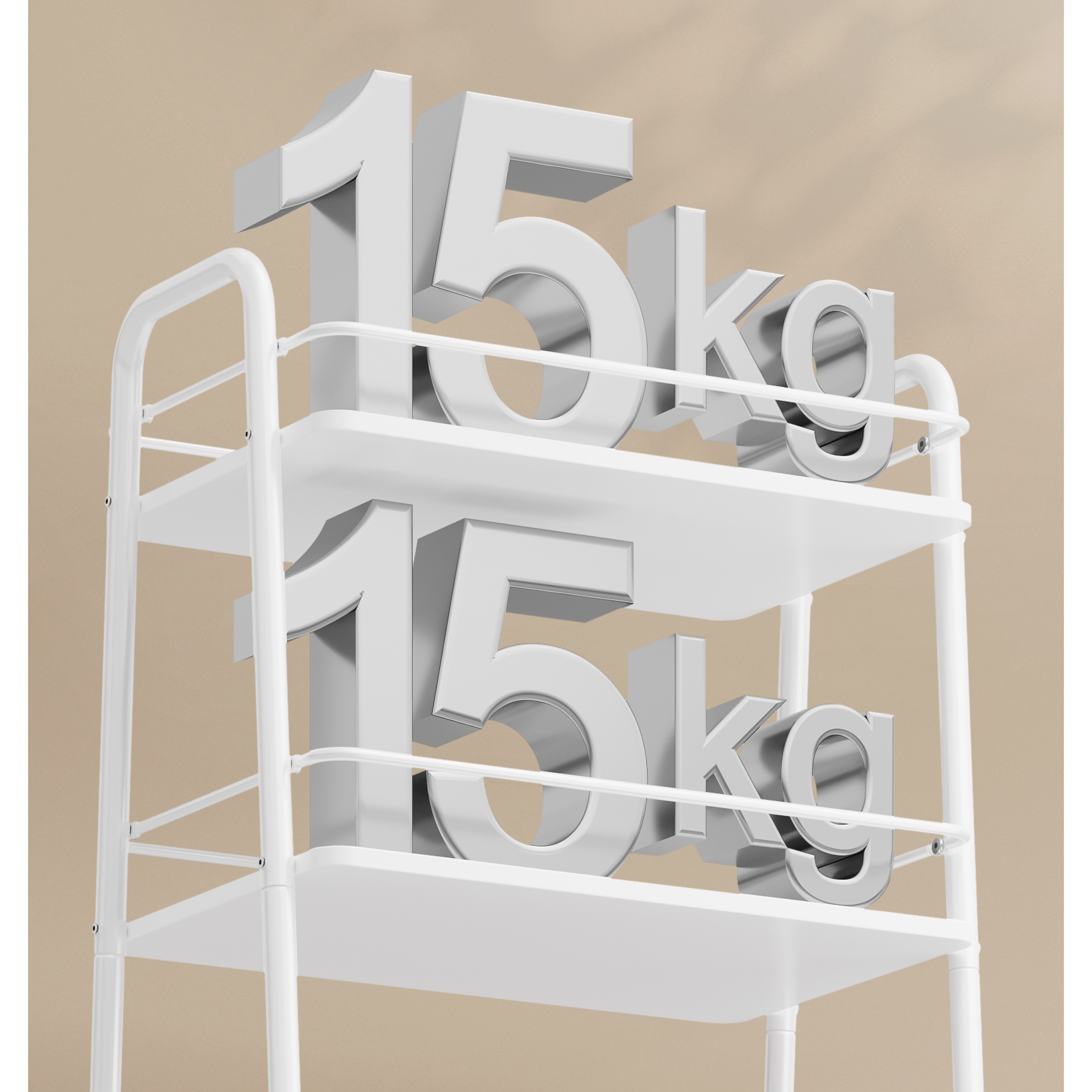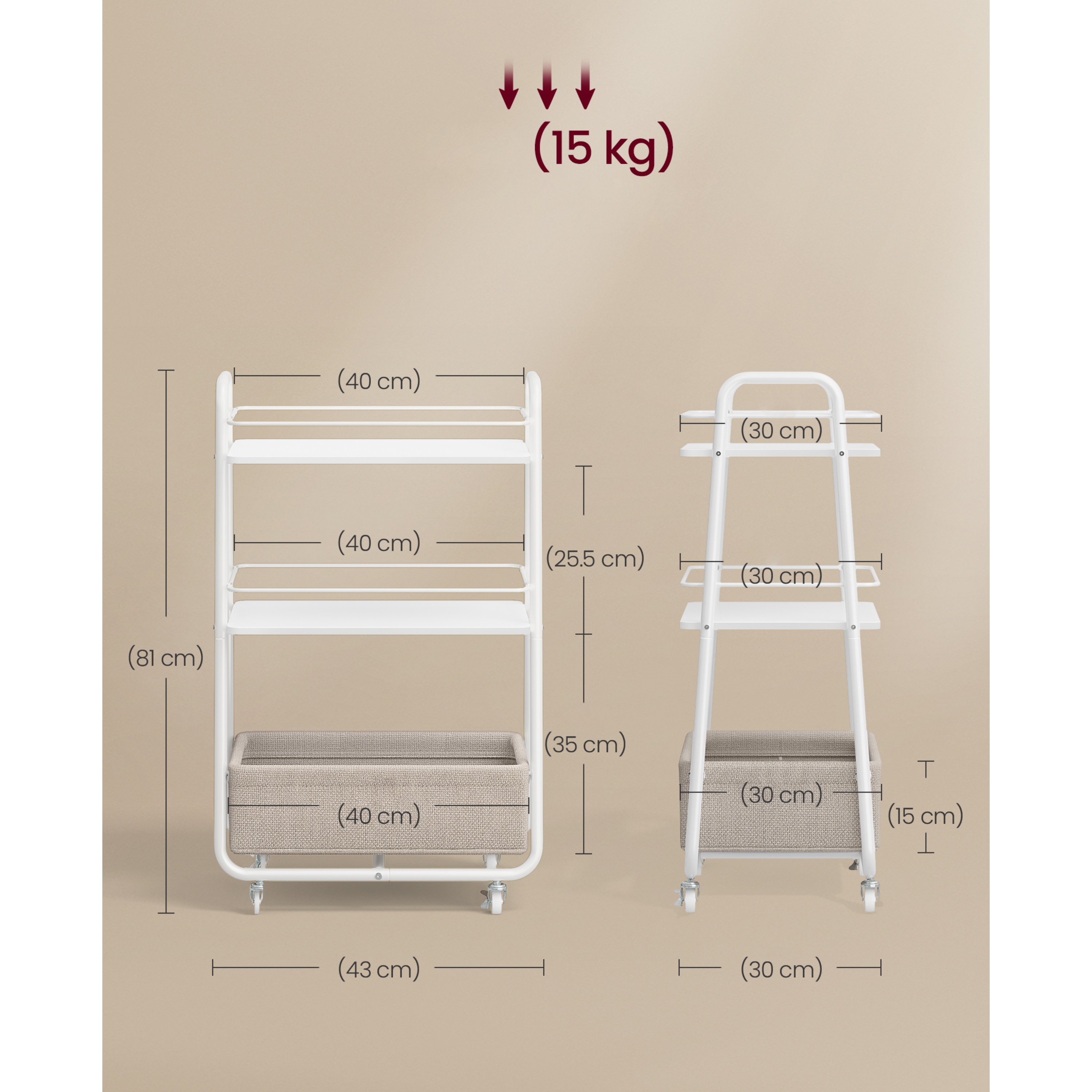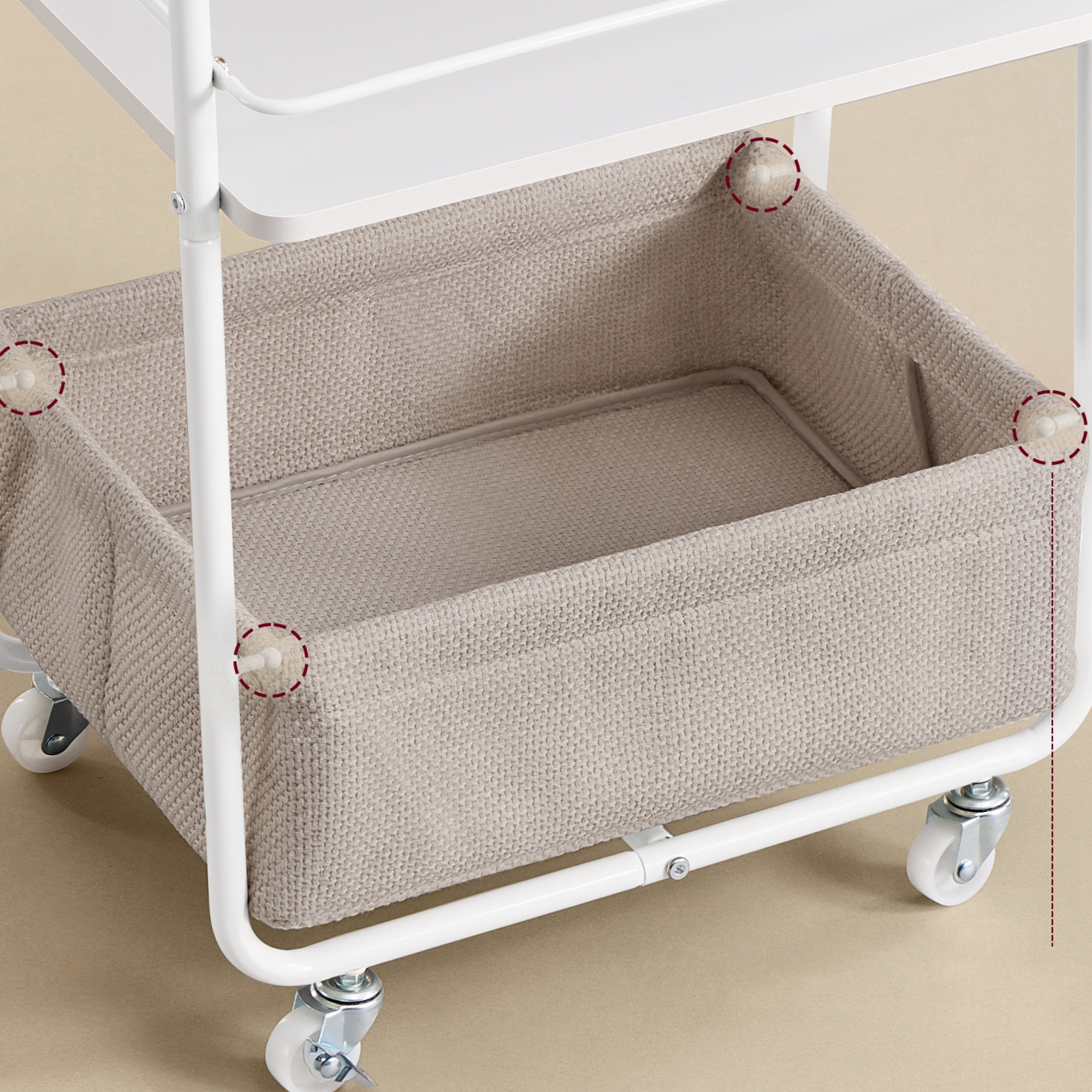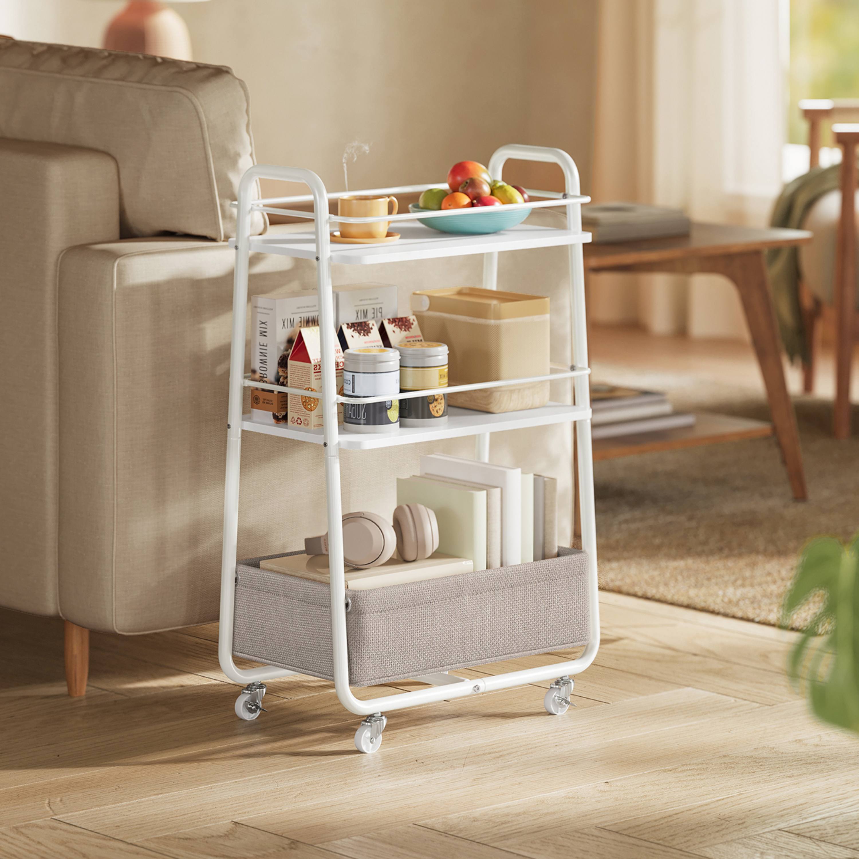 Stabilitu zabezpečuje konštrukcia z kovu. Dostatočný odkladací priestor poskytujú tri police, z toho spodná polica je textilná. Vozík disponuje praktickými kolieskami, ktoré uľahčujú manipuláciu.