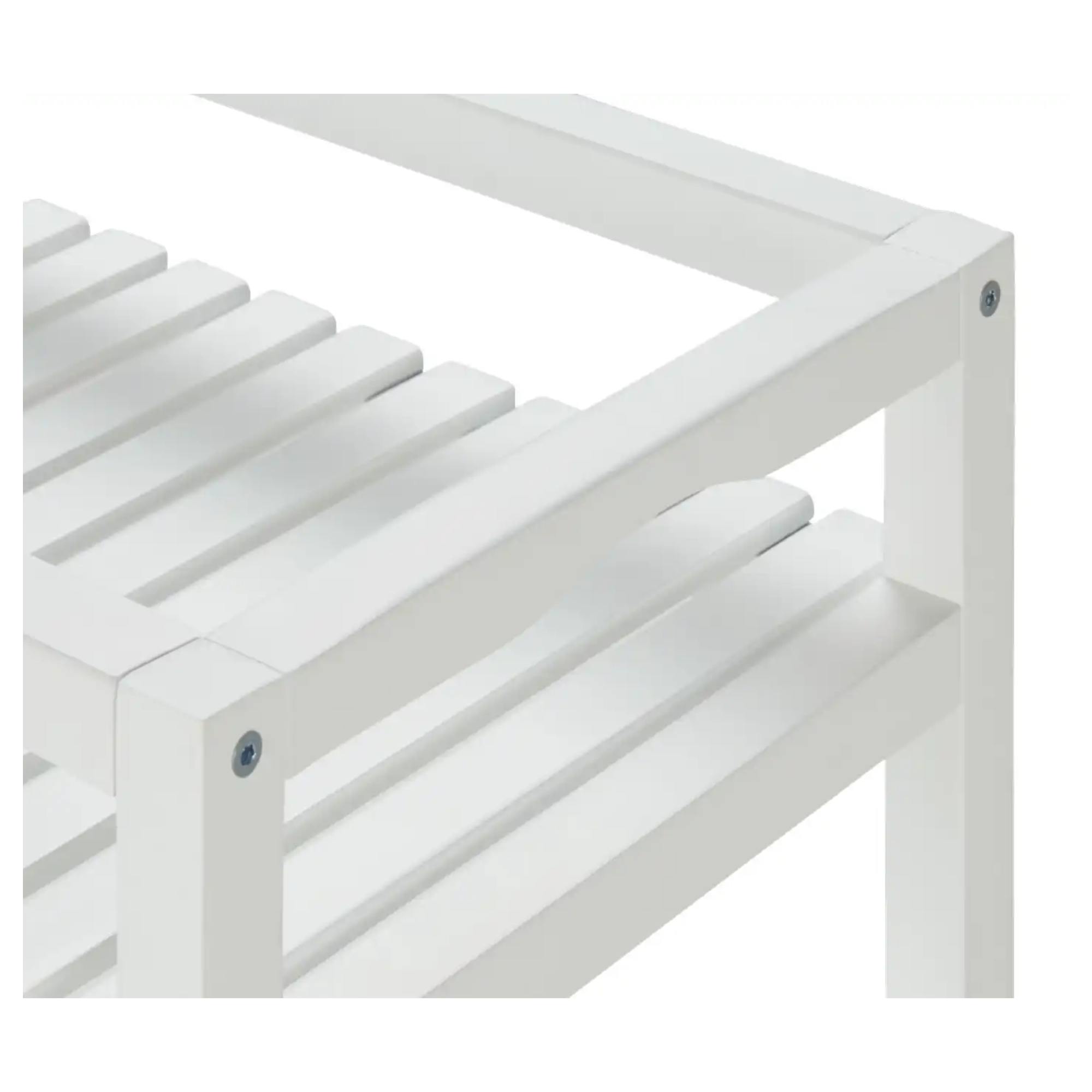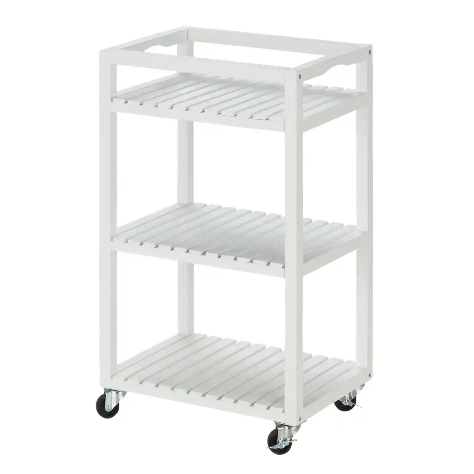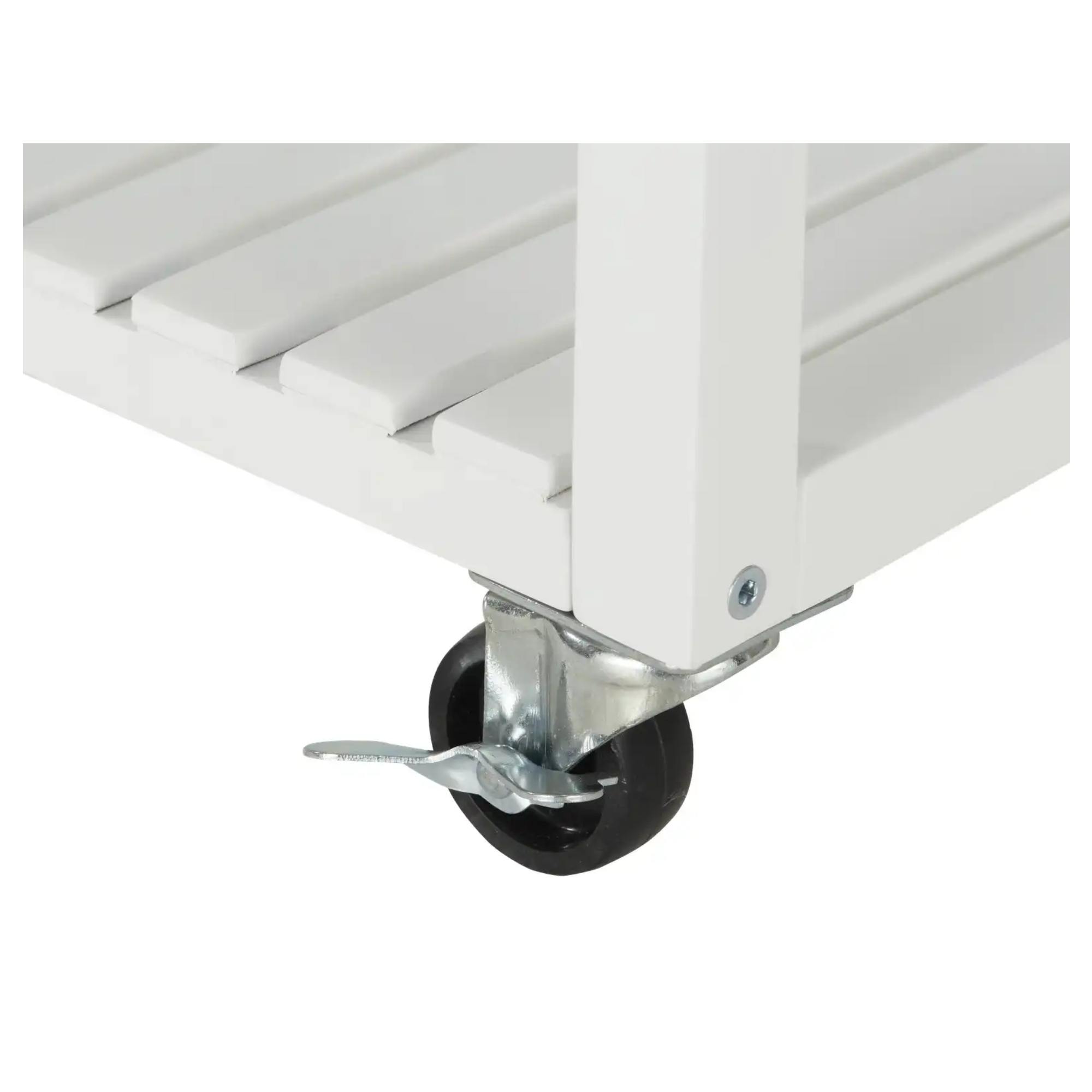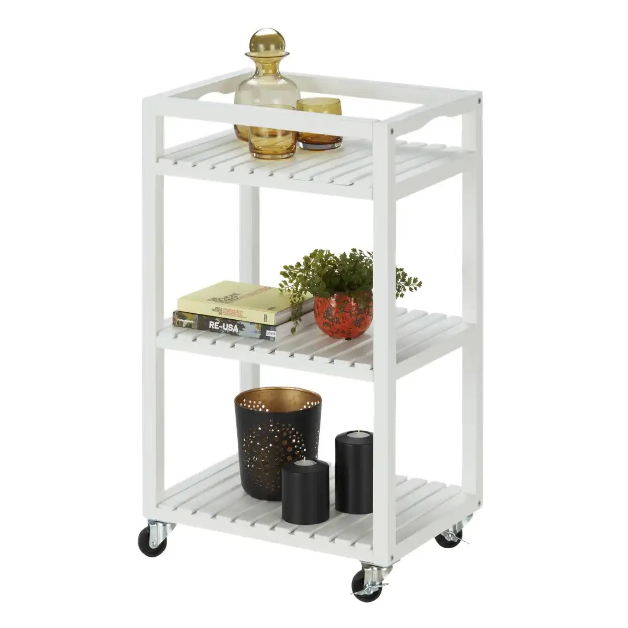 Je vyrobený z akáciového dreva, ktoré sa vyznačuje pevnosťou a trvácnosťou. Konštrukcia je doplnená o 4 kolieska, z ktorých 2 majú brzdu, pre jednoduchšiu manipuláciu. Disponuje 3 policami s celkovou nosnosťou 10 kg. Svojím nadčasovým dizajnom v bielej farbe zapadne do mnohých interiérov. Usporiadajte si kancelárske potreby, kuchynské náradie alebo ho využite ako priestranný nočný stolík.
