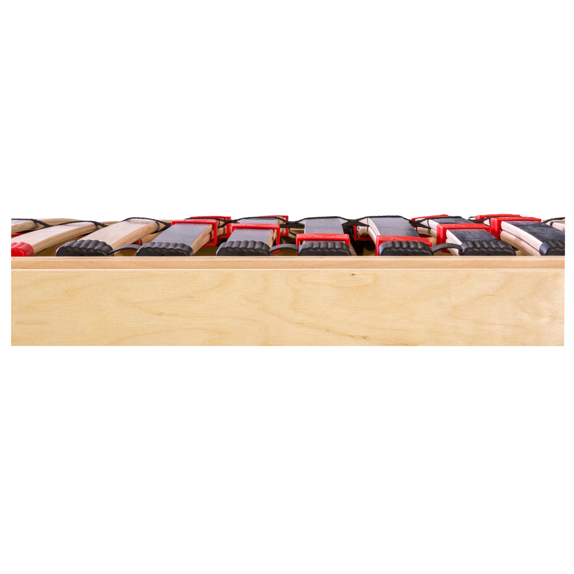 Rošt SOGNO BV T5 je nepolohovateľný rošt s možnosťou bočného výklopu pre prístup do úložného priestoru. Textilné ucho uľahčuje vyklápanie roštu, rovnako ako plynové piesty, ktoré zároveň držia rošt v otvorenej polohe. Tento kvalitný rošt je vyrobený z masívneho vrstveného brezového dreva a vybavený funkciou nastavenia tuhosti v oblasti bedier, kde je záťaž najvyššia. Pre vyššiu odolnosť roštu sú lamely v tejto časti zdvojené. Tuhosť ľahko nastavíte posúvaním pojazdových opaskov smerom do stredu a ku kraju rámu. Stredový stabilizačný popruh chráni matrac proti zlomeniu aj pri vysokom bodovom zaťažení. Vďaka ukotveniu lamiel vo výkyvných gumených puzdrách sa lamely ľahko prispôsobia vloženému matracu aj polohe tela. Vďaka tomu je ležanie ešte komfortnejšie. Rošt je vhodný pre všetky typy penových matracov.