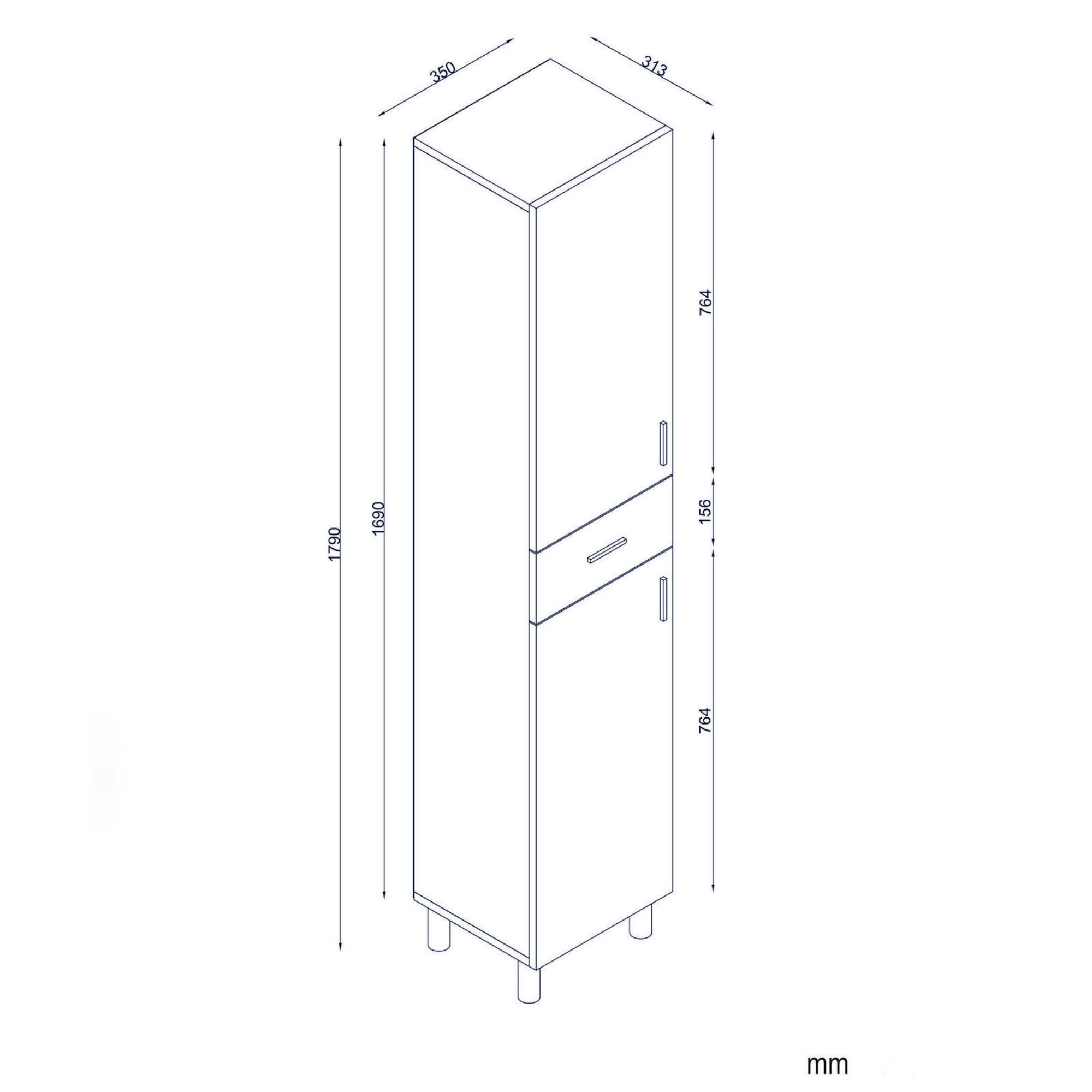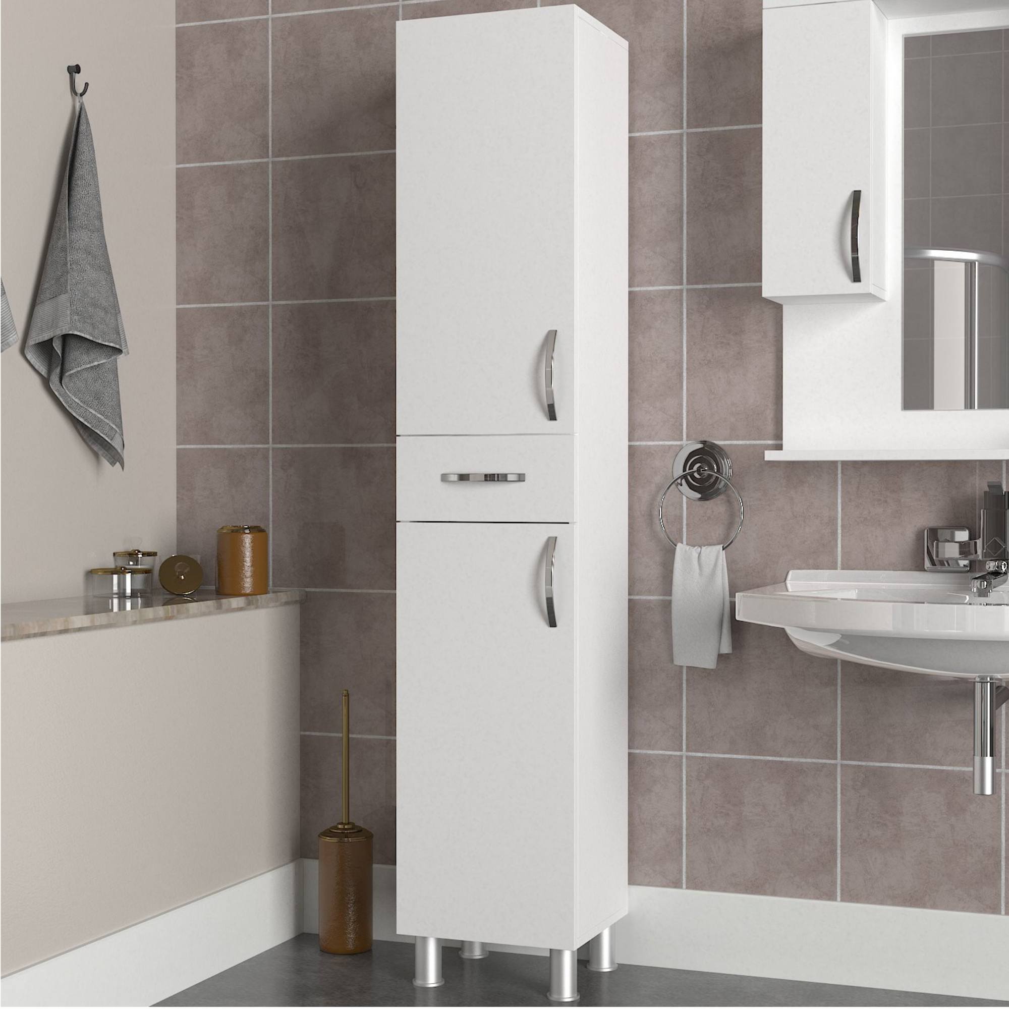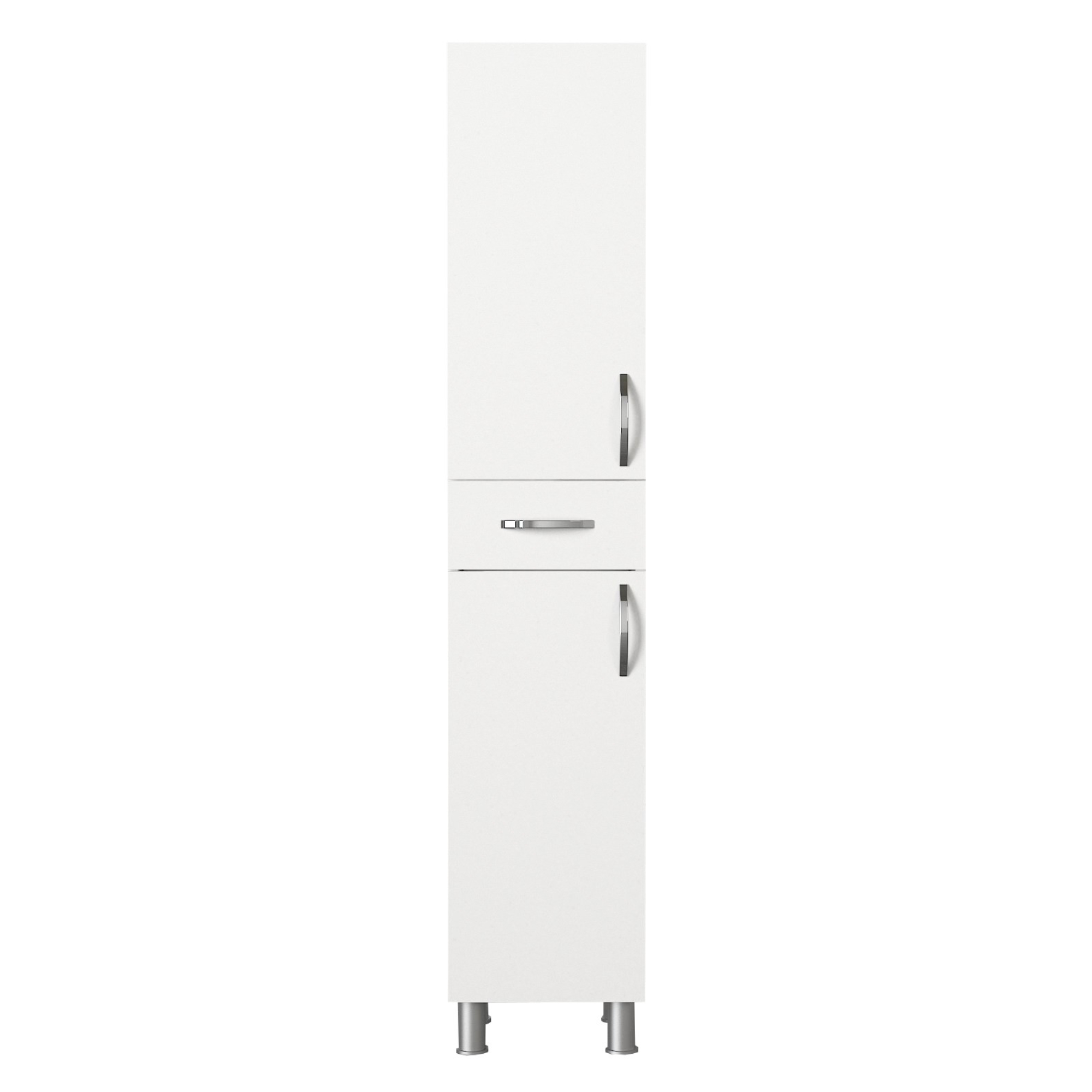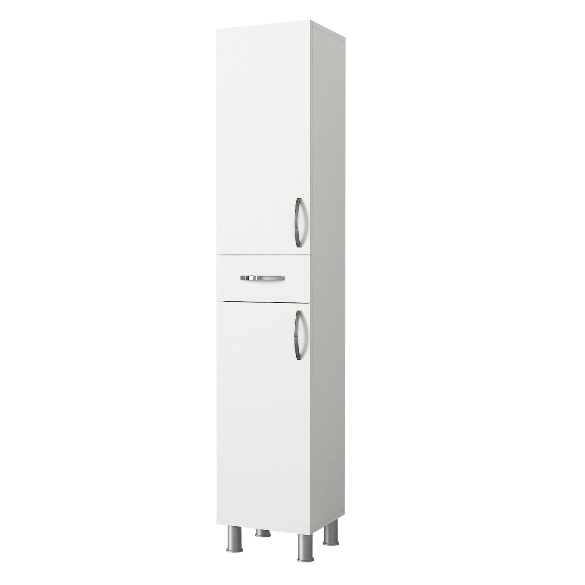 Vysoká kúpeľňová skrinka ARIZONA vám pomôže udržať vašu kúpeľňu perfektne organizovanú, pretože ponúka dostatok prehľadného úložného priestoru. Za hornými aj spodnými dvierkami sa nachádza jedna vložená polica. Uprostred sa nachádza jedna zásuvka. Pokiaľ sa do skrinky rozhodnete uložiť čistiace prostriedky, kozmetiku, uteráky aj toaletný papier, budete vždy presne vedieť, kde čo nájdete. Čistý vzhľad a elegantné rúčky vnesú do kúpeľne nádych modernosti.