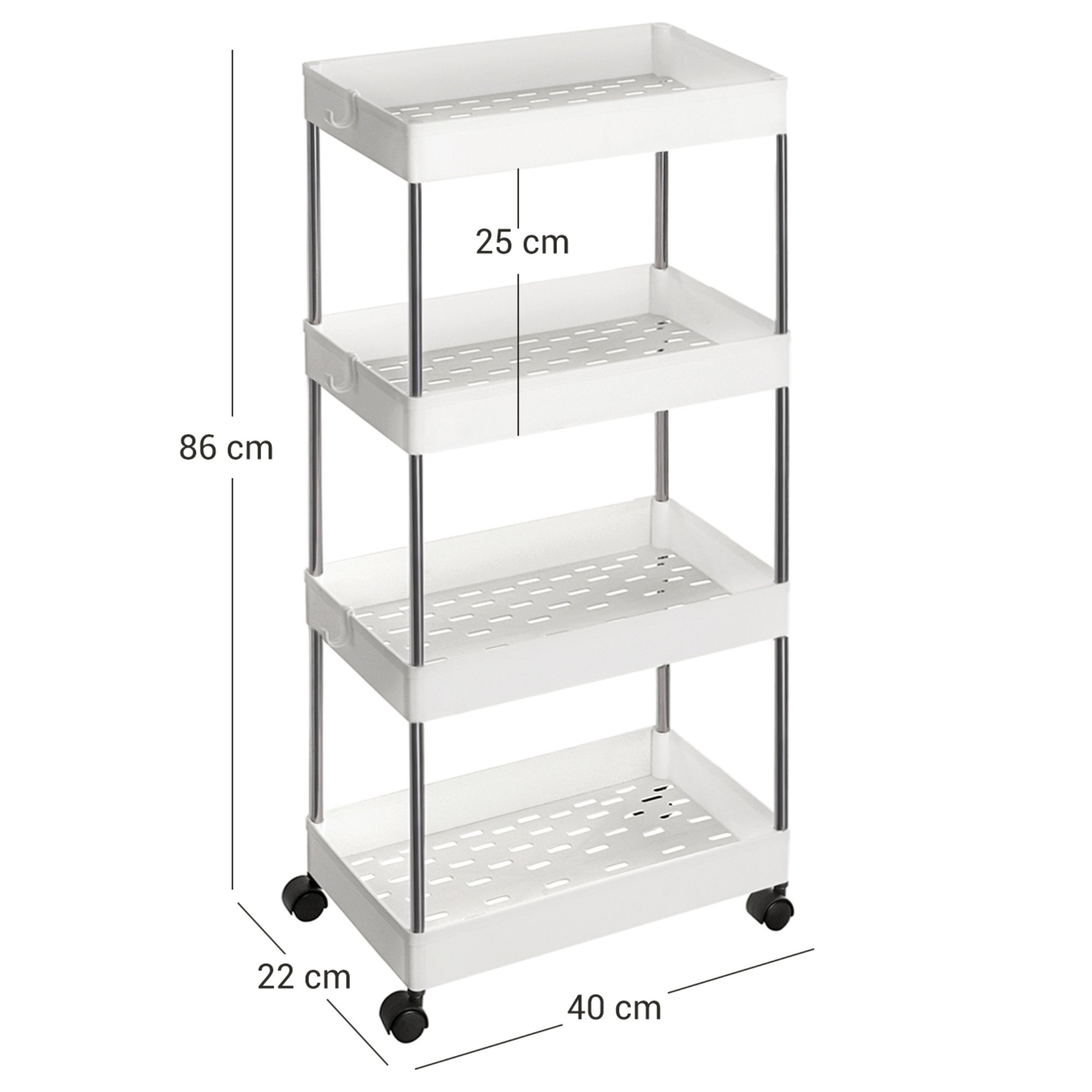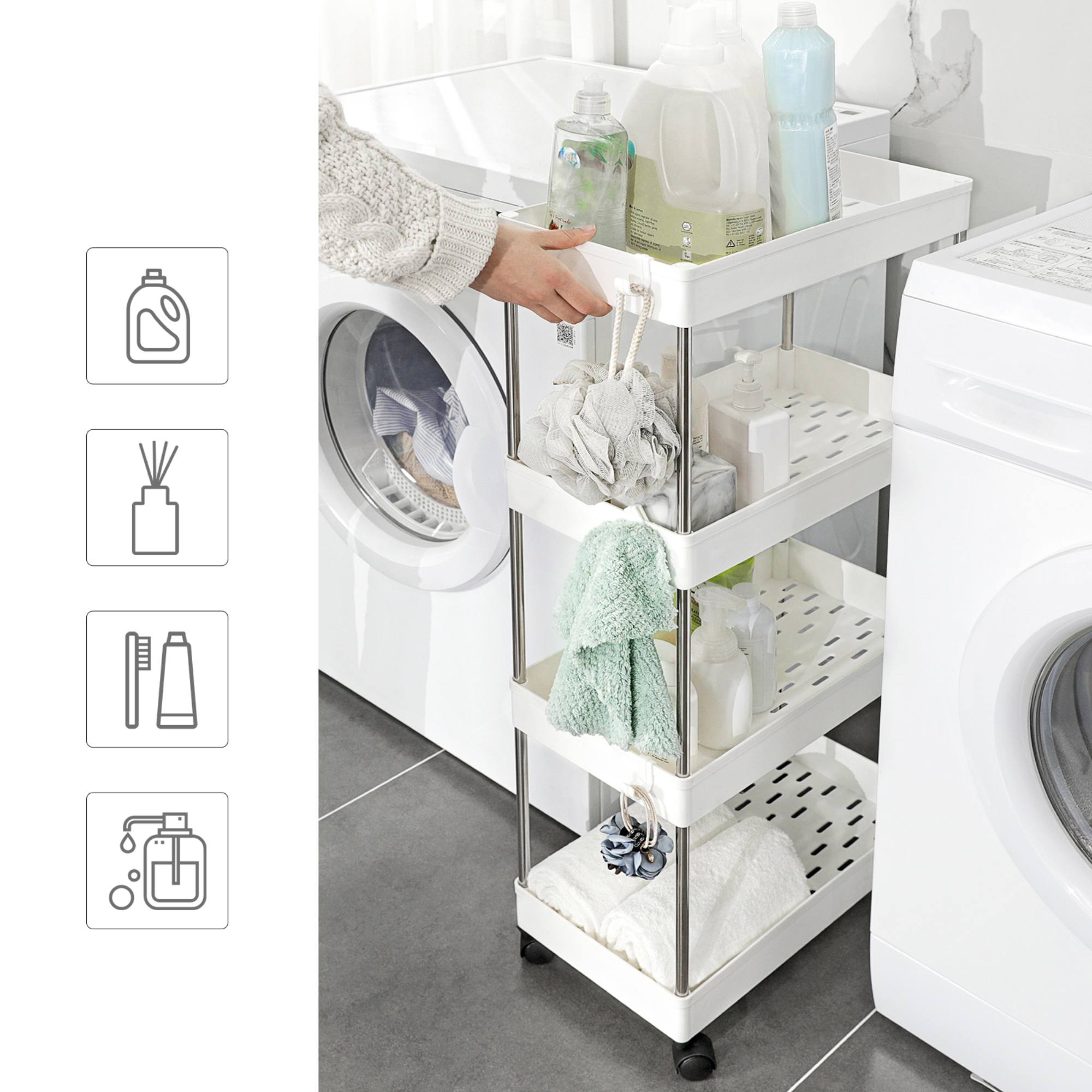 Praktického pomocníka v podobe tohoto výsuvného vozíka s kolieskami doma radi uvítate. Môžete ho využiť v kuchyni na uskladnenie ingrediencií na varenie, v kúpeľni na umývacie prostriedky a uteráky. Vozík je pojazdný, jeho kolieska sú otočné o 360 °, takže je s ním jednoduchá manipulácia. Plastové police majú na dne otvory a na okrajoch môžete využiť tri háčiky, ktoré sú súčasťou balenia.