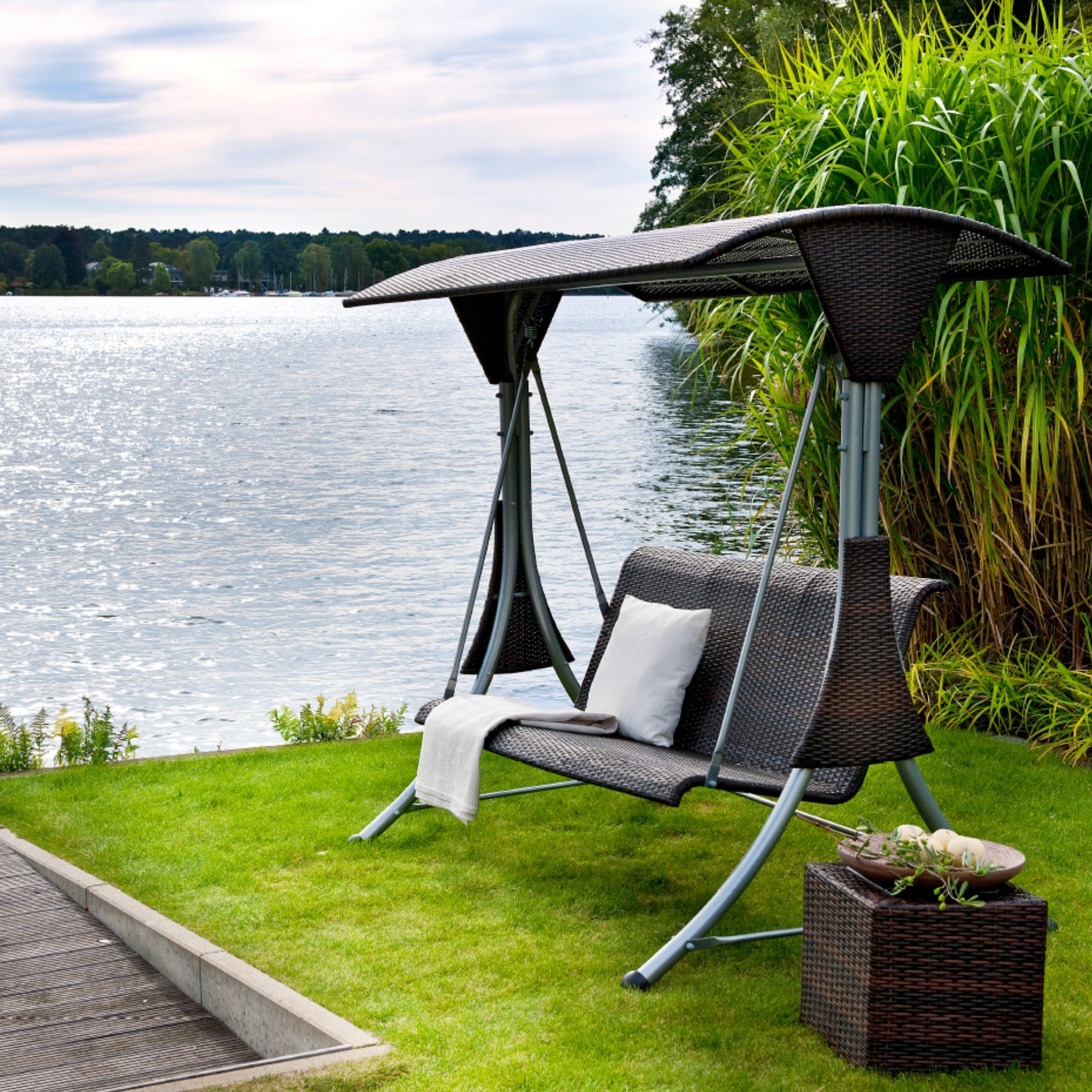 Elegantná hojdacia lavica SWING bude skvelým spoločníkom na chvíle relaxácie vo vašej záhrade. Súčasťou je priestranná strieška z umelého ratanu, ktorá poskytuje tieň v horúcich dňoch. V rovnakom vyhotovení je aj samotná lavica. Umelý ratan sa vyznačuje vyššou odolnosťou proti nepriazni počasia a dlhou životnosťou a pritom je od pravého takmer na nerozoznanie. Stabilná konštrukcia je vyrobená z kvalitnej ocele s lakovanou povrchovou úpravou v striebornej farbe. Na konci je vybavená plastovými podložkami. Nechajte sa rozmaznávať jemným hojdaním lavice SWING v žiare letného slnka, alebo pri zapadajúcom slnku.