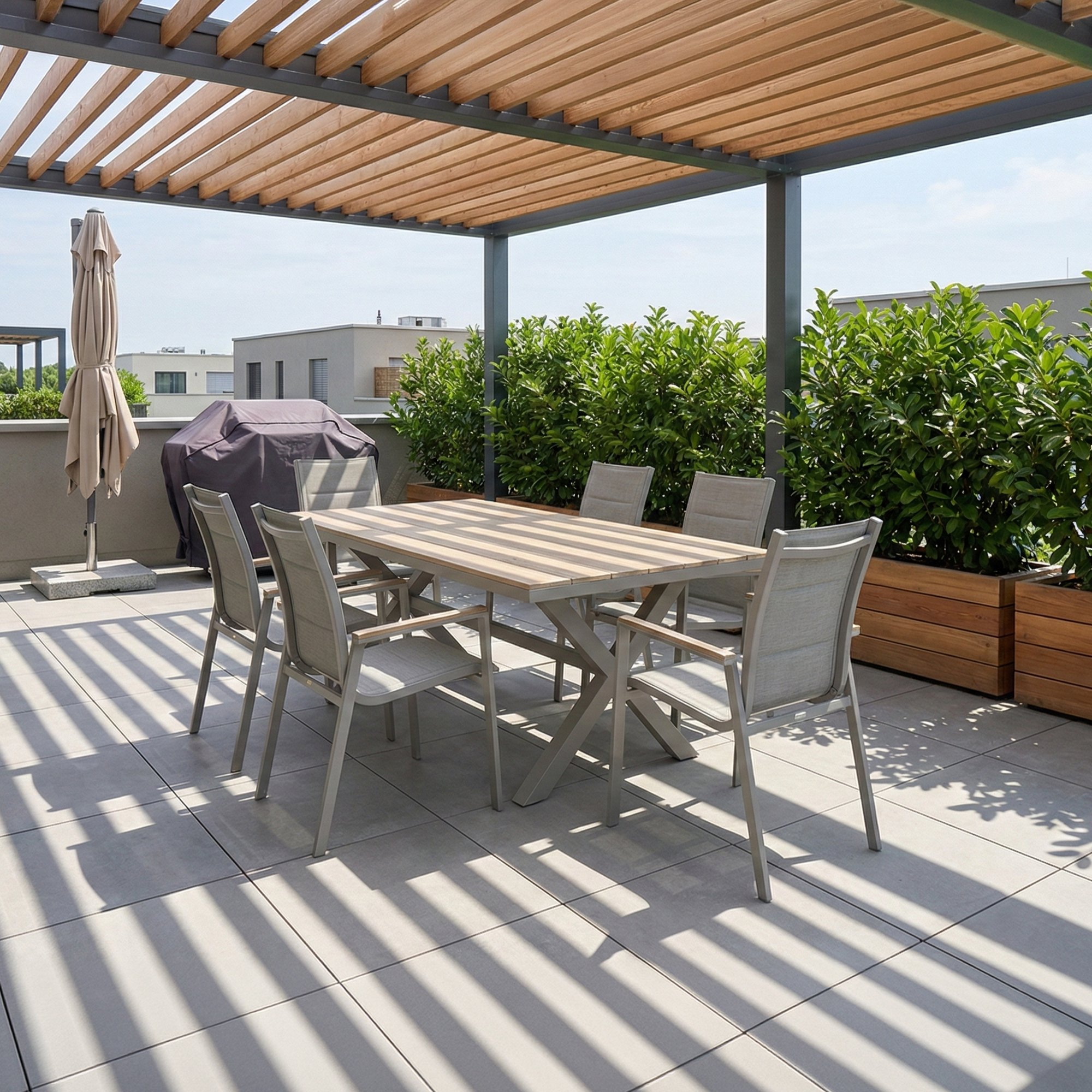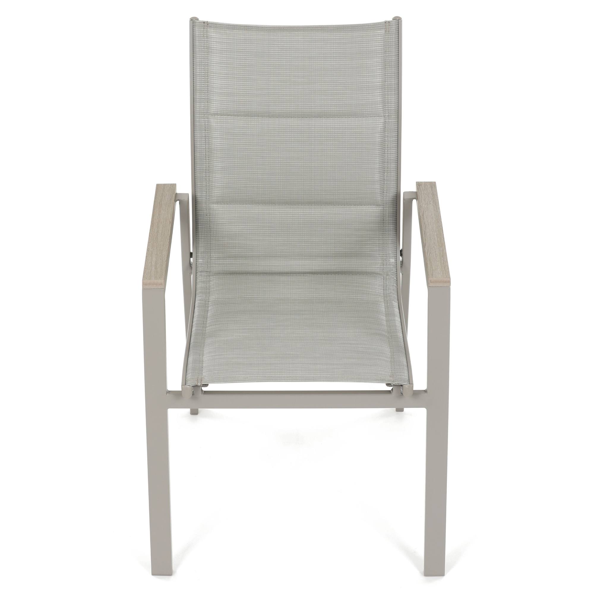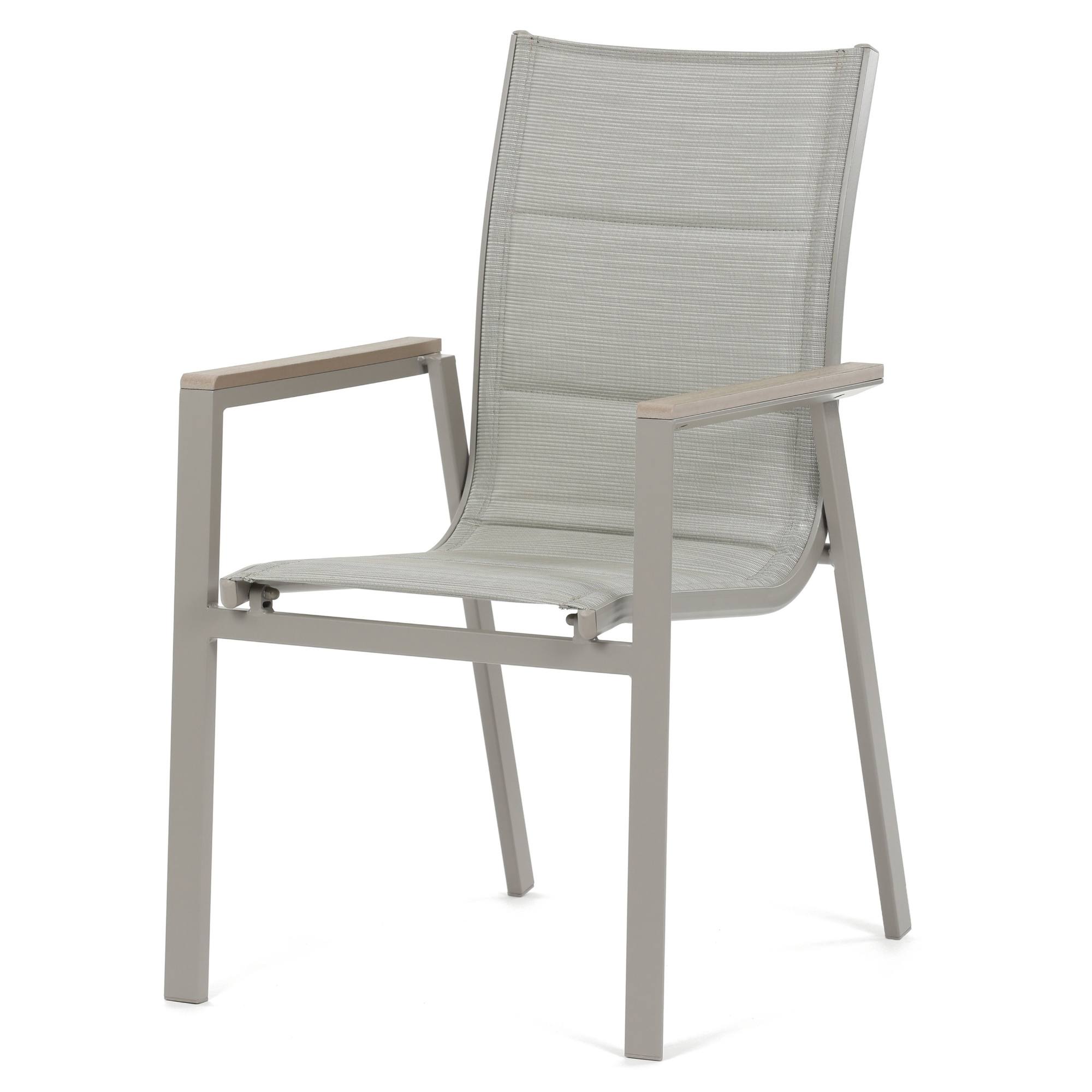 Jej konštrukcia je z hliníka, ktorý zaisťuje nielen pevnosť, ale aj vysokú odolnosť proti korózii, čo oceníte pri dlhodobom používaní vonku. Sedadlo a operadlo sú potiahnuté kvalitným textilom s penovou výplňou, ktorá poskytuje maximálny komfort. K pohodliu pri sedení prispievajú aj podrúčky z polywoodu.