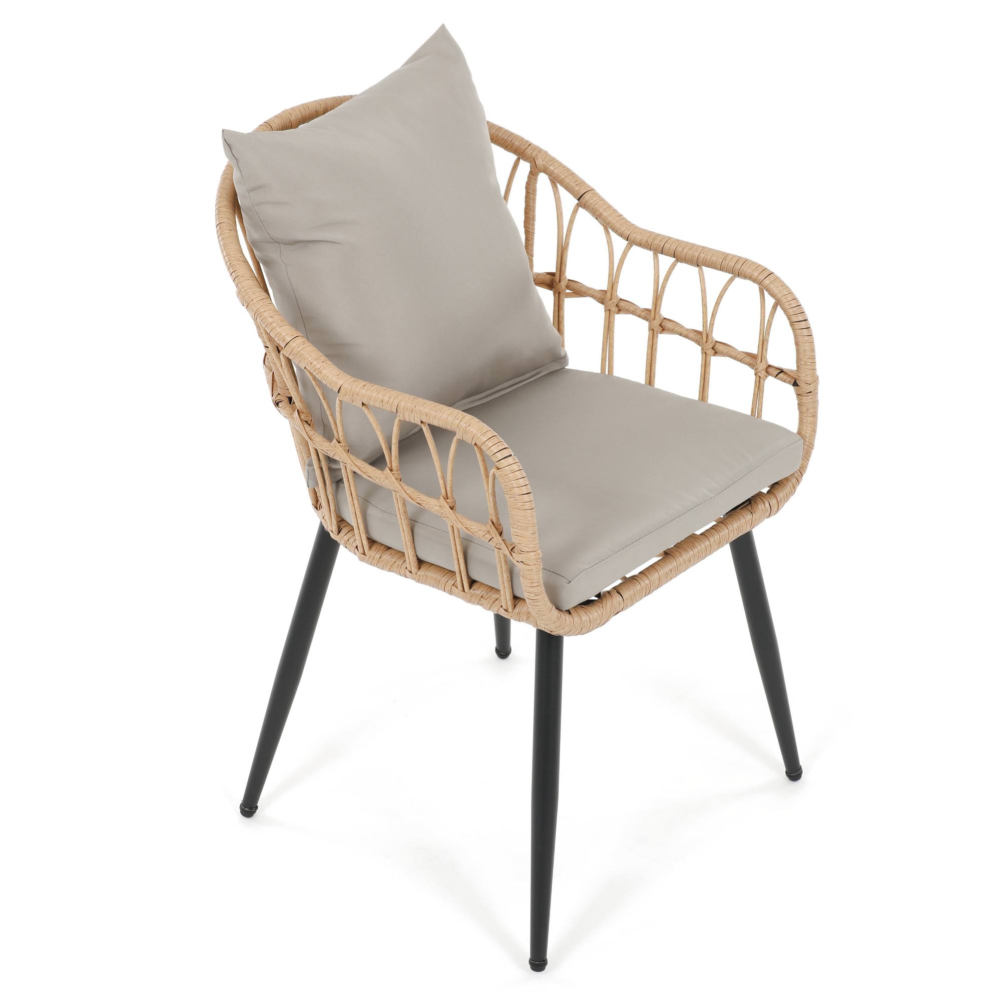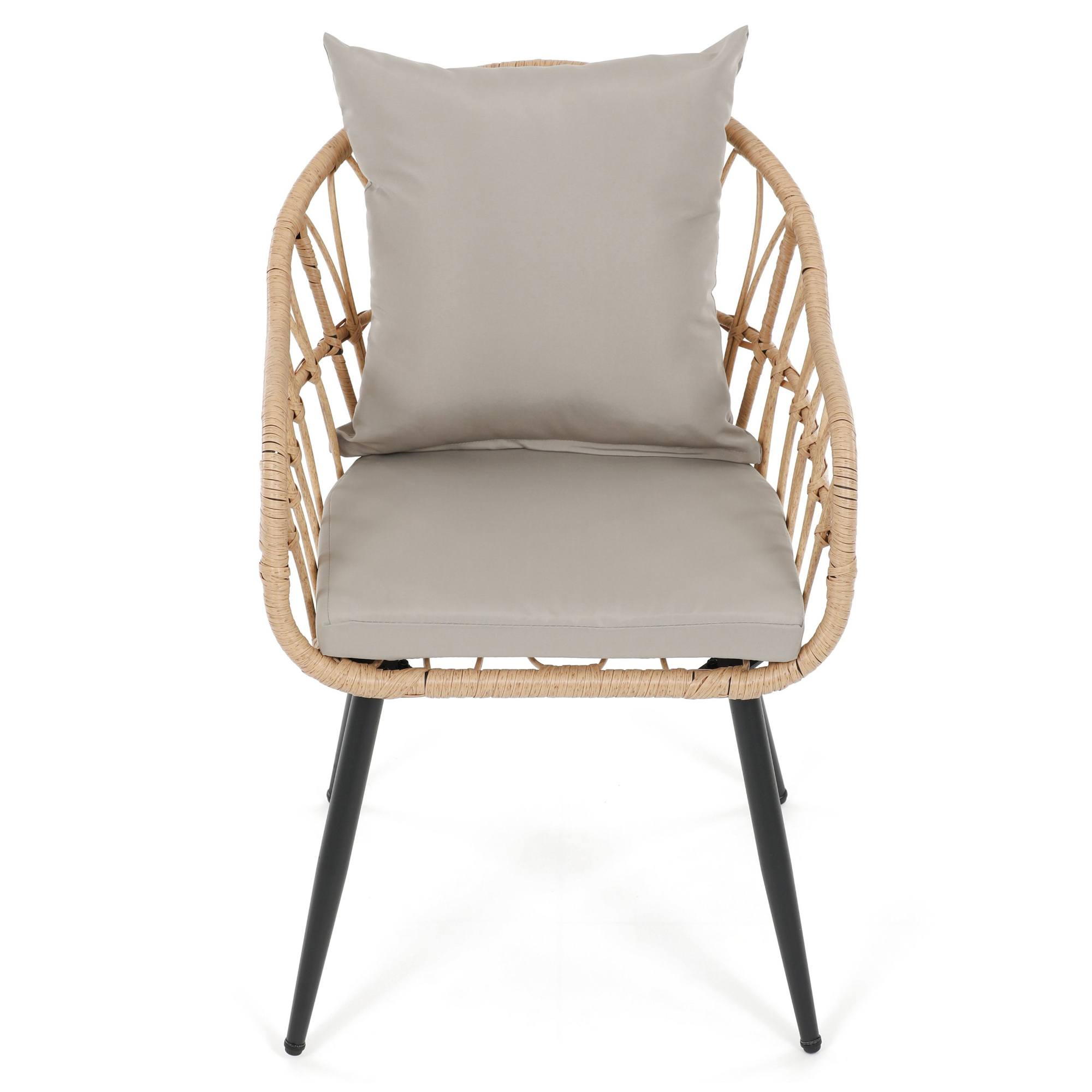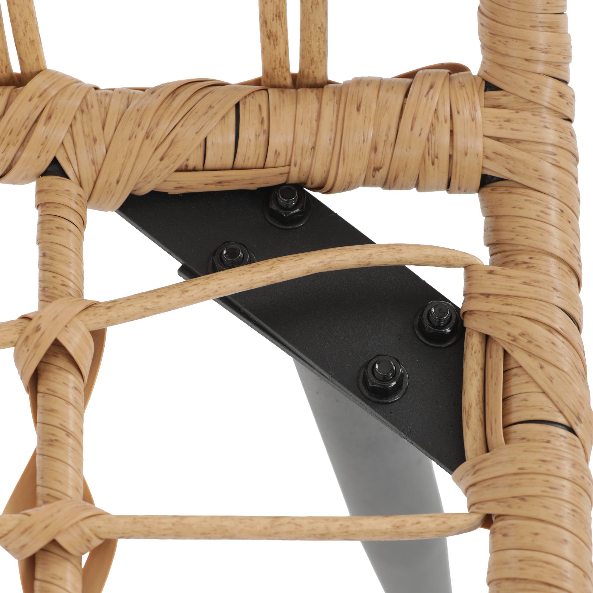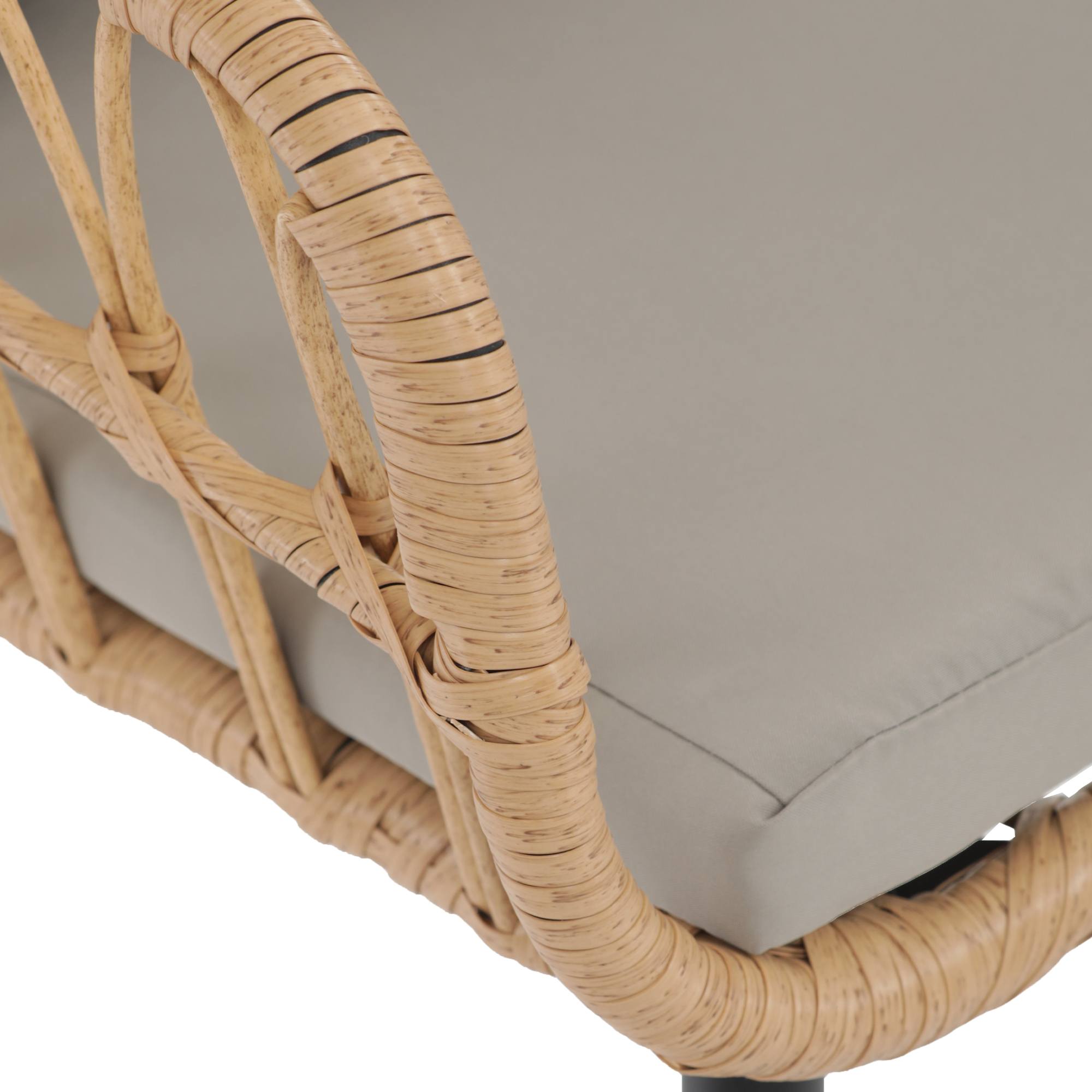 Jej stabilná konštrukcia je vyrobená z kovu a vypletaná polyratanom, ktorý zaisťuje odolnosť voči vonkajším podmienkam a zároveň dodáva stoličke príjemný prírodný vzhľad. Súčasťou stoličky je nielen mäkký sedák, ale aj vankúš. Sedák aj vankúš sú potiahnuté tkaninou príjemnou na dotyk.