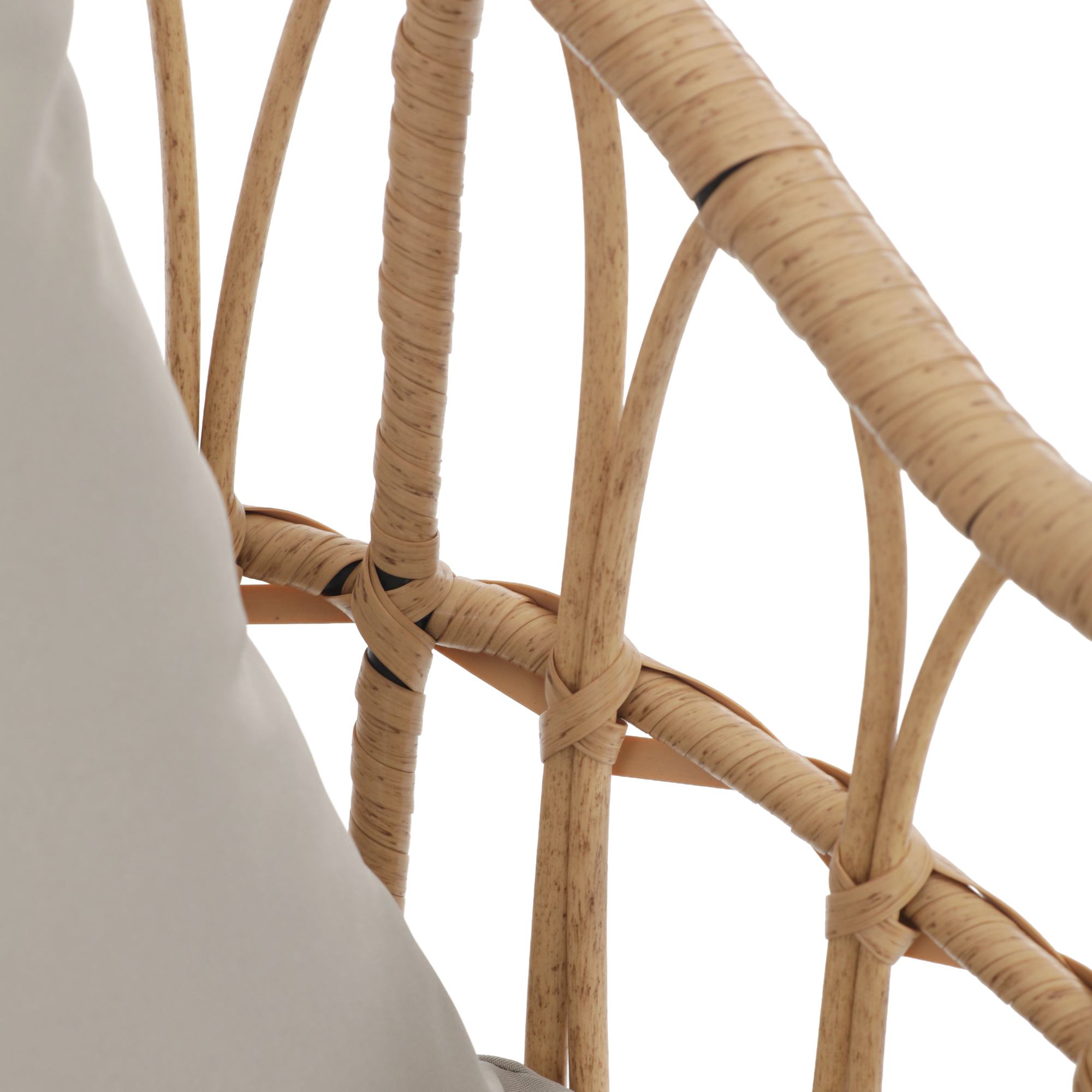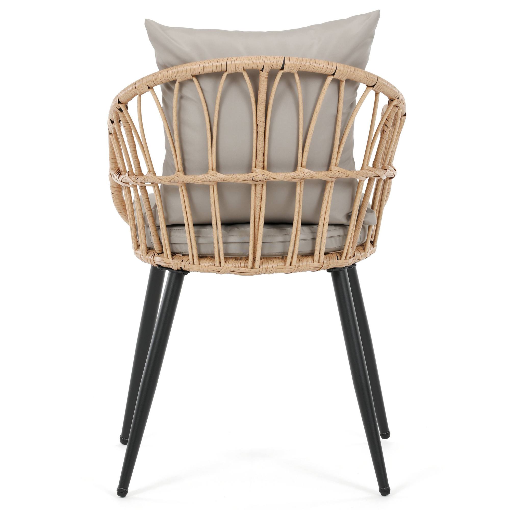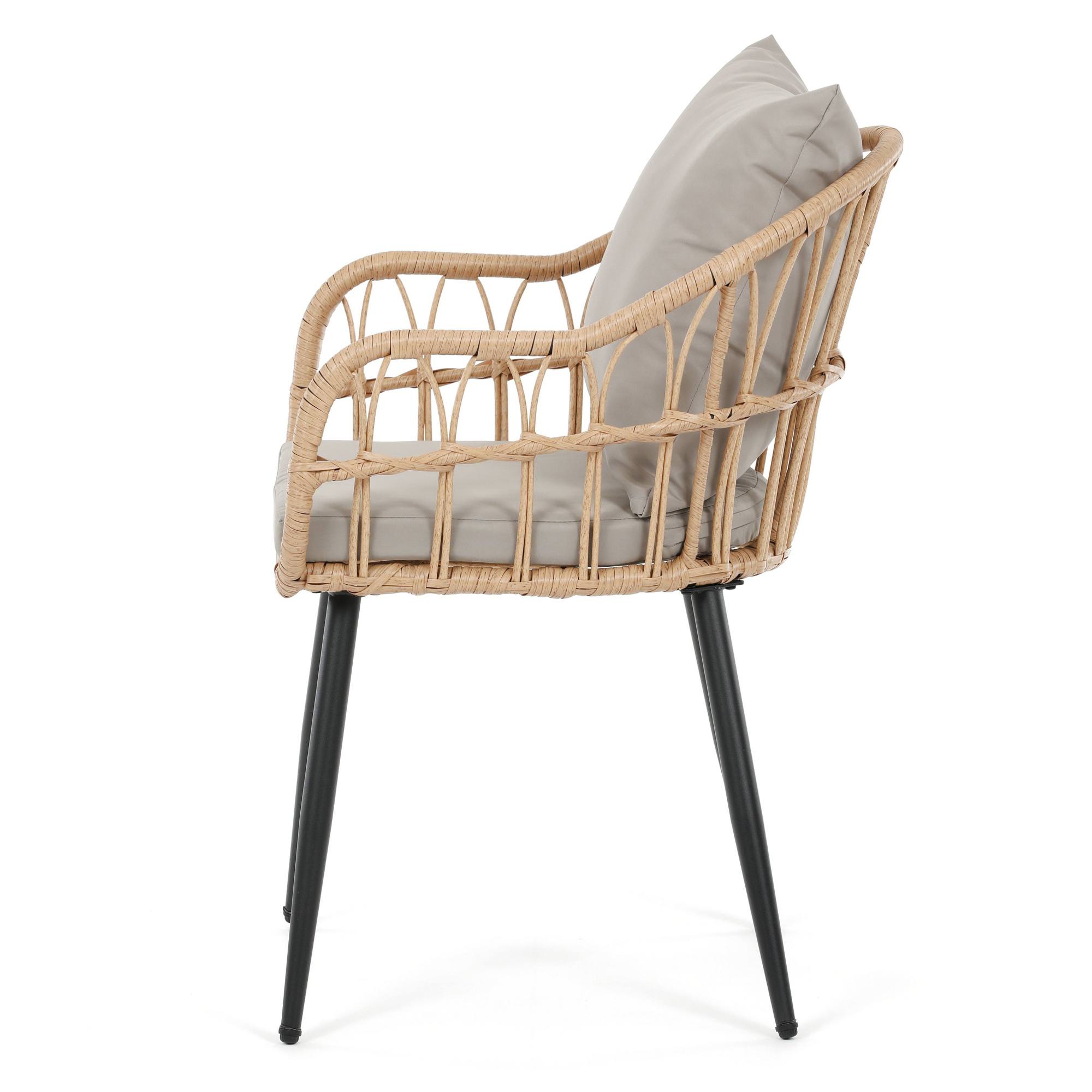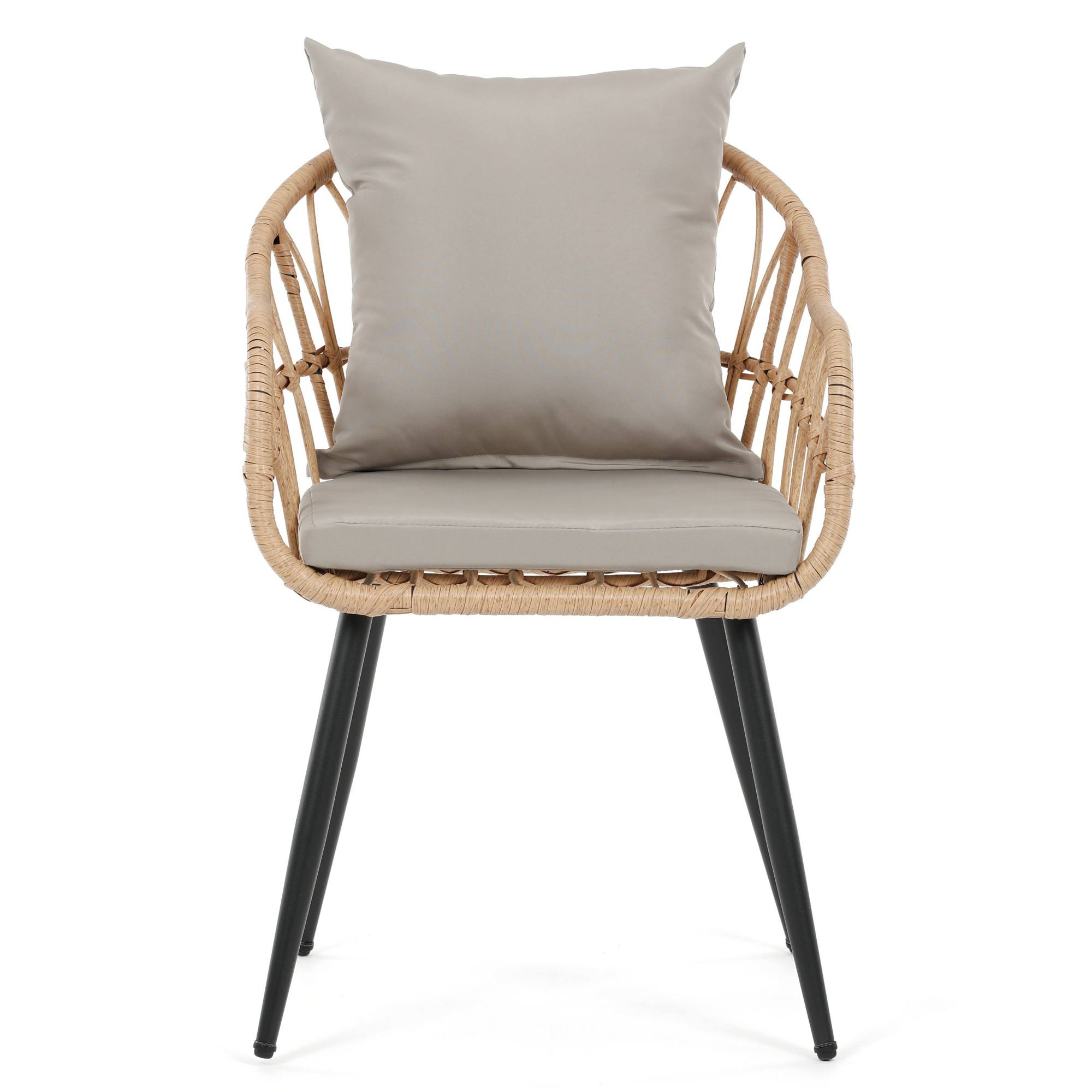 Jej stabilná konštrukcia je vyrobená z kovu a vypletaná polyratanom, ktorý zaisťuje odolnosť voči vonkajším podmienkam a zároveň dodáva stoličke príjemný prírodný vzhľad. Súčasťou stoličky je nielen mäkký sedák, ale aj vankúš. Sedák aj vankúš sú potiahnuté tkaninou príjemnou na dotyk.
