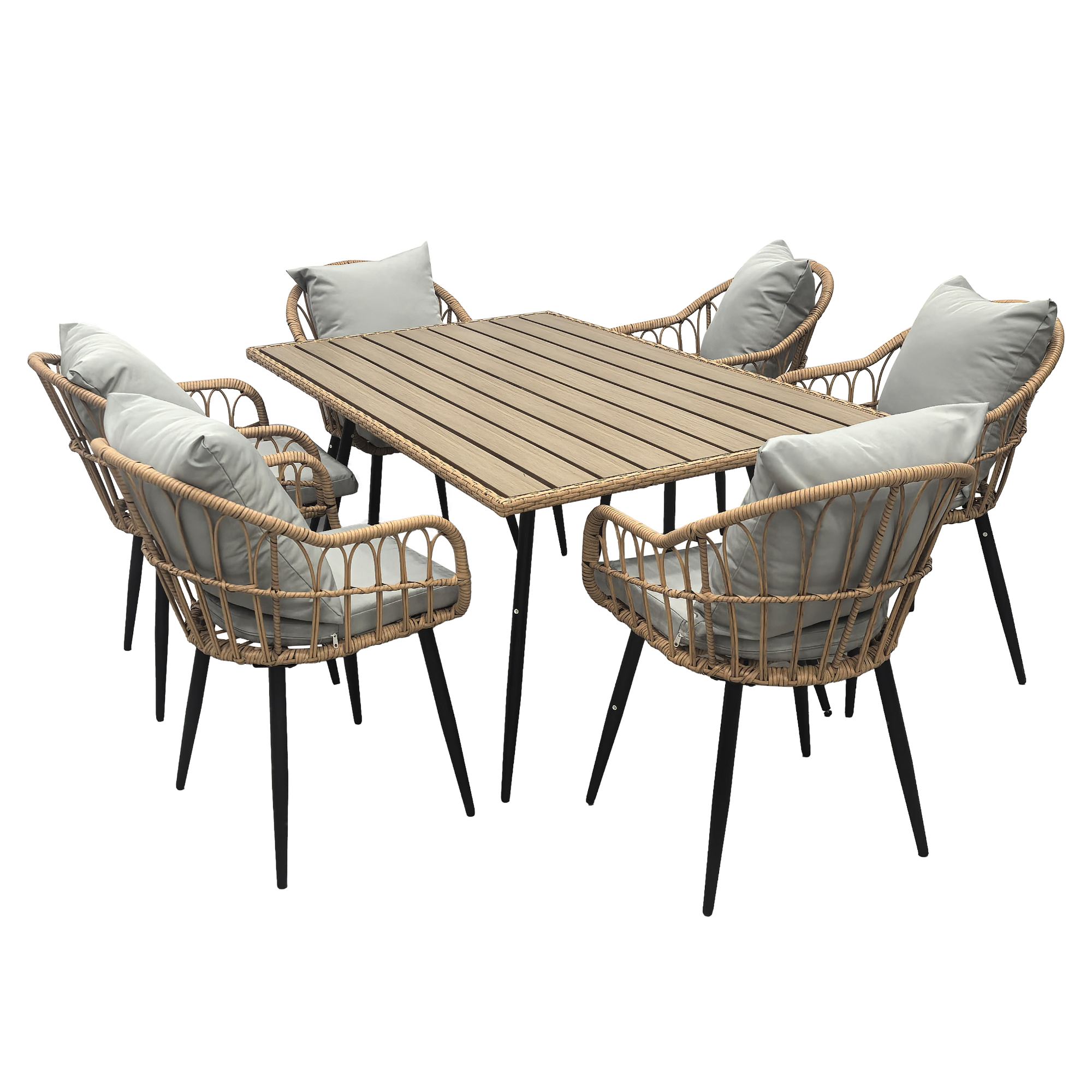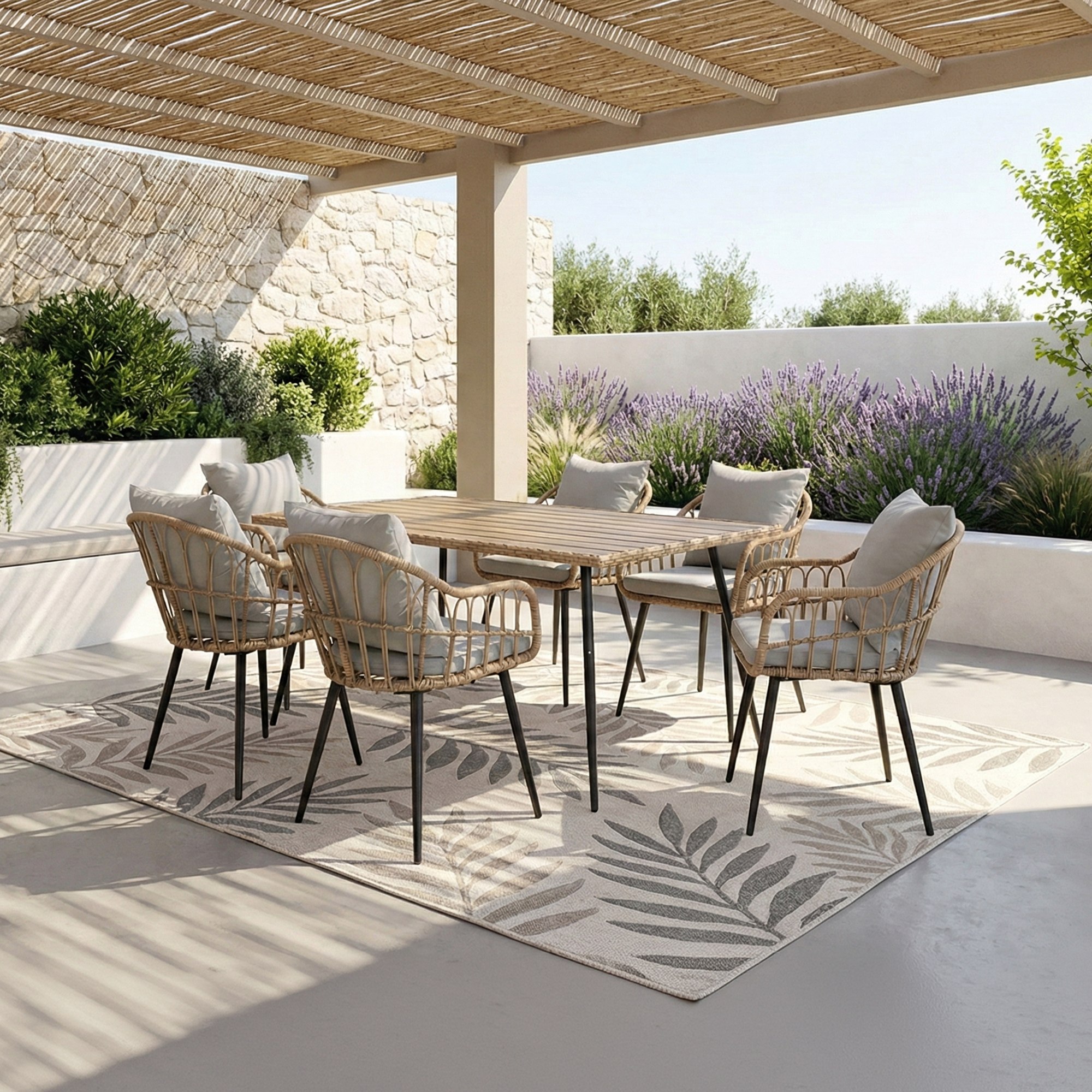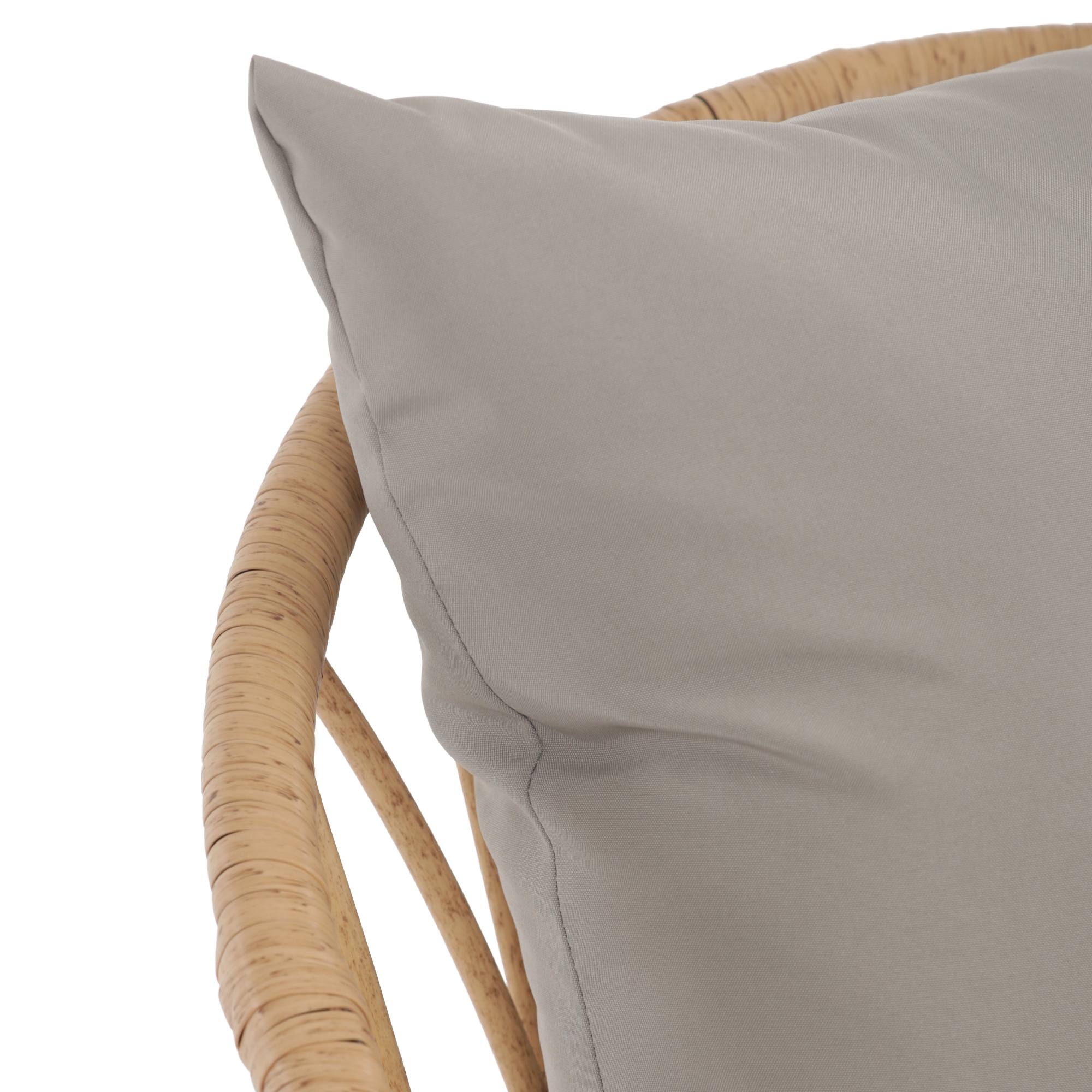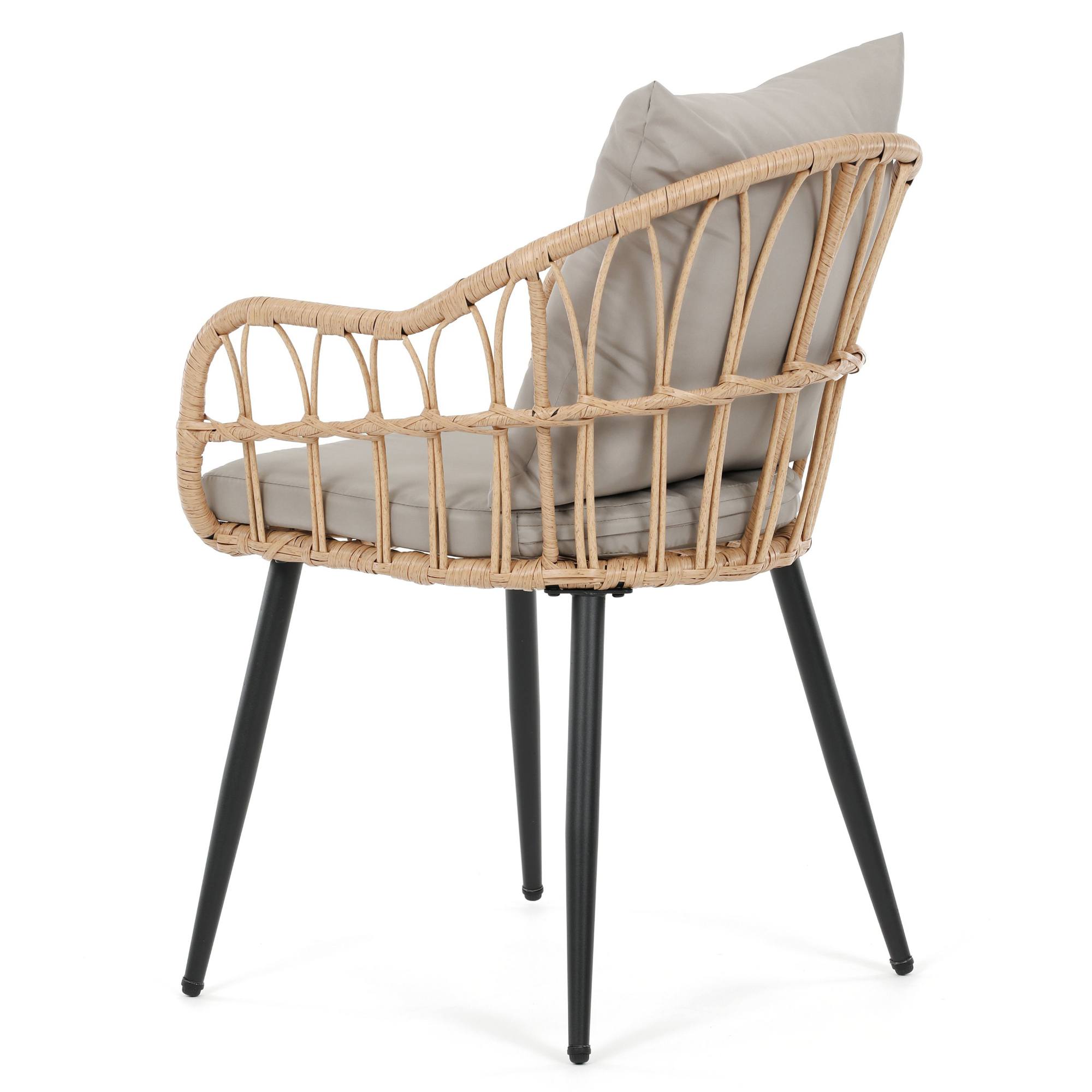 Jej stabilná konštrukcia je vyrobená z kovu a vypletaná polyratanom, ktorý zaisťuje odolnosť voči vonkajším podmienkam a zároveň dodáva stoličke príjemný prírodný vzhľad. Súčasťou stoličky je nielen mäkký sedák, ale aj vankúš. Sedák aj vankúš sú potiahnuté tkaninou príjemnou na dotyk.