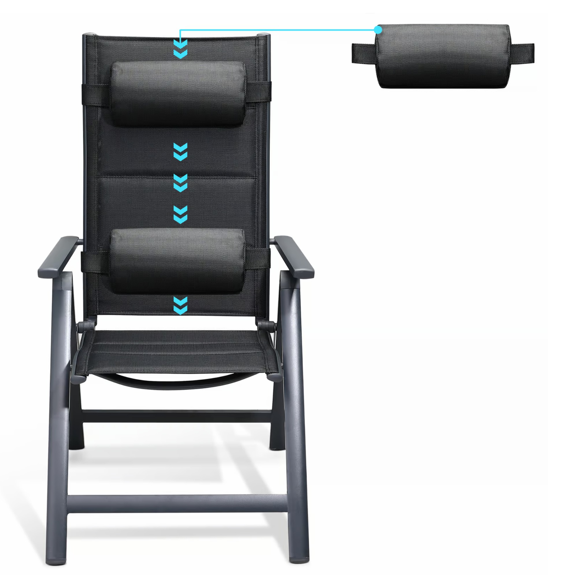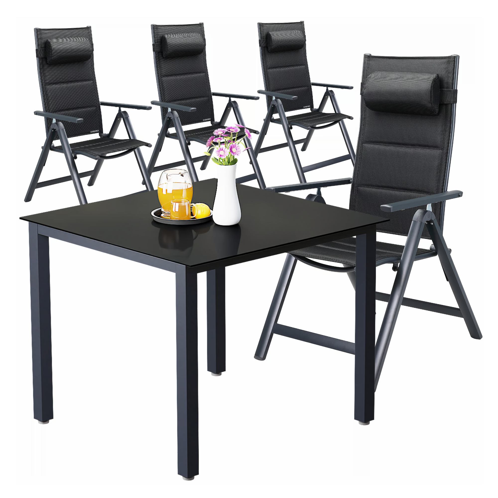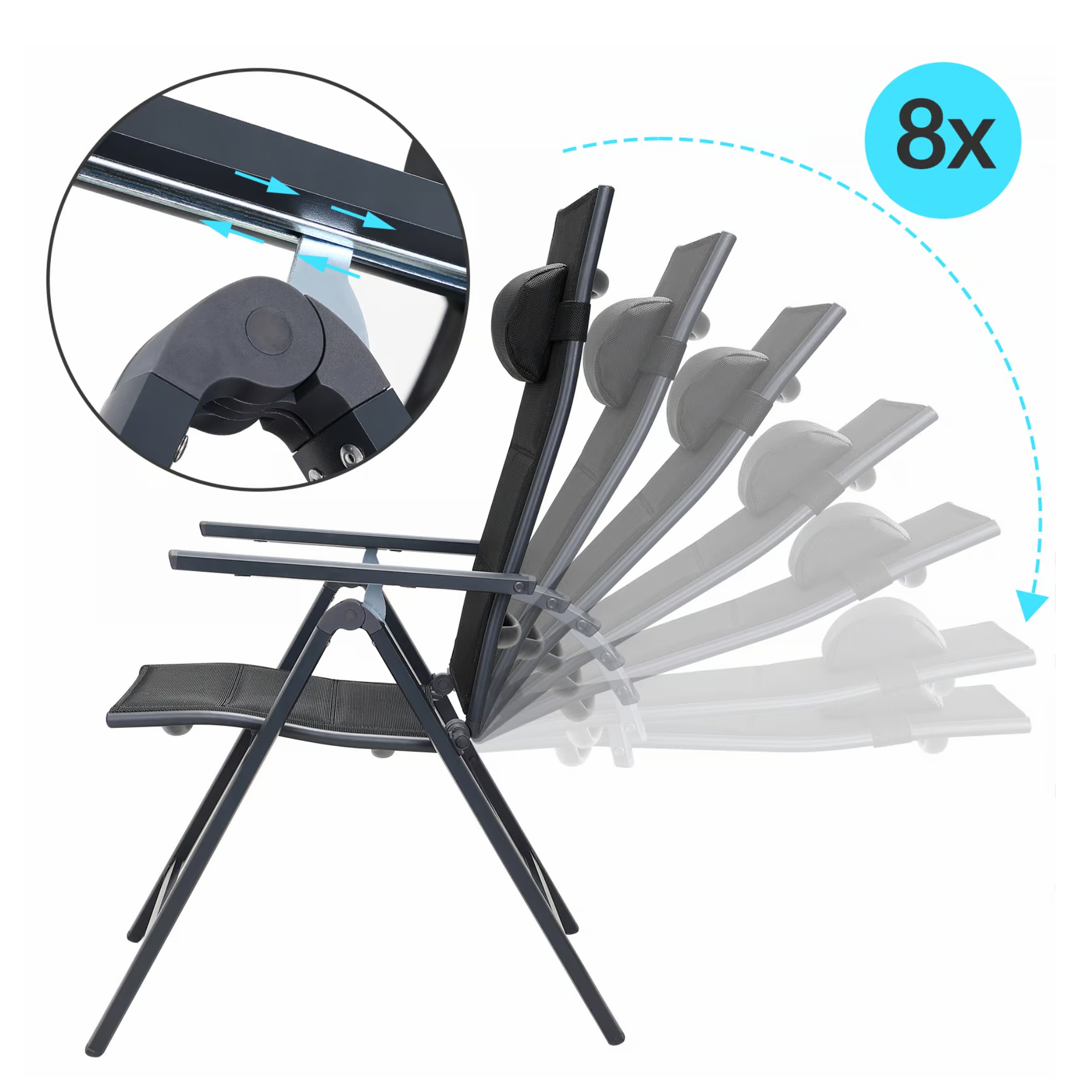 Tento nábytok má stabilnú hliníkovú konštrukciu, ktorá je opatrená práškovým nástrekom. Skrutky sú z nerezovej ocele. Operadlá stoličiek je možné nastaviť do 8 rôznych polôh, čo spoločne s podrúčkami a silným polstrovaním prispieva k pohodliu pri sedení. Súčasťou stoličiek, ktorých poťah je prateľný, je aj odnímateľný vankúš so zapínaním na suchý zips, ktorý je možné použiť ako pohodlnú opierku hlavy alebo ako podporný bedrový vankúš. Nohy stoličiek sú vybavené plastovými chráničmi podlahy. Stoličky sú skladacie, čo oceníte najmä pri ich skladovaní.