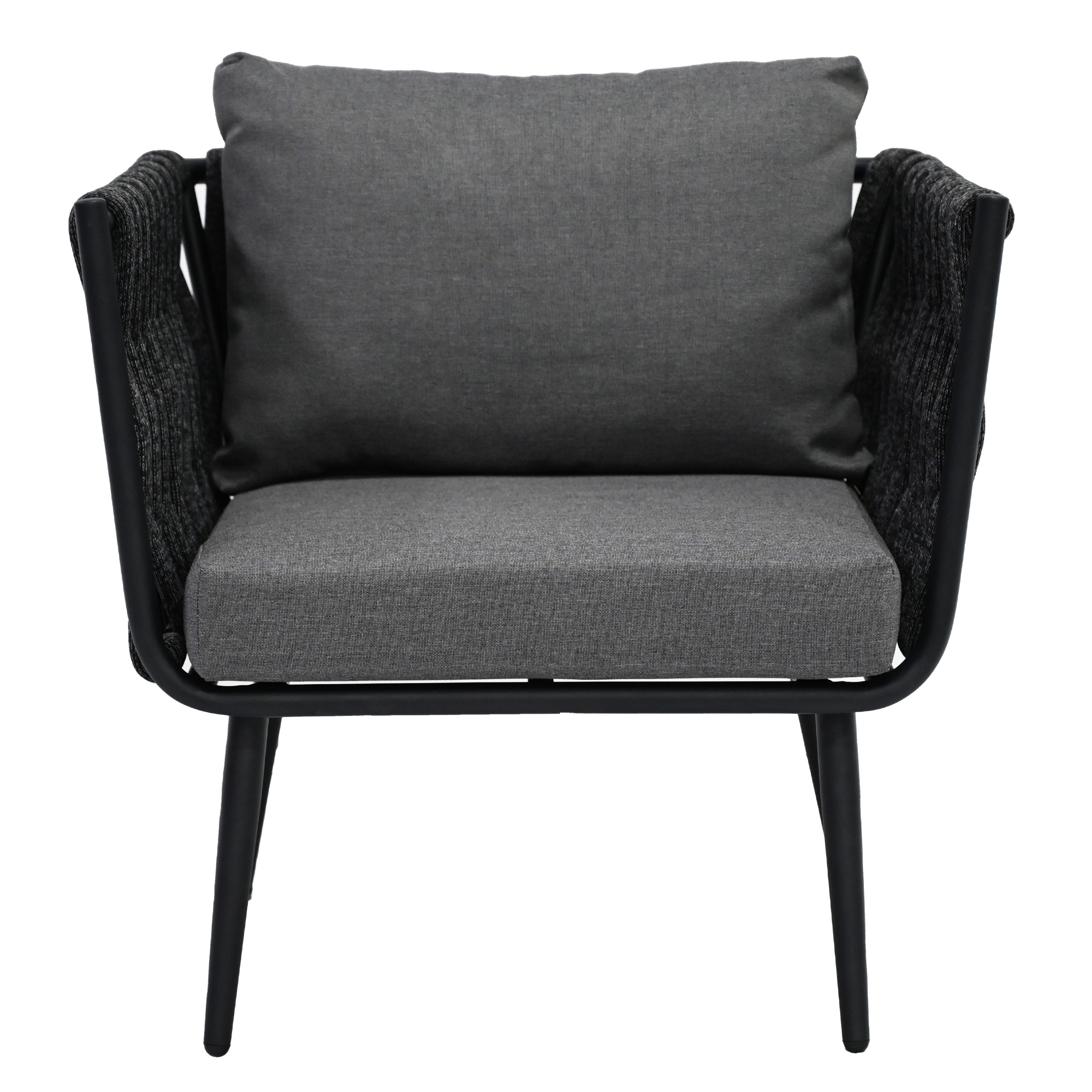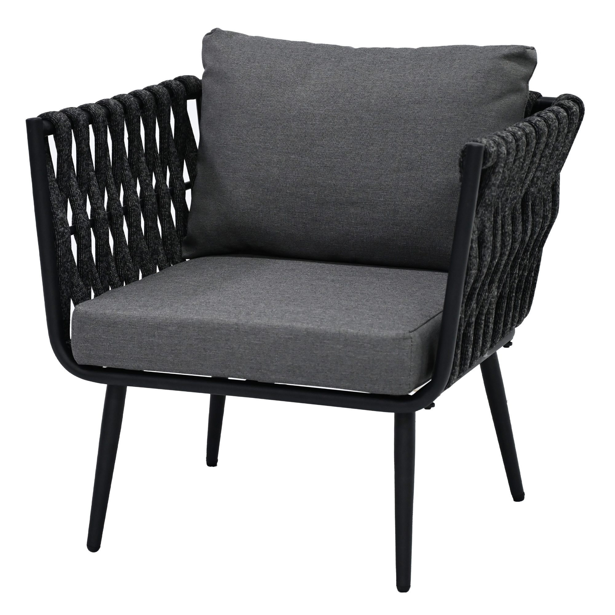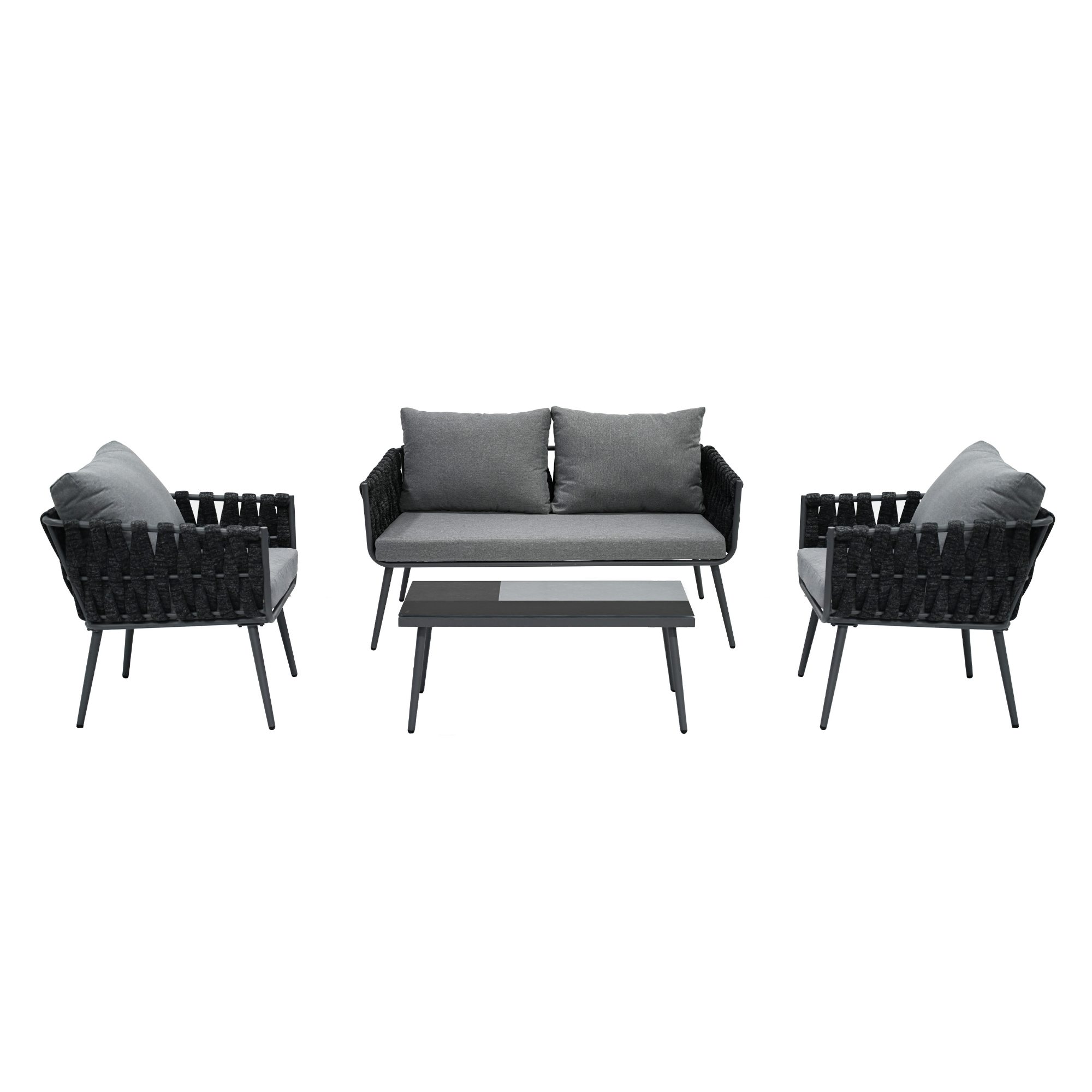 Moderná záhradná zostava CINDRA sa skladá z 2 kresiel, dvojsedačky a stolíka.