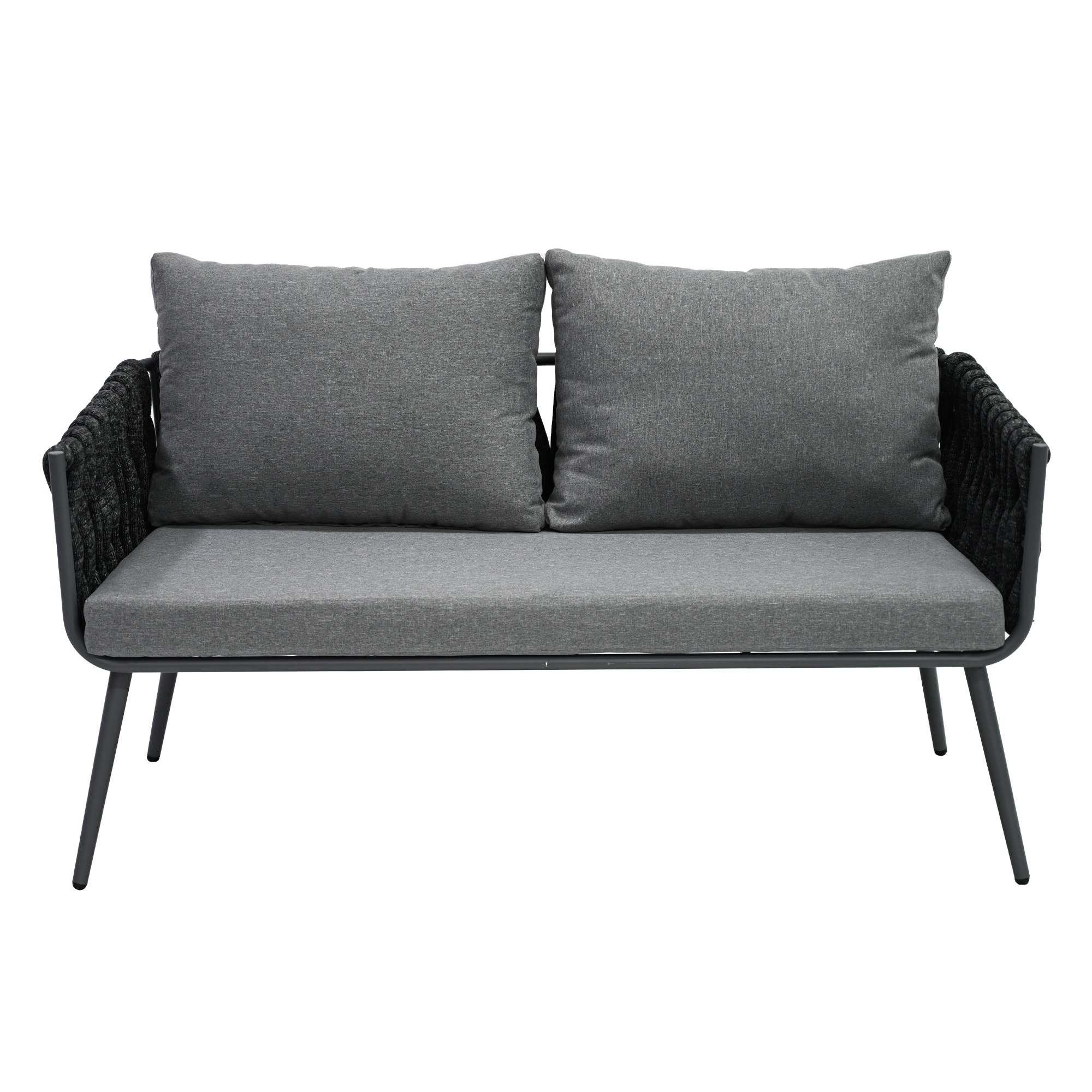 Nábytok má pevnú a stabilnú konštrukciu, ktorá je vyrobená z kovu. Sedenie na kreslách a dvojsedačke je príjemné a pohodlné nielen vďaka mäkkým penovým sedákom, ale aj vďaka podrúčkam a vankúšom. Horná doska stolíka je z tvrdeného skla.