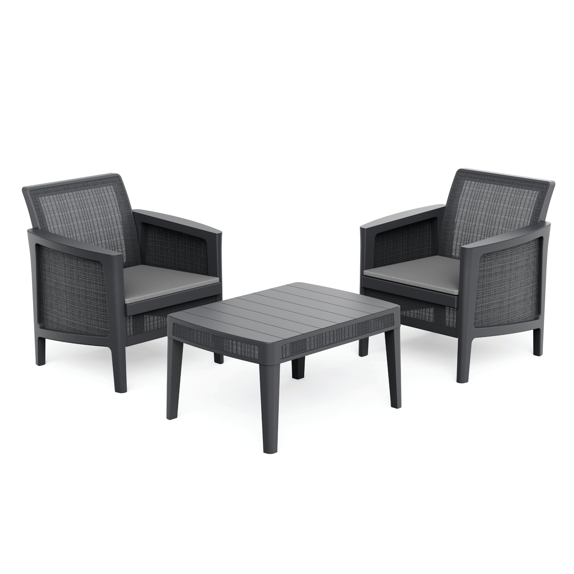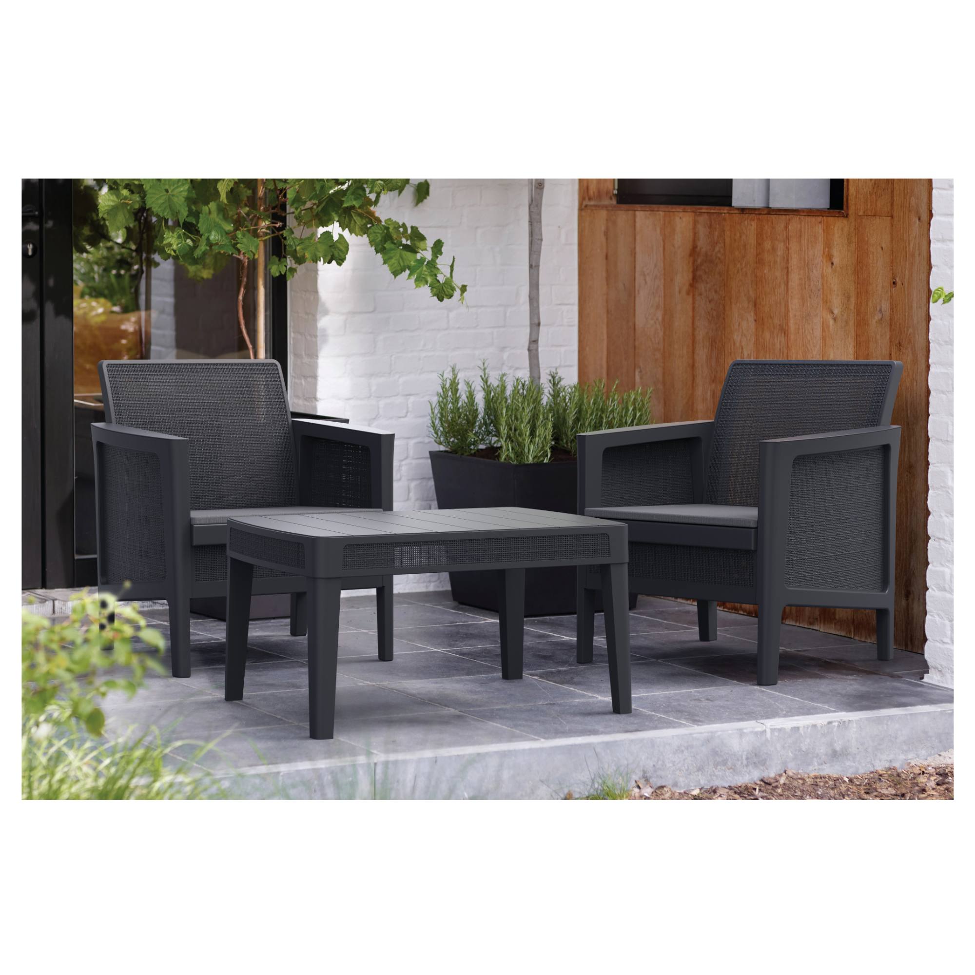 Zostava sa skladá zo stolíka a 2 kresiel. Nábytok má pevnú a stabilnú konštrukciu, ktorá je vyrobená z kvalitných plastových materiálov. K pohodliu pri sedení prispievajú nielen mäkké sedáky, ale aj praktické podrúčky.