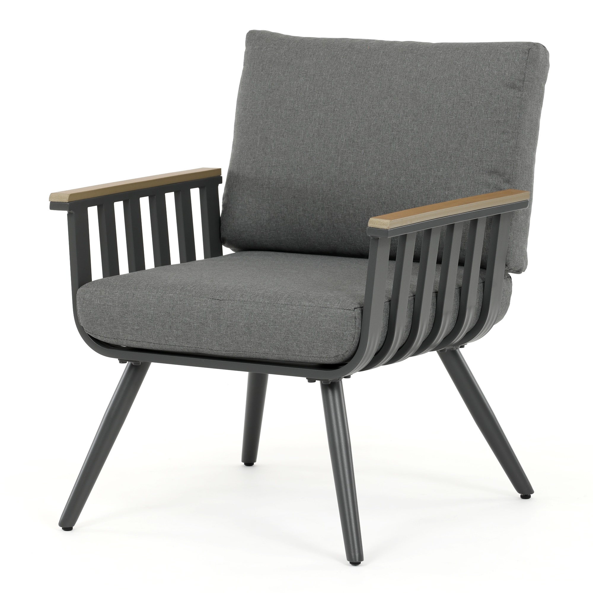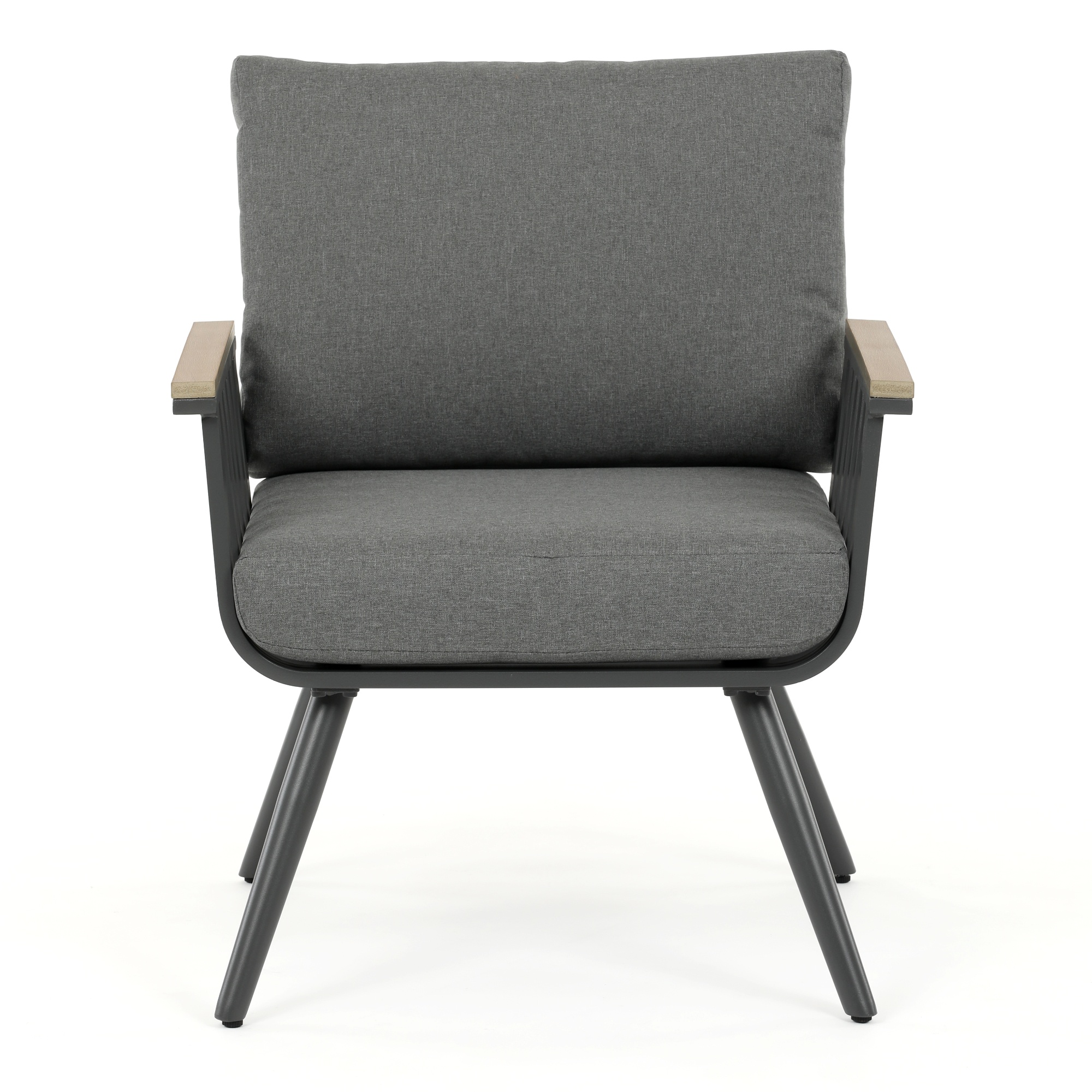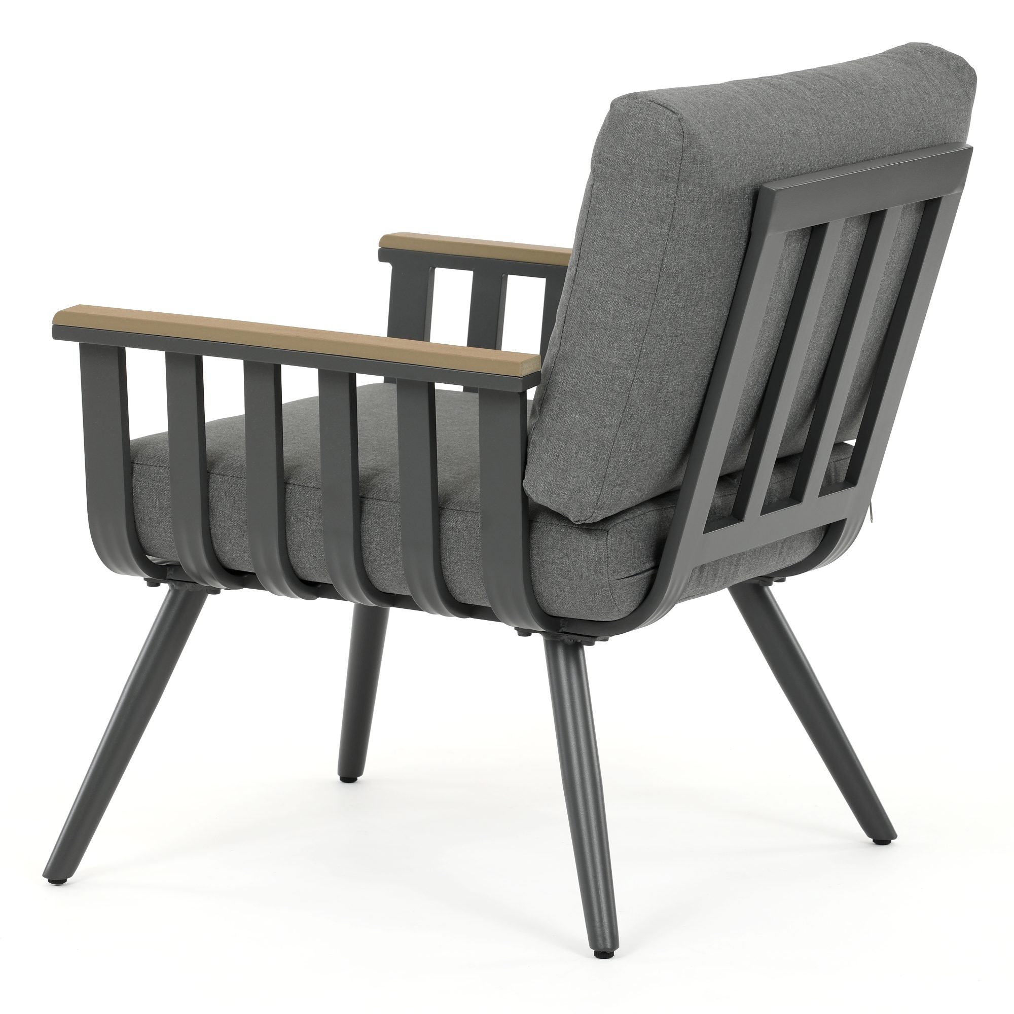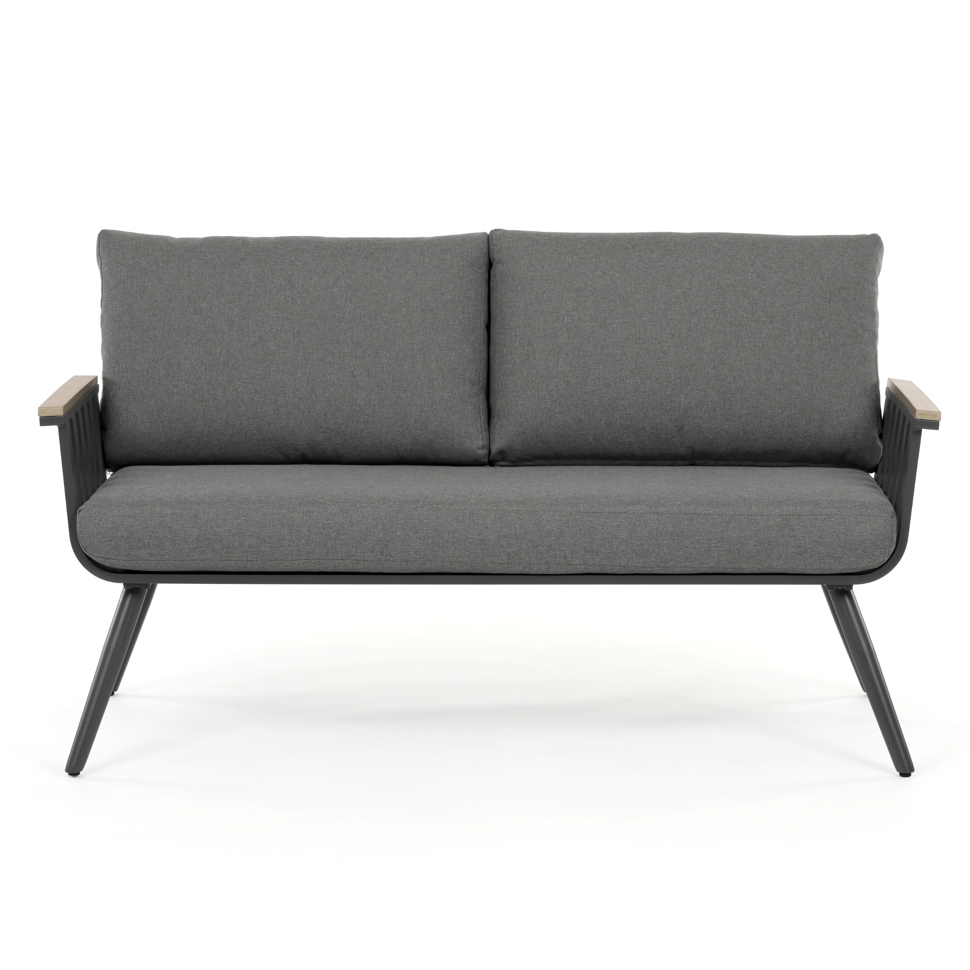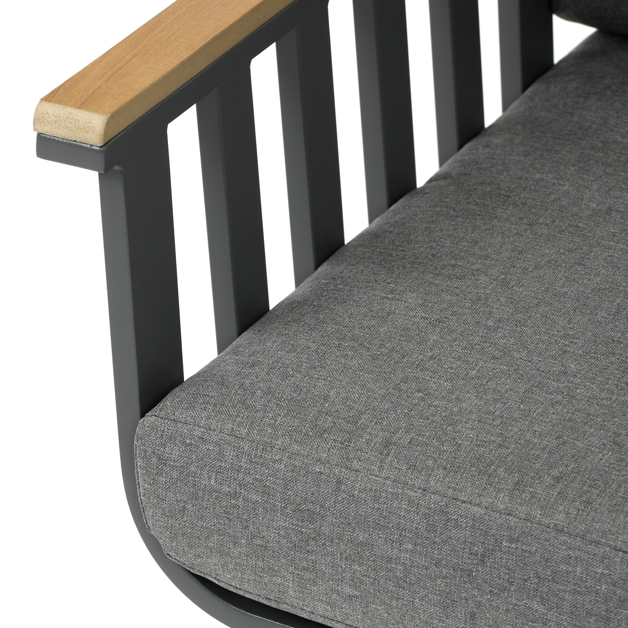 Nábytok má pevnú a stabilnú konštrukciu, ktorá je vyrobená z hliníka. Horná doska stolíka je z tvrdeného skla. Sedenie na kreslách a dvojmiestnej pohovke je príjemné a pohodlné nielen vďaka mäkkým penovým sedákom a operadlám potiahnutým hladkou tkaninou, ale aj vďaka područkám z polywoodu.