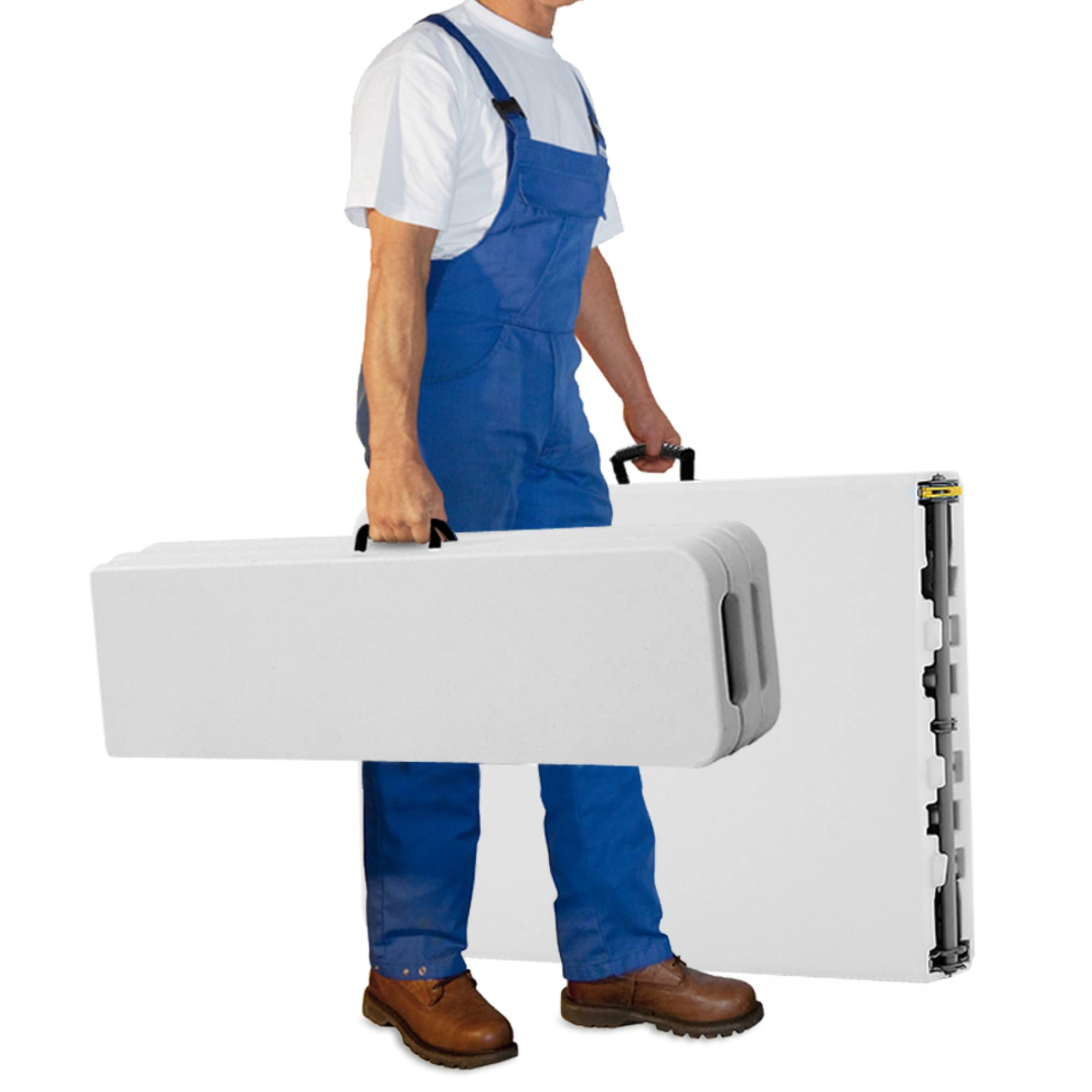 Pretože je zostava skladacia, nezaberie pri skladovaní zbytočne veľa miesta. Vďaka bočným rukovätiam a nízkej hmotnosti sa v zloženom stave tiež ľahko prepravuje.