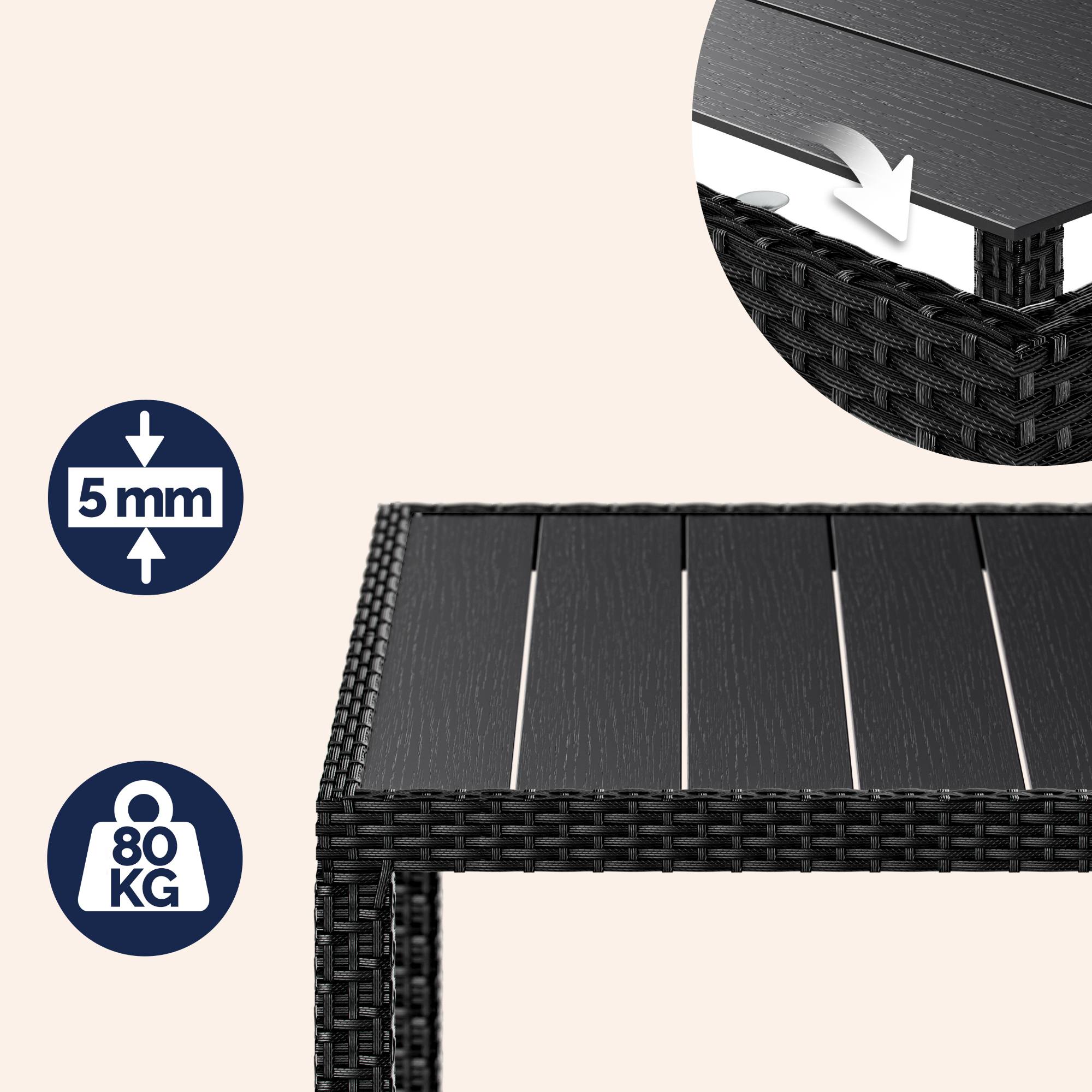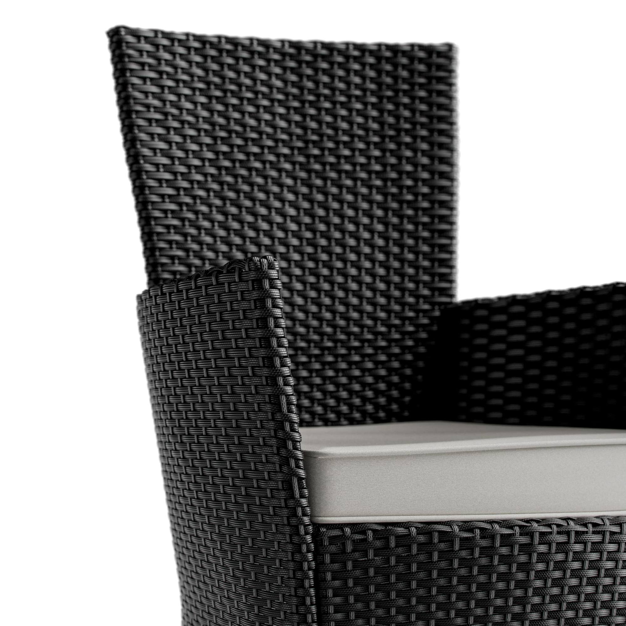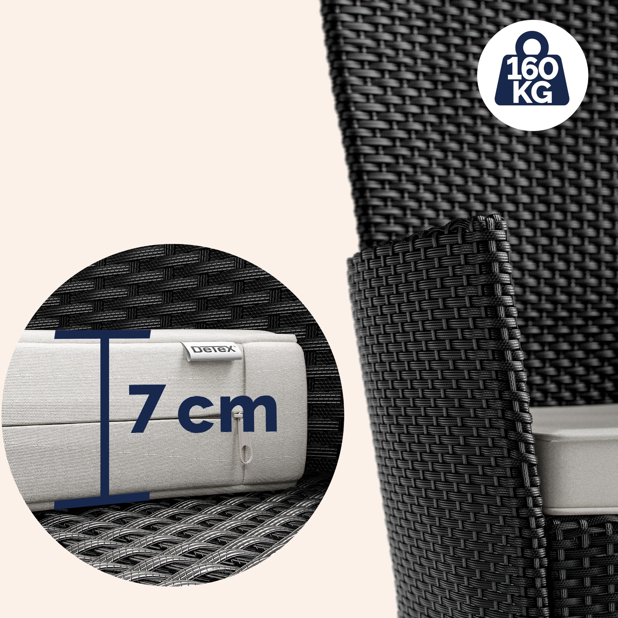 Pevná a stabilná konštrukcia tohto nábytku je vyrobená z ocele ** a ** opletená polyratanom **. Nohy stola i kresiel sú zakončené **nastaviteľnými skrutkami, vďaka ktorým bude zostava stabilná aj na nerovnom povrchu. Horná doska stola je z ľahko udržovateľného materiálu WPC, ktorý je tvorený kombináciou drevitej hmoty a plastu. O pohodlné sedenie sa starajú nielen podrúčky, ale aj mäkké penové sedáky s hrúbkou 7 cm. Tie majú vodoodpudivé poťahy so zipsom, ktoré je možné v prípade znečistenia ľahko zložiť a vyprať v práčke na 30 °C.