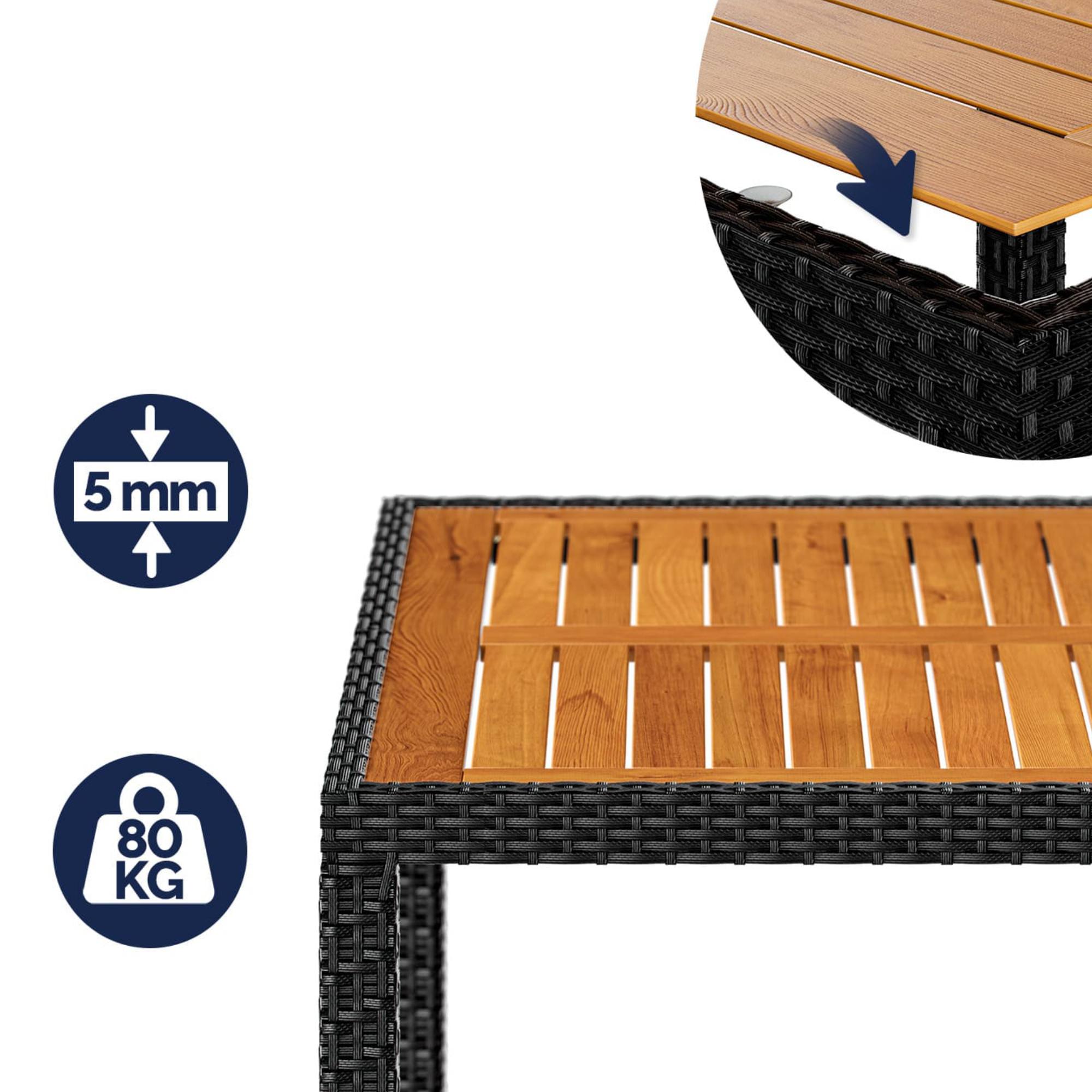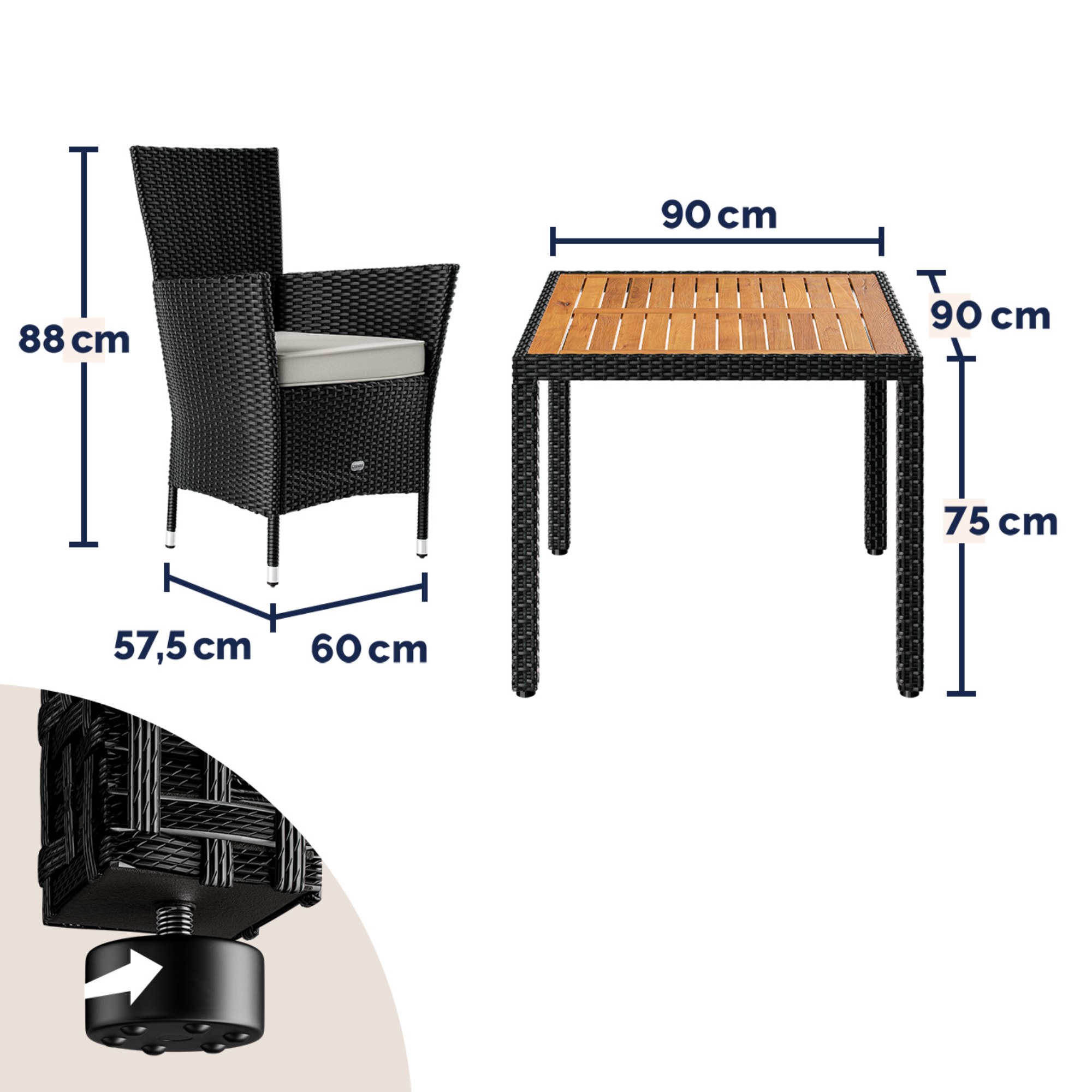 Pevná a stabilná konštrukcia tohto nábytku je vyrobená z práškovo lakovanej ocele a opletená polyratanom. Nohy stola i kresiel sú zakončené nastaviteľnými skrutkami, vďaka ktorým bude zostava stabilná aj na nerovnom povrchu. Horná doska stola je z masívneho akáciového dreva. O pohodlné sedenie sa starajú nielen podrúčky, ale aj mäkké penové sedáky s hrúbkou 7 cm. Tie majú poťahy so zipsom, ktoré je možné v prípade znečistenia ľahko zložiť a vyprať v práčke na 30 °C.