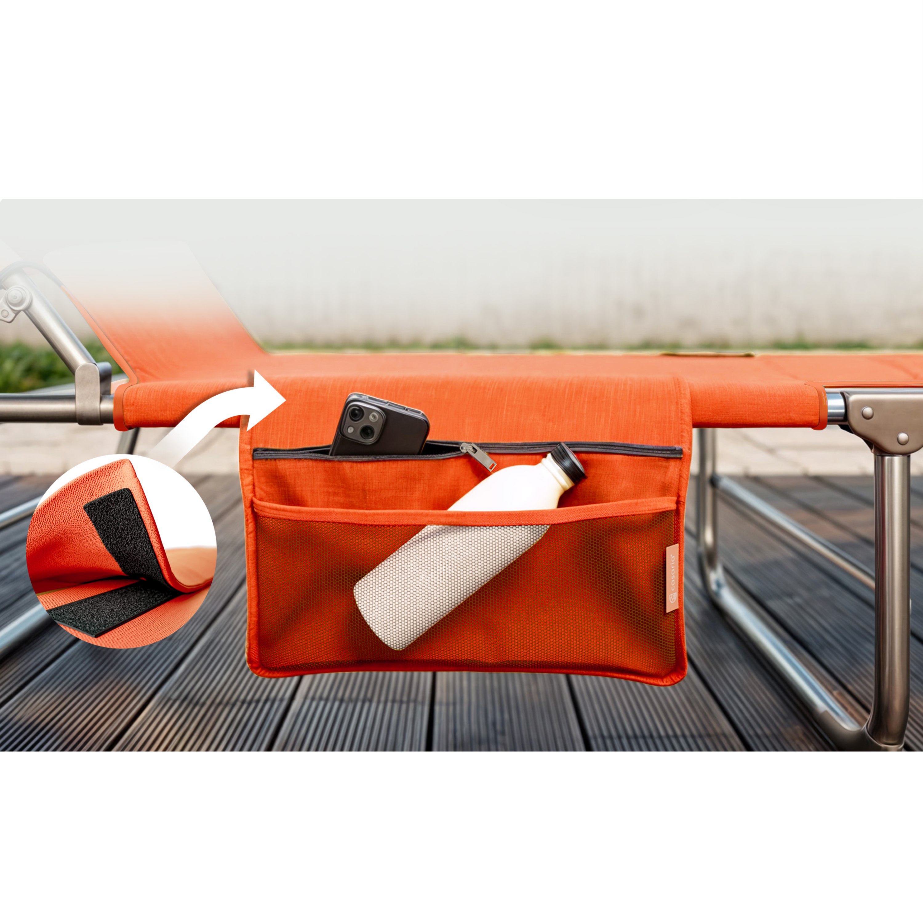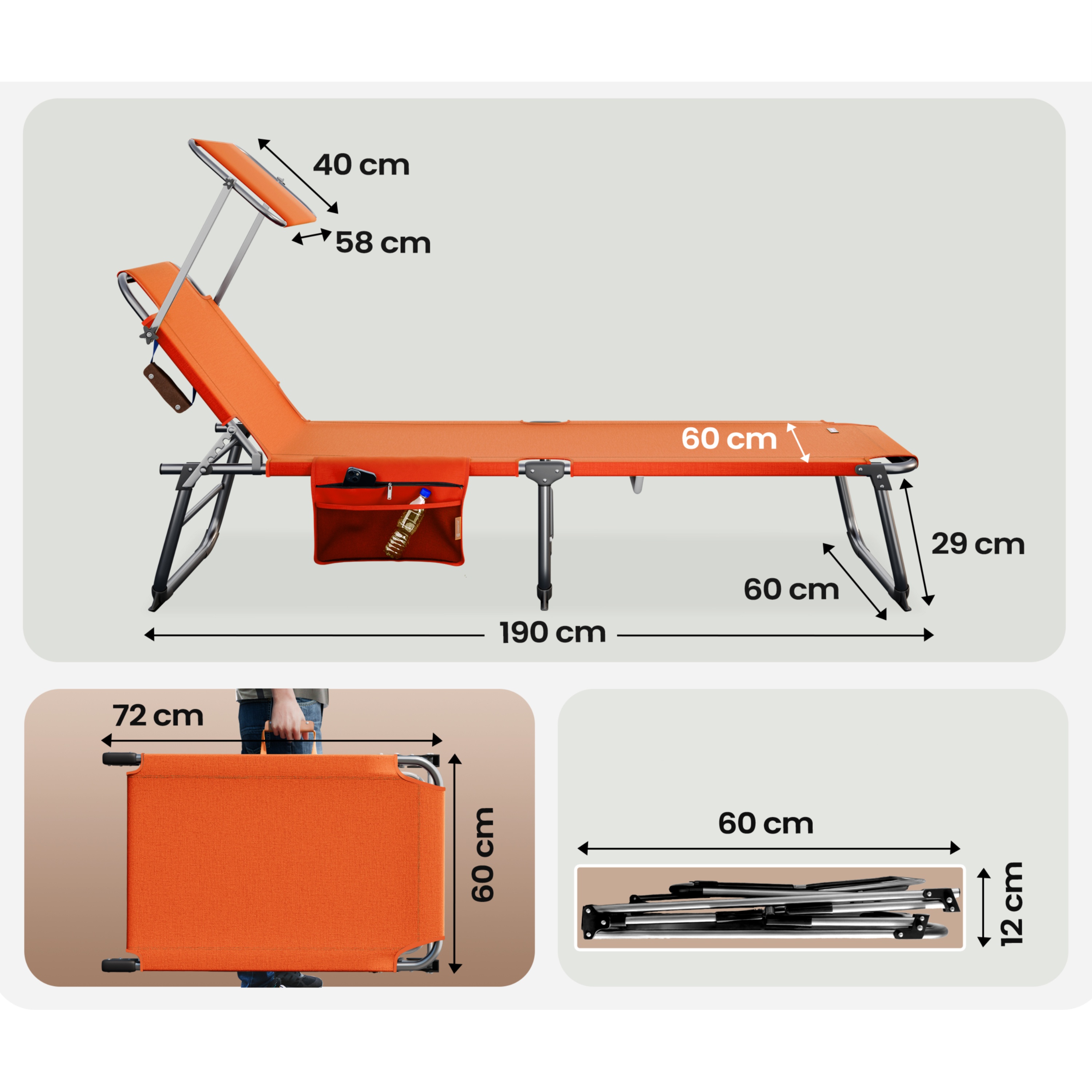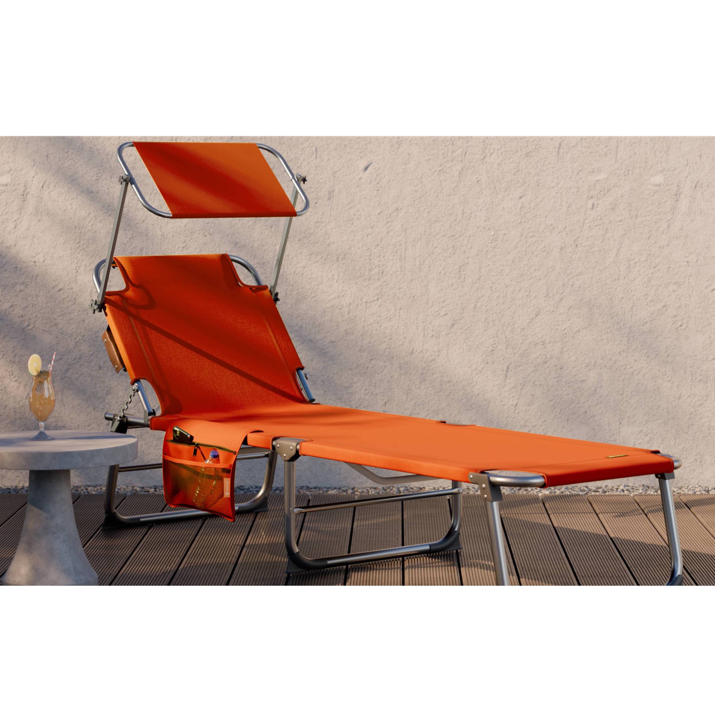 Veľkorysá ležacia plocha s rozmermi 190x60 cm poskytuje dostatok miesta na pohodlné ležanie. Operadlo je možné nastaviť do 4 rôznych polôh, takže si jednoducho nájdete ideálnu pozíciu na odpočinok, čítanie alebo opaľovanie. Ležadlo je navyše vybavené plynule nastaviteľnou slnečnou clonou, ktorá poskytuje príjemný tieň počas horúcich dní. Praktickým detailom je aj odnímateľné bočné vrecko s priehradkou na zips a sieťovanou časťou, kam si môžete uložiť telefón, okuliare alebo opaľovací krém, aby ste ich mali vždy po ruke.