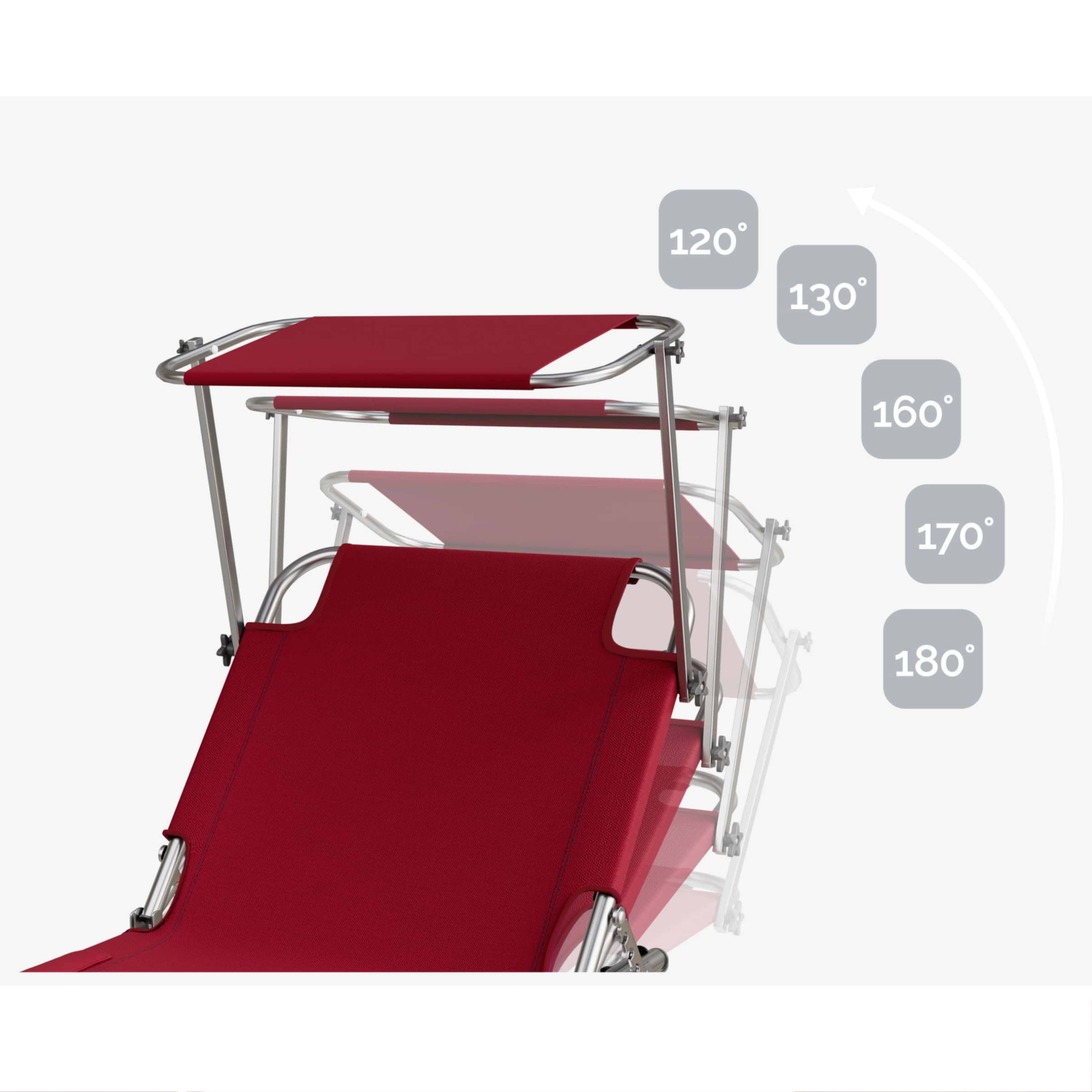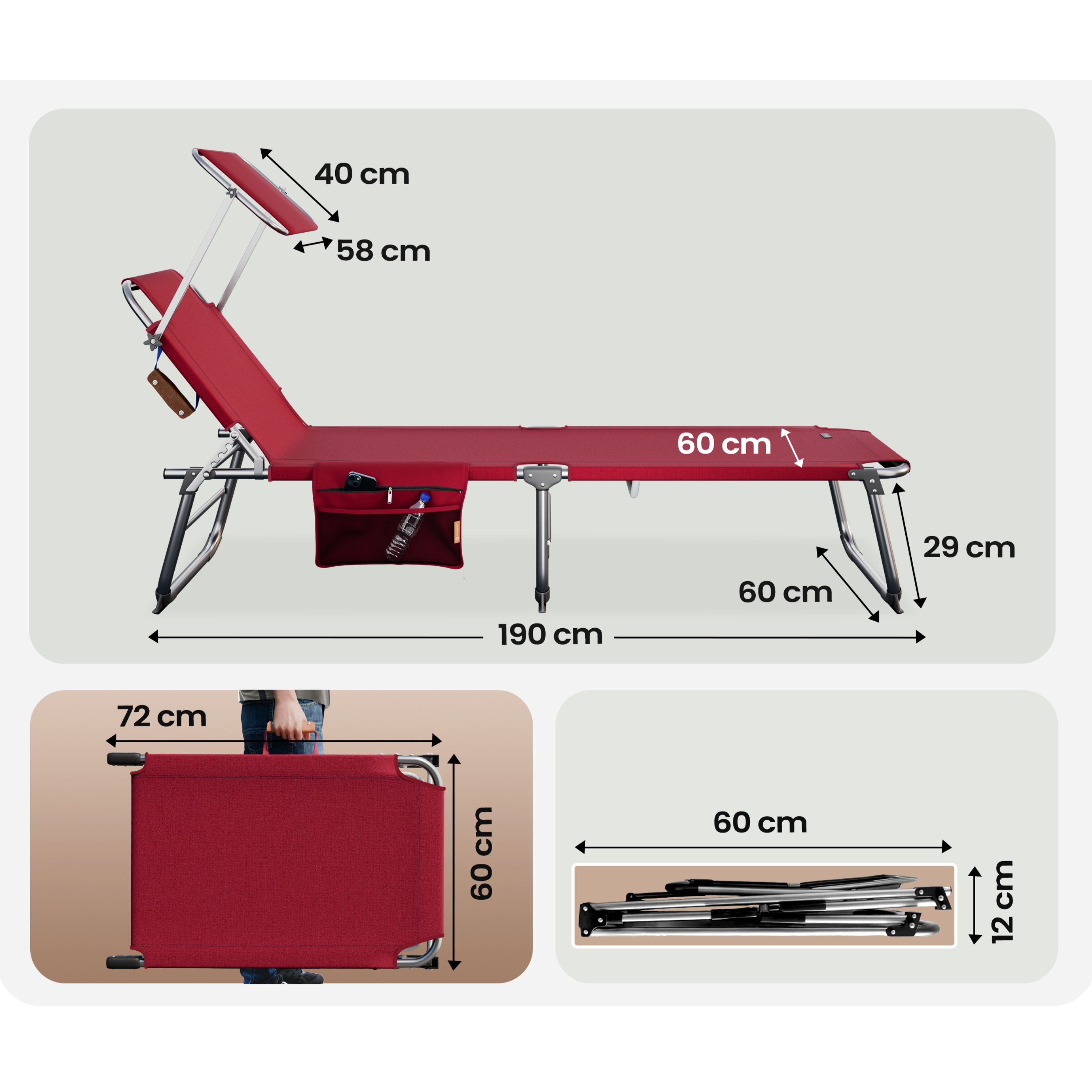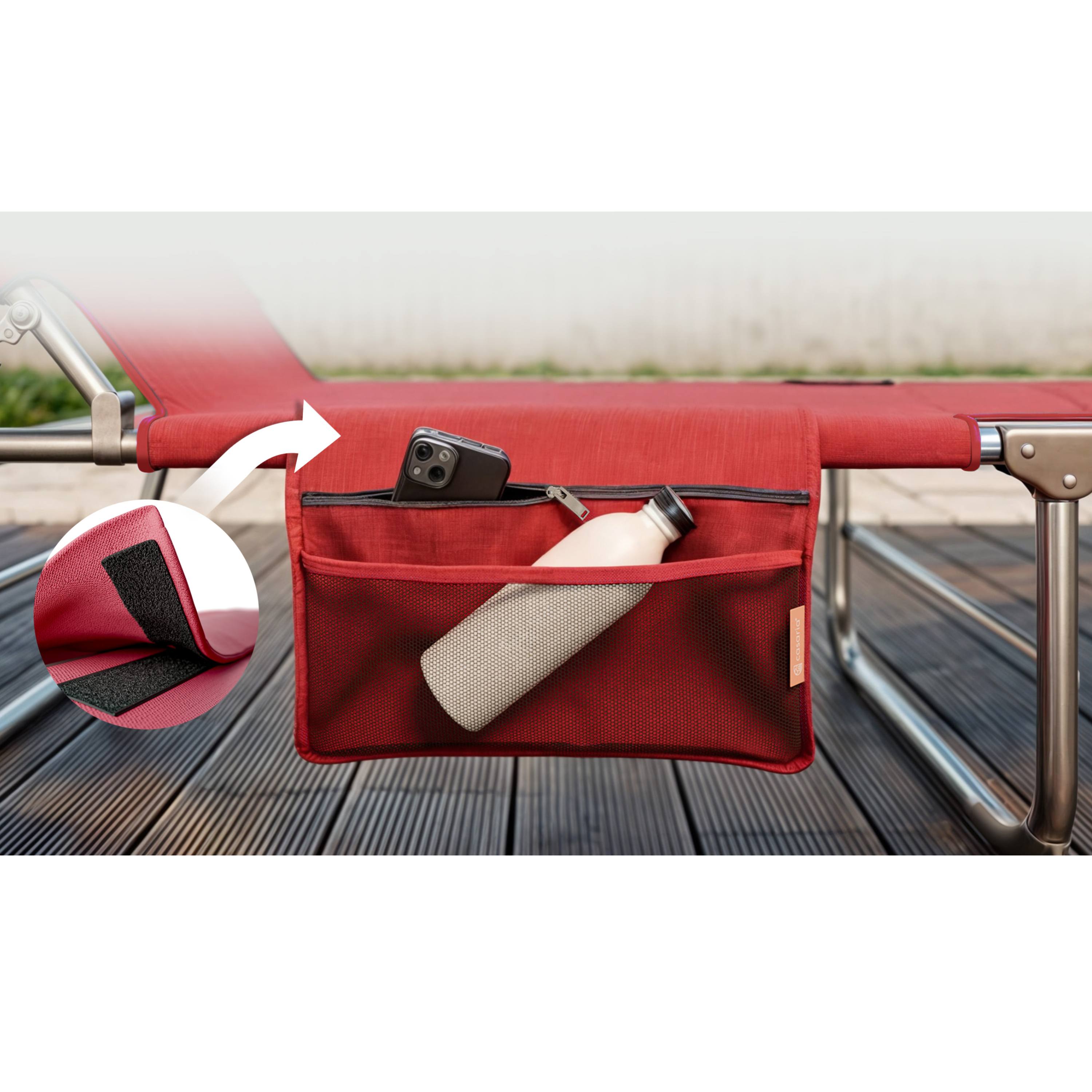 Veľkorysá ležacia plocha s rozmermi 190x60 cm poskytuje dostatok miesta na pohodlné ležanie. Operadlo je možné nastaviť do 4 rôznych polôh, takže si jednoducho nájdete ideálnu pozíciu na odpočinok, čítanie alebo opaľovanie. Ležadlo je navyše vybavené plynule nastaviteľnou slnečnou clonou, ktorá poskytuje príjemný tieň počas horúcich dní. Praktickým detailom je aj odnímateľné bočné vrecko s priehradkou na zips a sieťovanou časťou, kam si môžete uložiť telefón, okuliare alebo opaľovací krém, aby ste ich mali vždy po ruke.