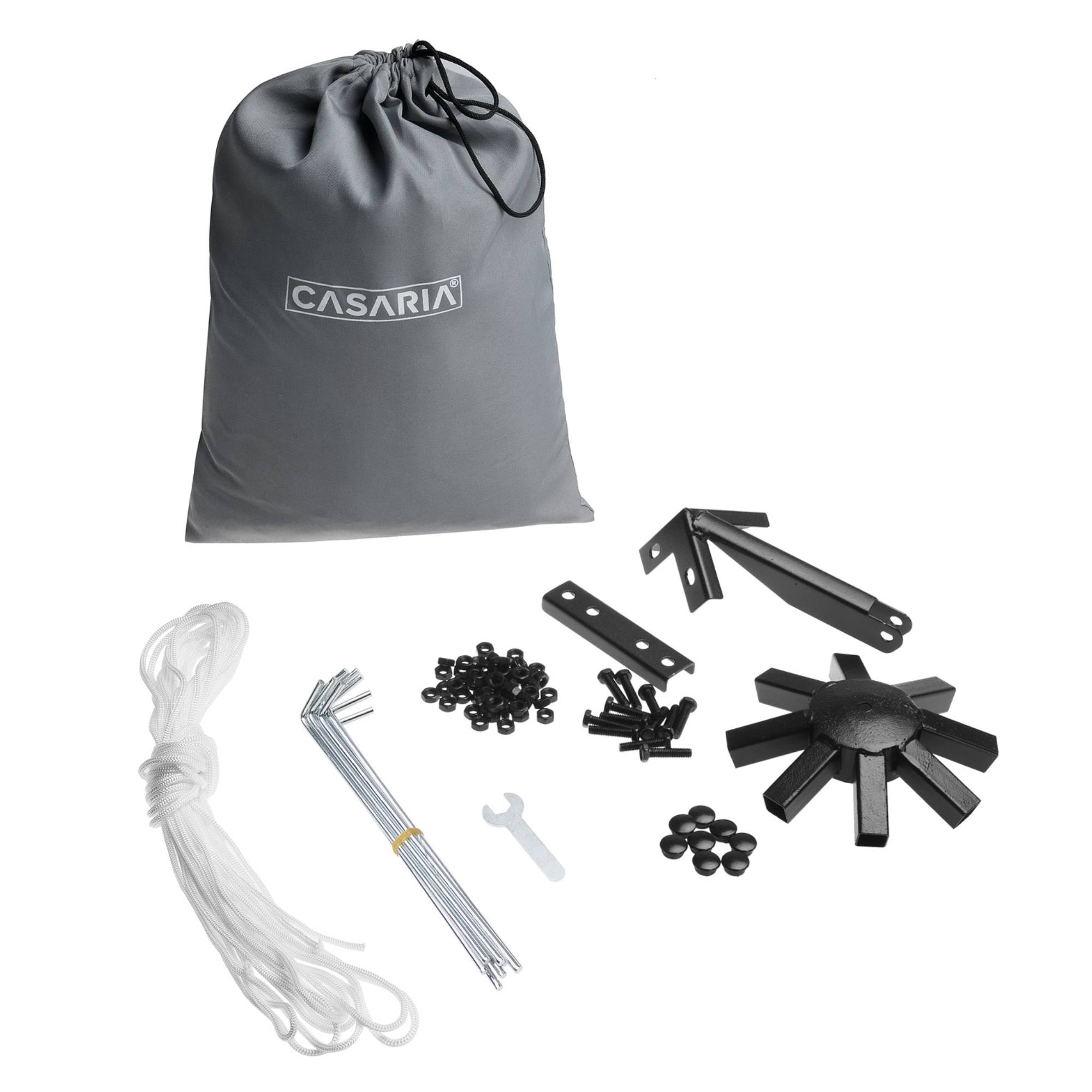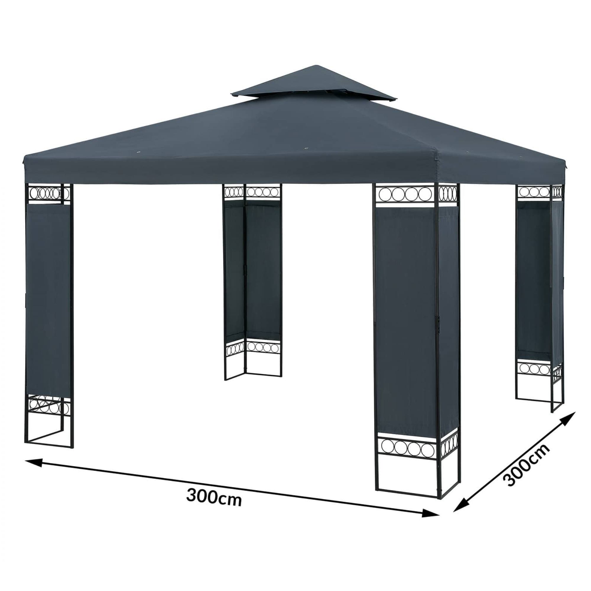 Stabilná oceľová konštrukcia s rozmermi 3x3 m a výškou 2,7 m poskytuje dostatok priestoru pre vašich hostí. Je opatrená práškovým lakom, ktorý chráni pred koróziou. Pevné uchytenie altánu umožňuje ukotvenie pomocou kolíkov a lán.