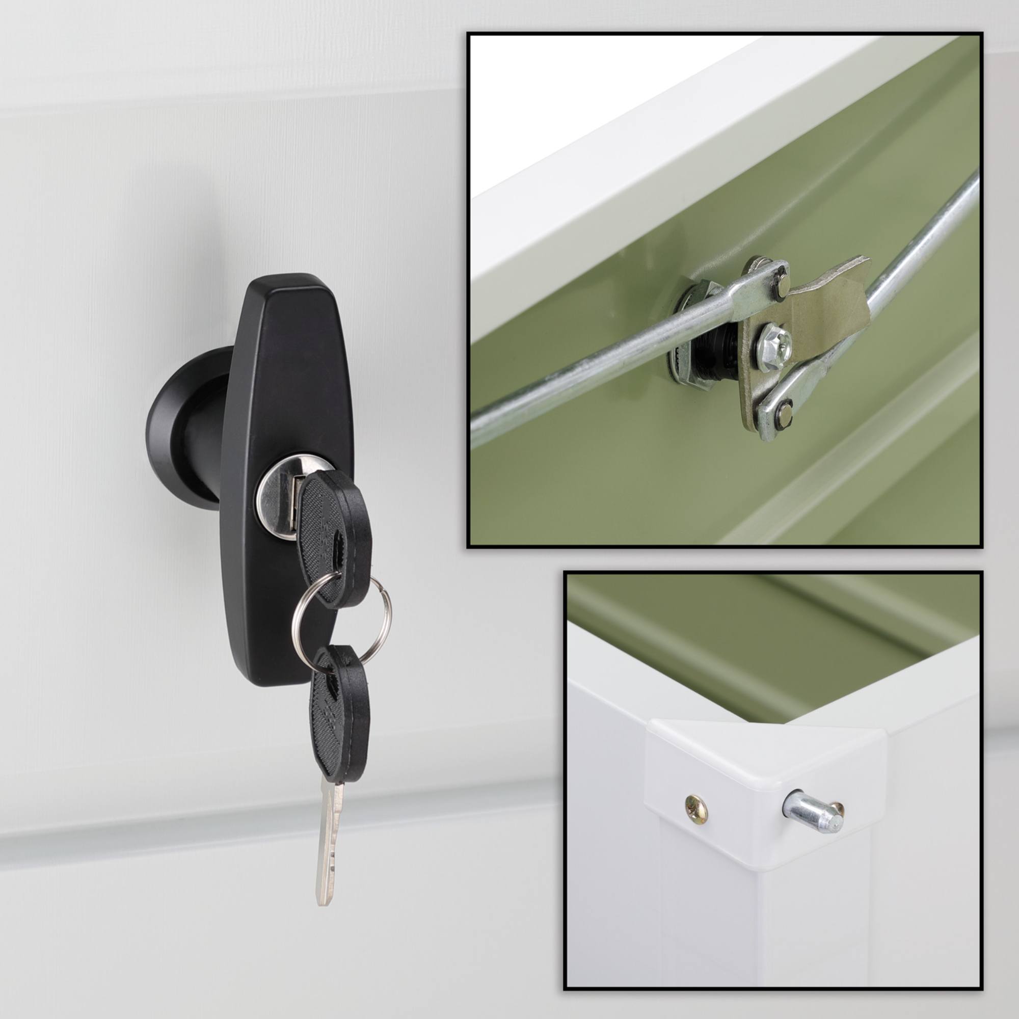 Je vyrobený z pozinkovaného oceľového plechu, ktorý zabezpečuje ochranu proti hrdzi, UV žiareniu aj poveternostným vplyvom. S objemom 385 l a nosnosťou základne 100 kg ponúka dostatok úložného priestoru na vankúše, náradie či hračky. Veko s nosnosťou 60 kg je vybavené piestami, ktoré uľahčujú manipuláciu. Vyvýšené nohy chránia obsah pred vlhkosťou a integrovaný zámok na kľúč ho uchová v bezpečí.