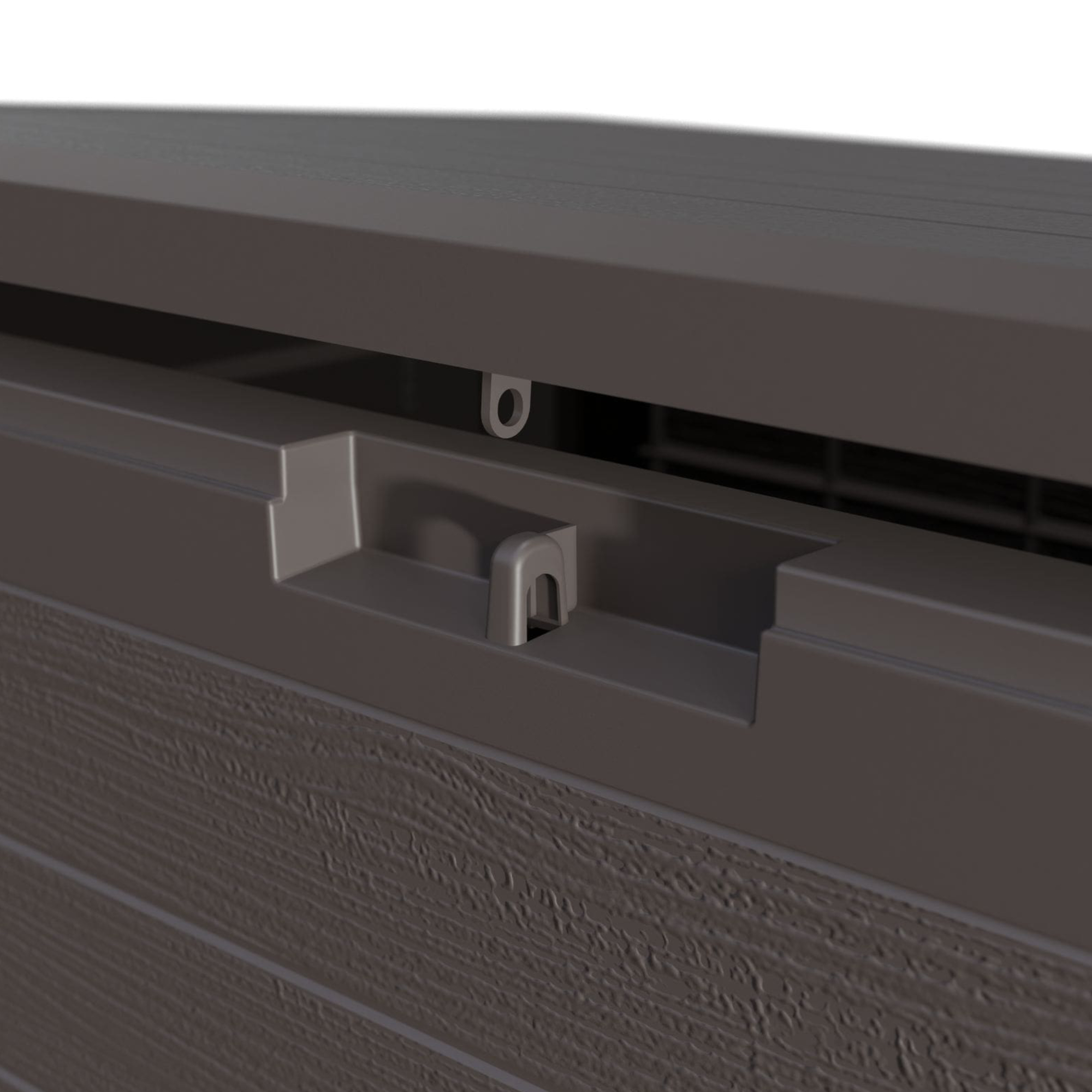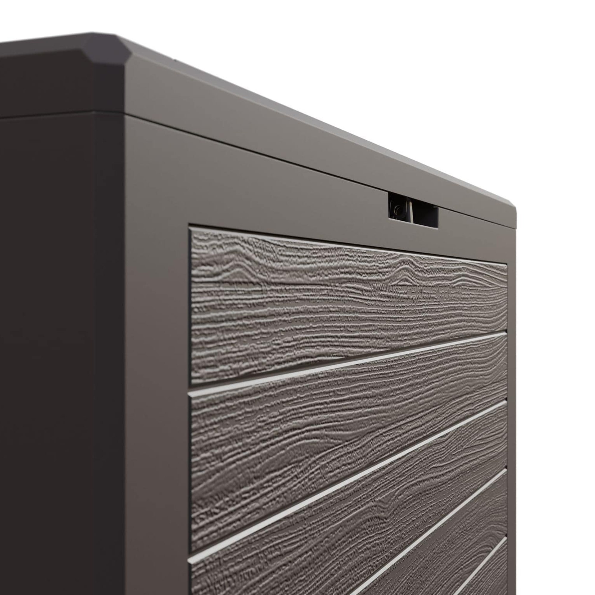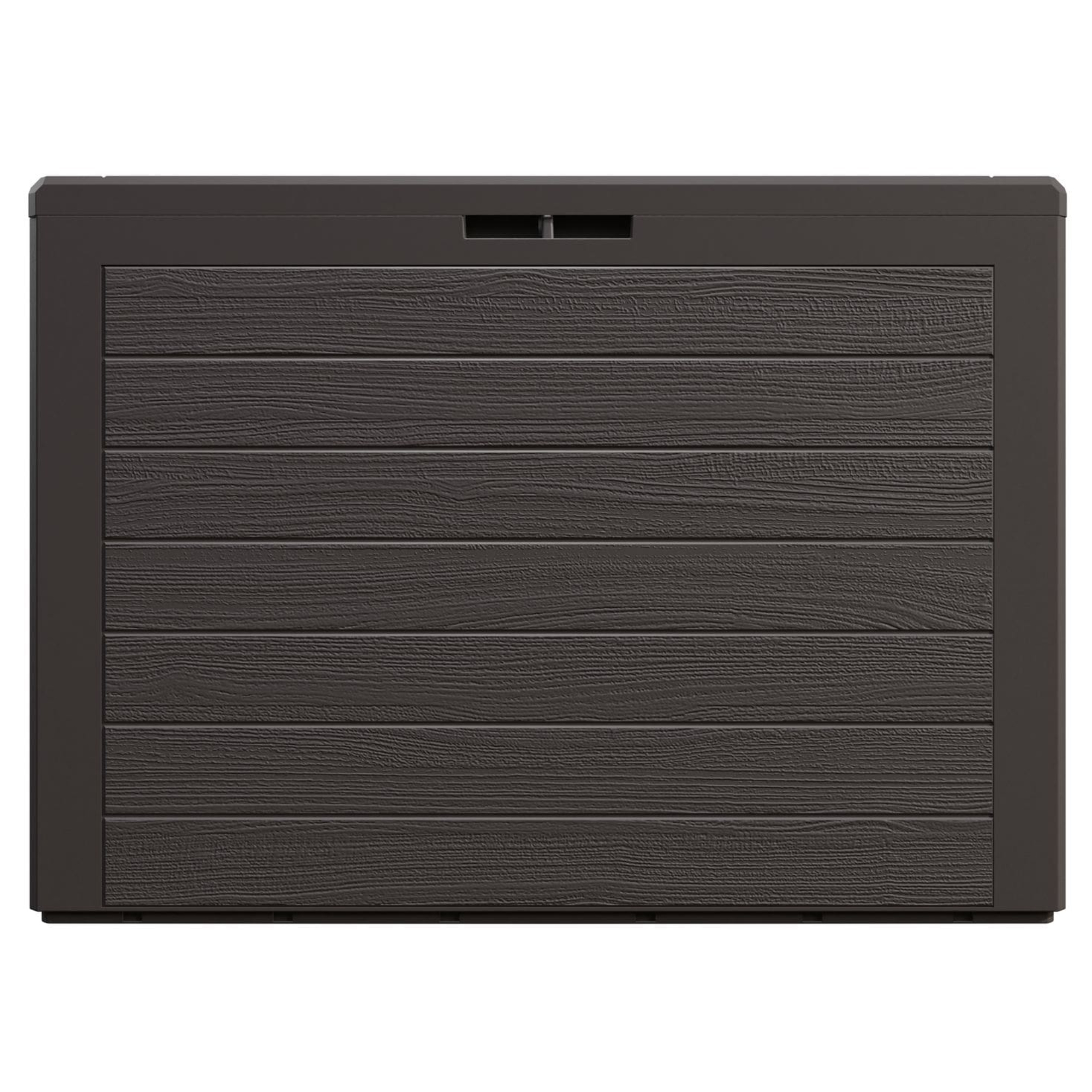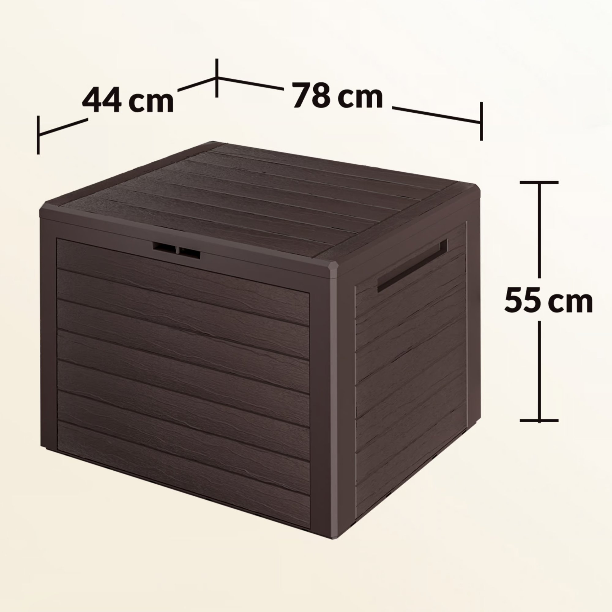 Je vyrobený z kvalitného plastu so vzhľadom dreva, odolného voči poveternostným vplyvom a UV žiareniu. Je teda ideálnou voľbou na celoročné použitie. Jeho robustné vyhotovenie s objemom 190 l ponúka dostatok úložného priestoru na vankúše, deky, hračky a ďalšie doplnky.