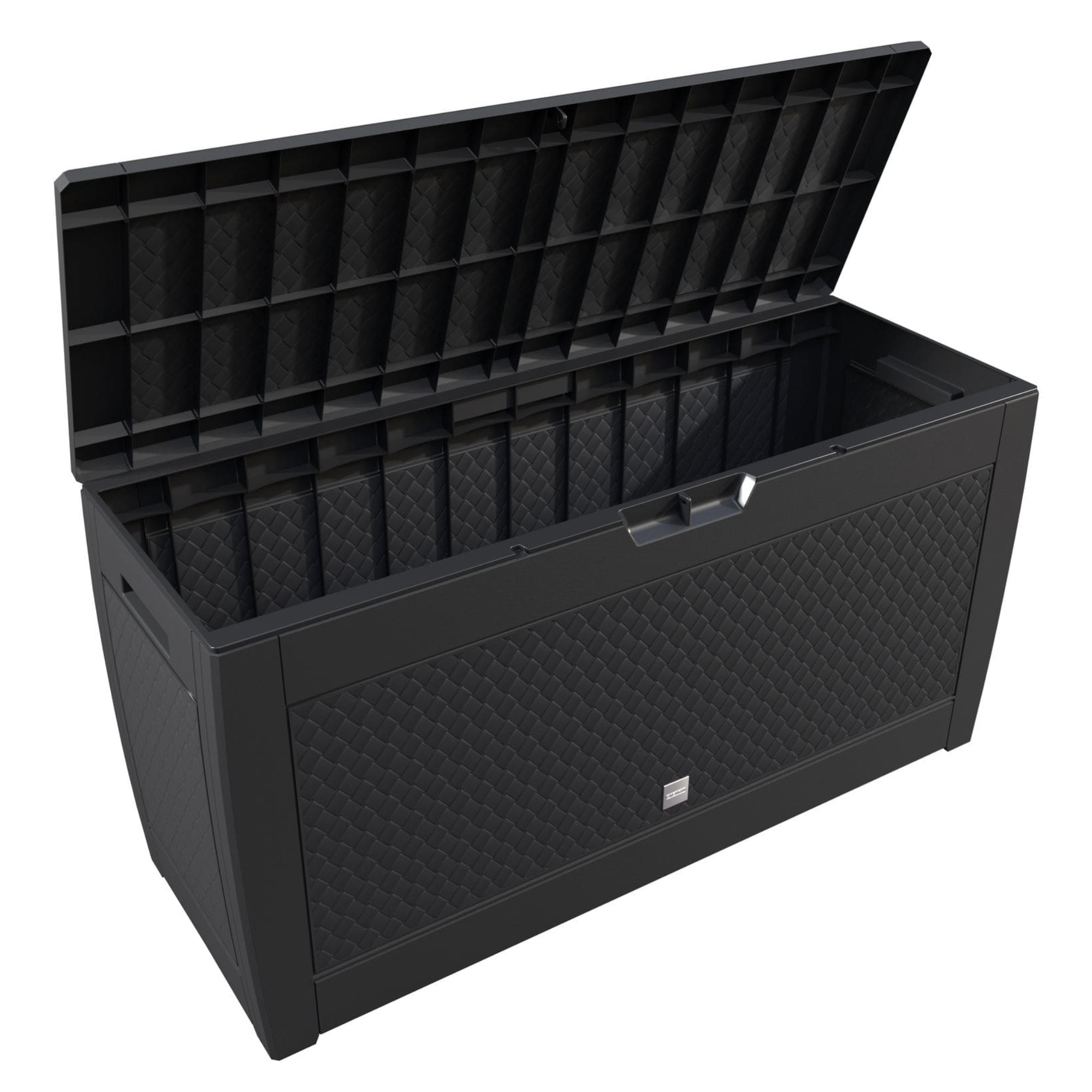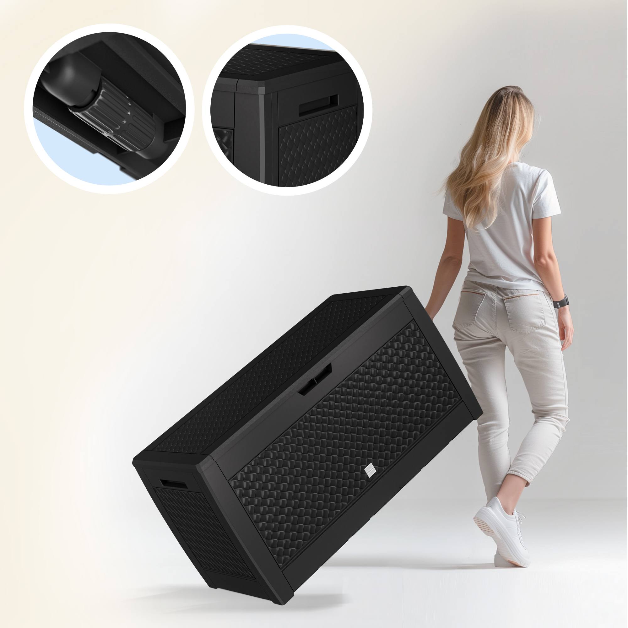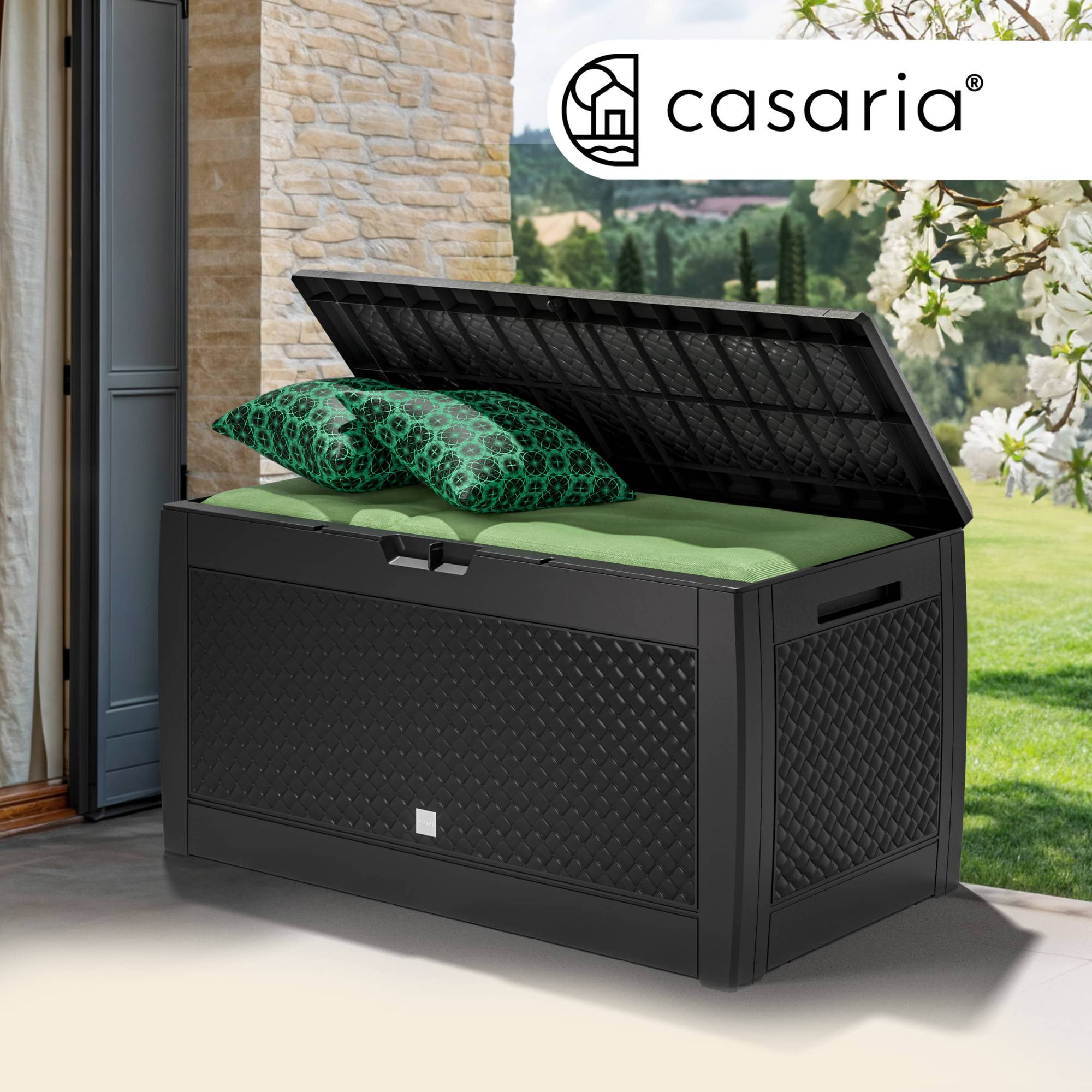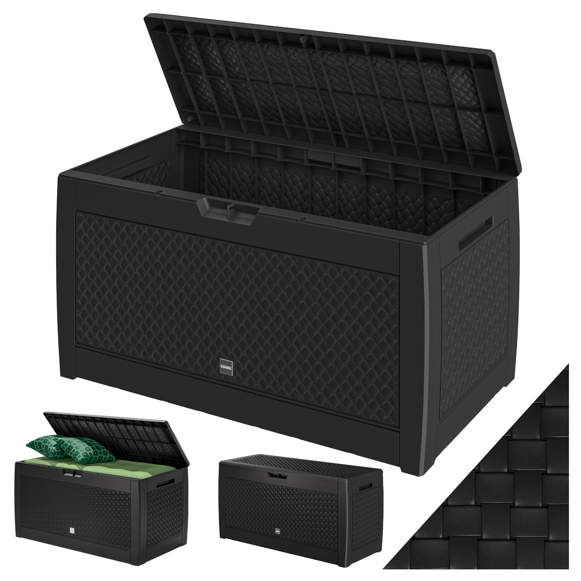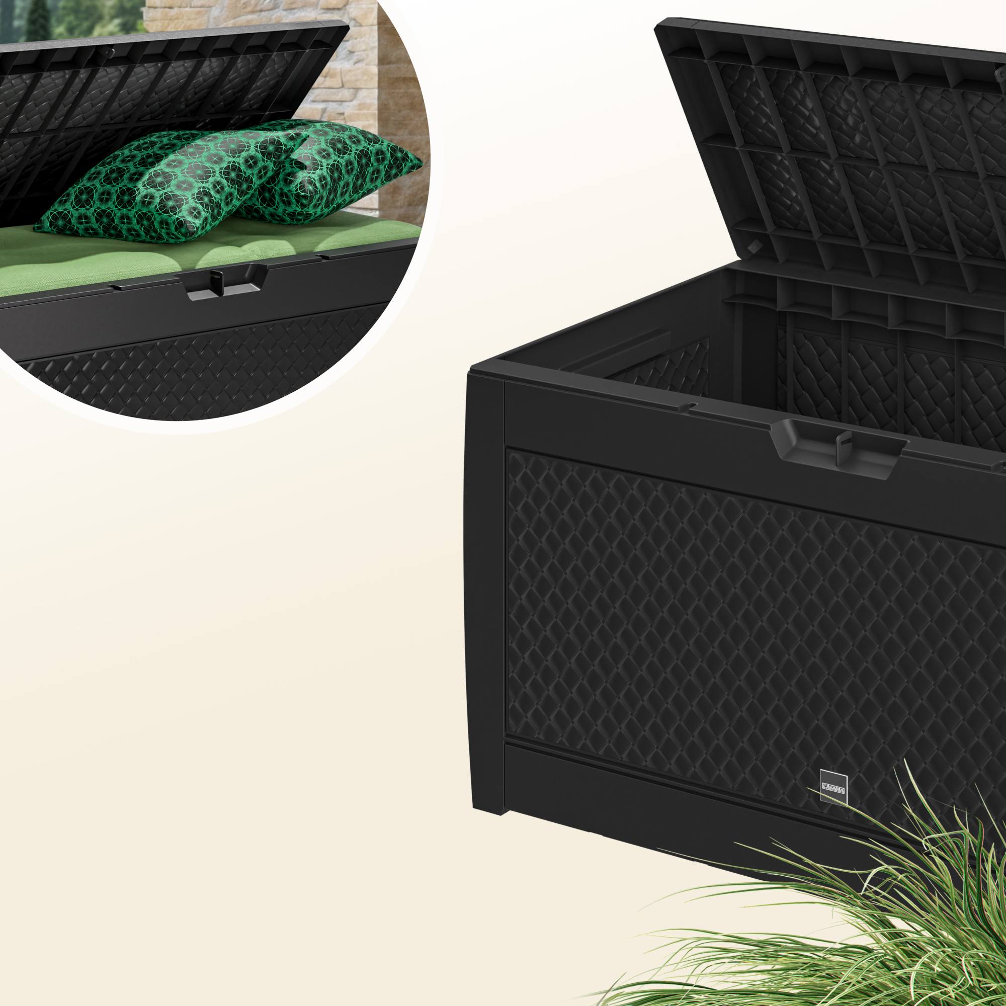 Je vyrobený z kvalitného plastu, odolného voči poveternostným vplyvom a UV žiareniu. Je teda ideálnou voľbou na celoročné použitie. Jeho robustné vyhotovenie s objemom 310 l ponúka dostatok úložného priestoru na vankúše, deky, hračky a ďalšie doplnky.