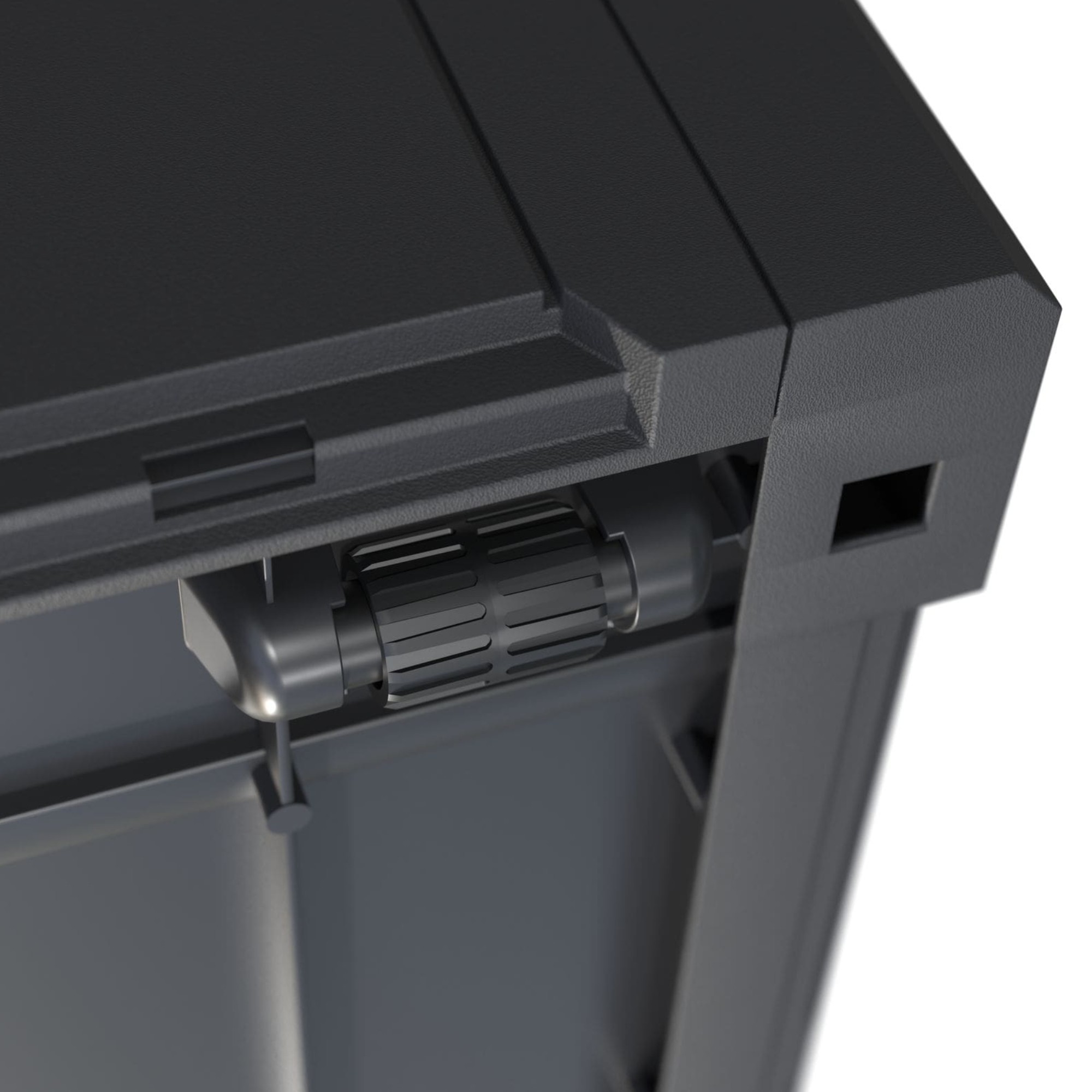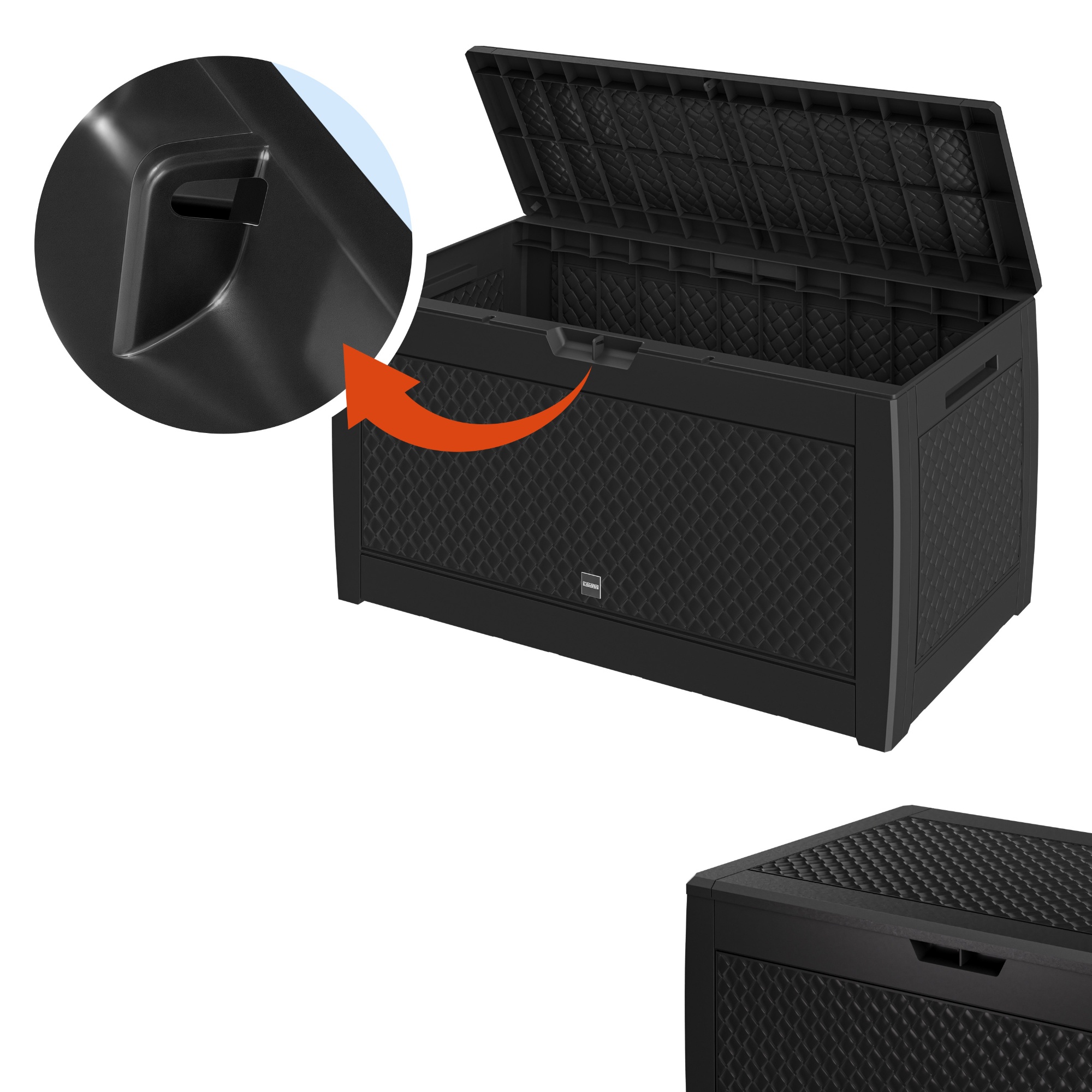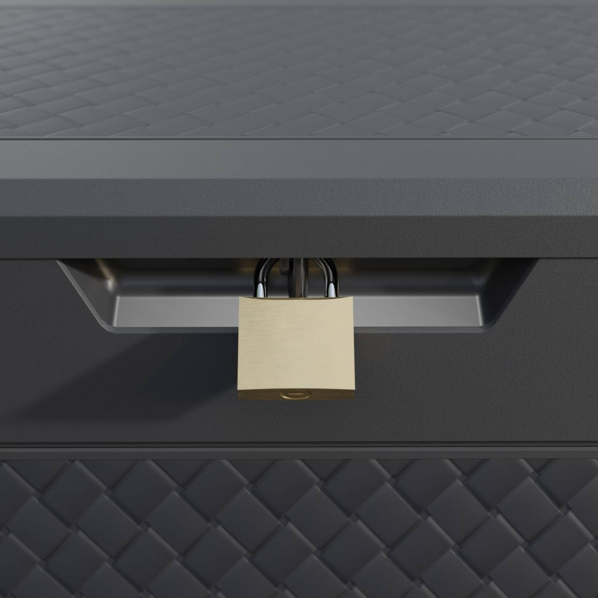 Výklopné veko je možné uzamknúť pomocou visiaceho zámku (nie je súčasťou balenia), takže obsah bude v bezpečí. Box je vybavený 2 úchytmi a 6 kolieskami pre jednoduchú manipuláciu. Pomocou zacvakávacieho systému ho jednoducho a rýchlo zložíte.