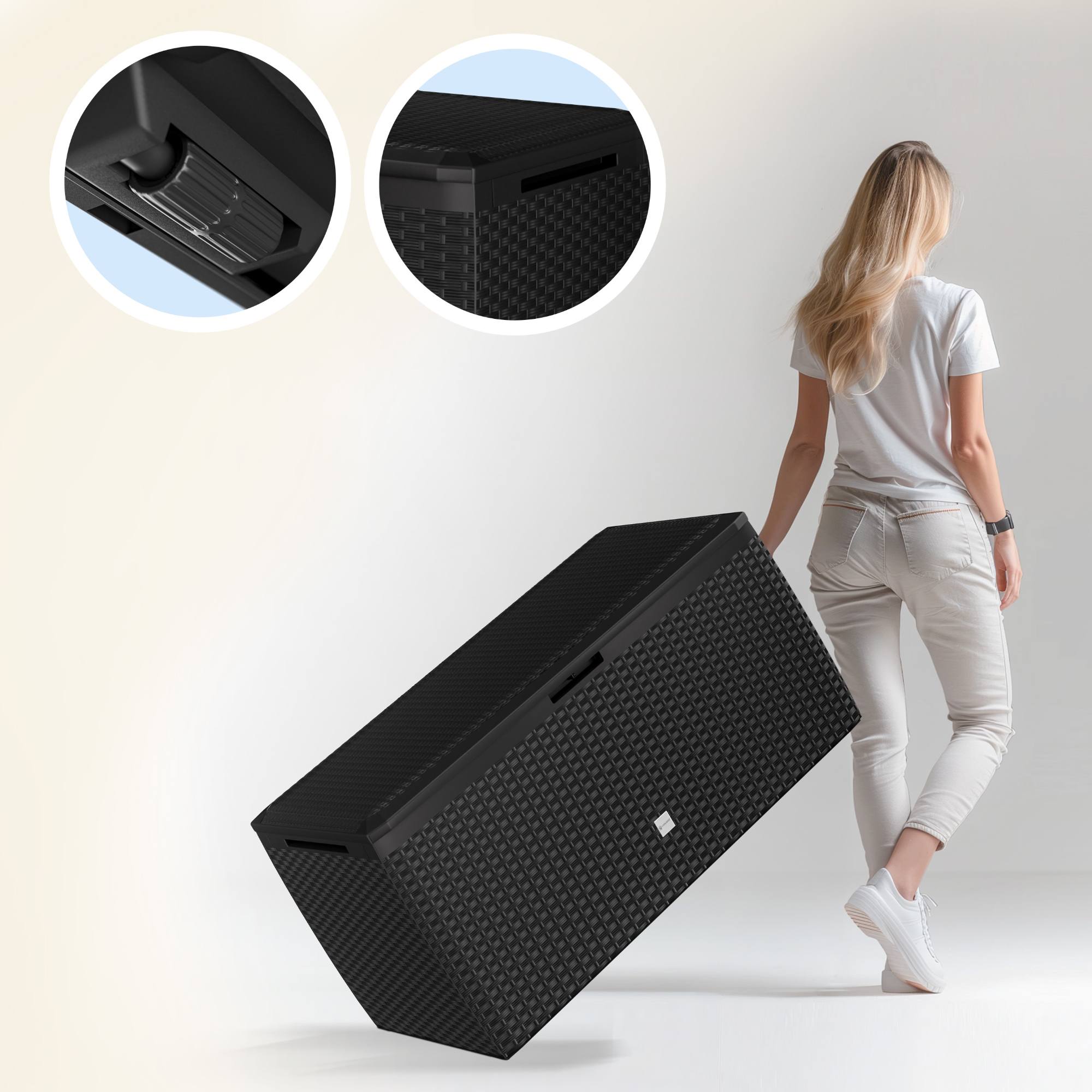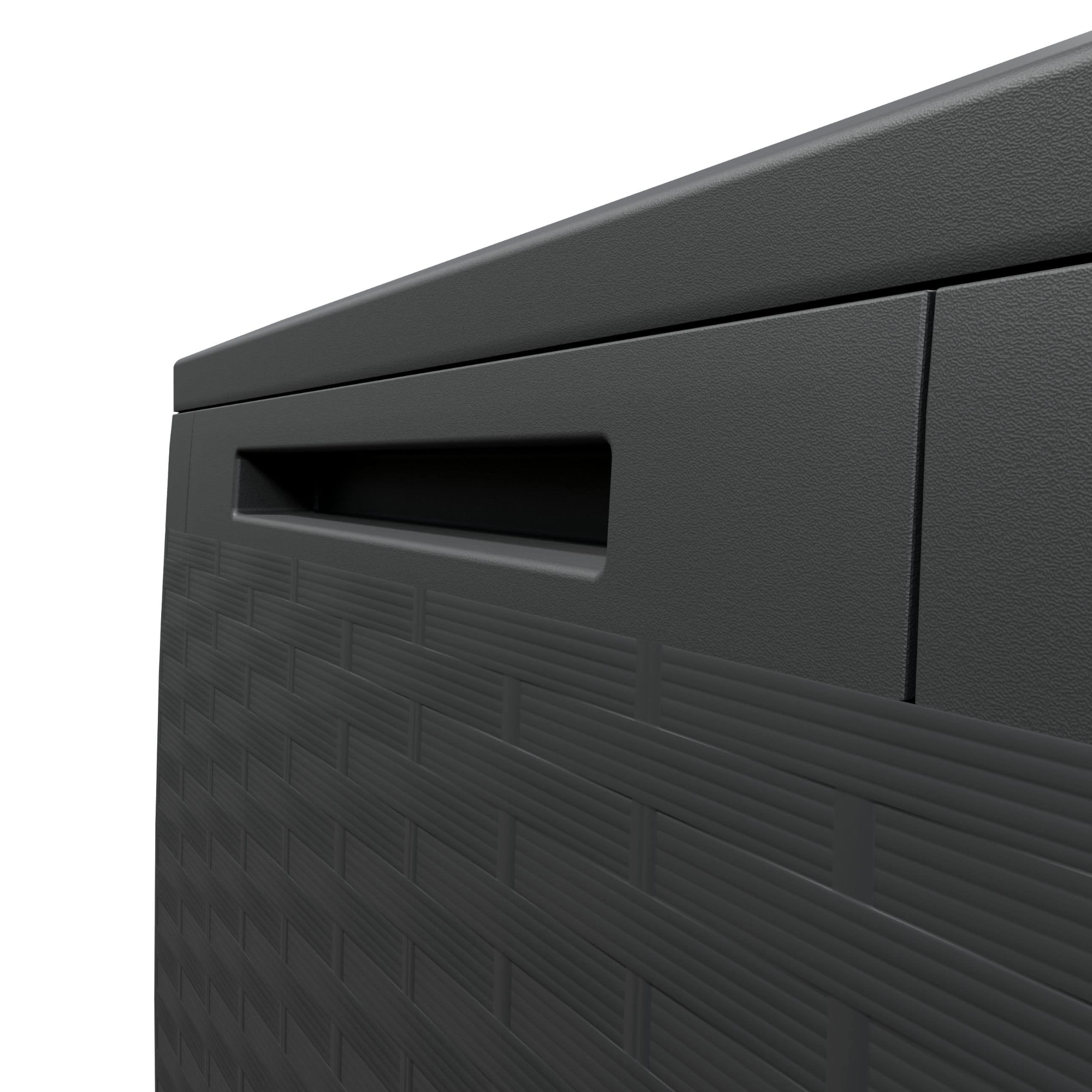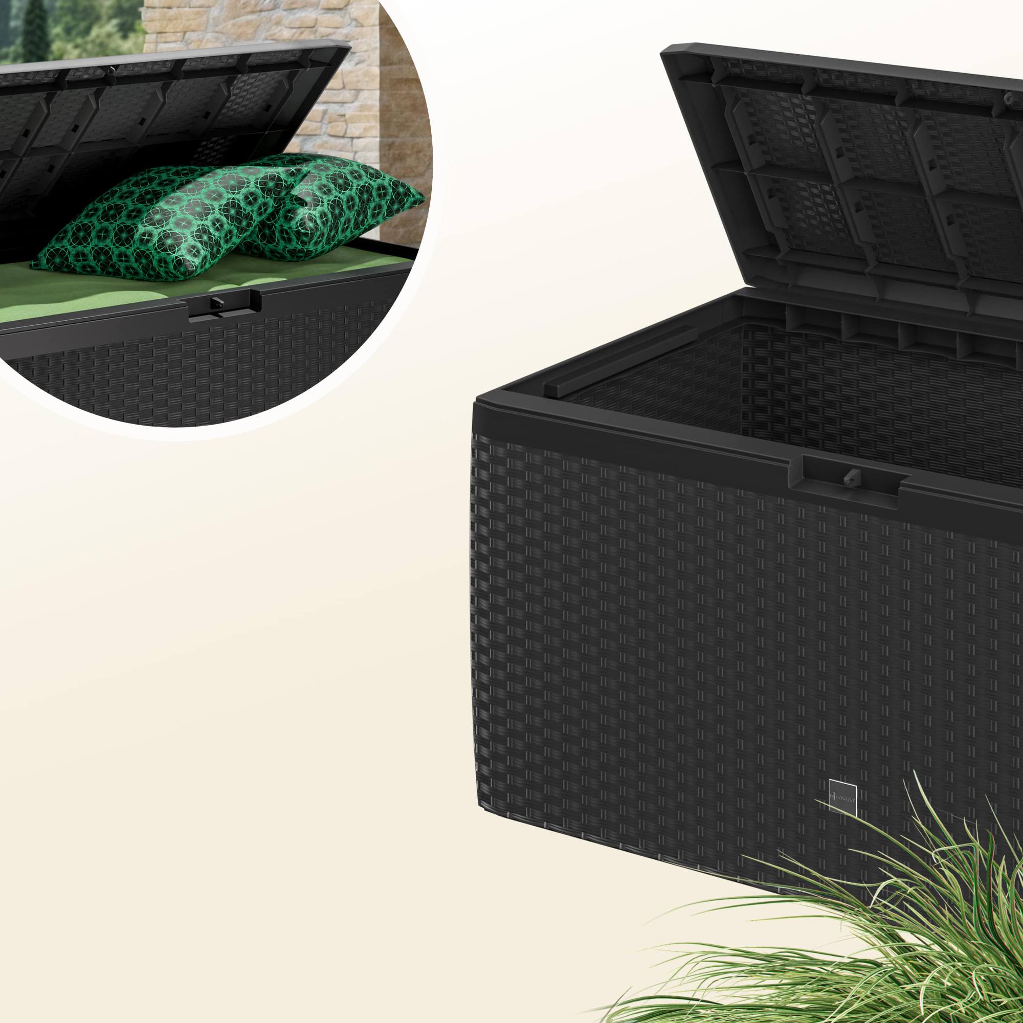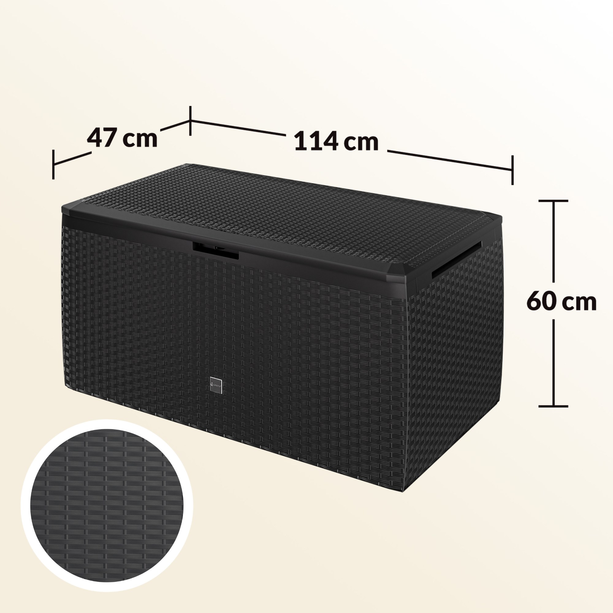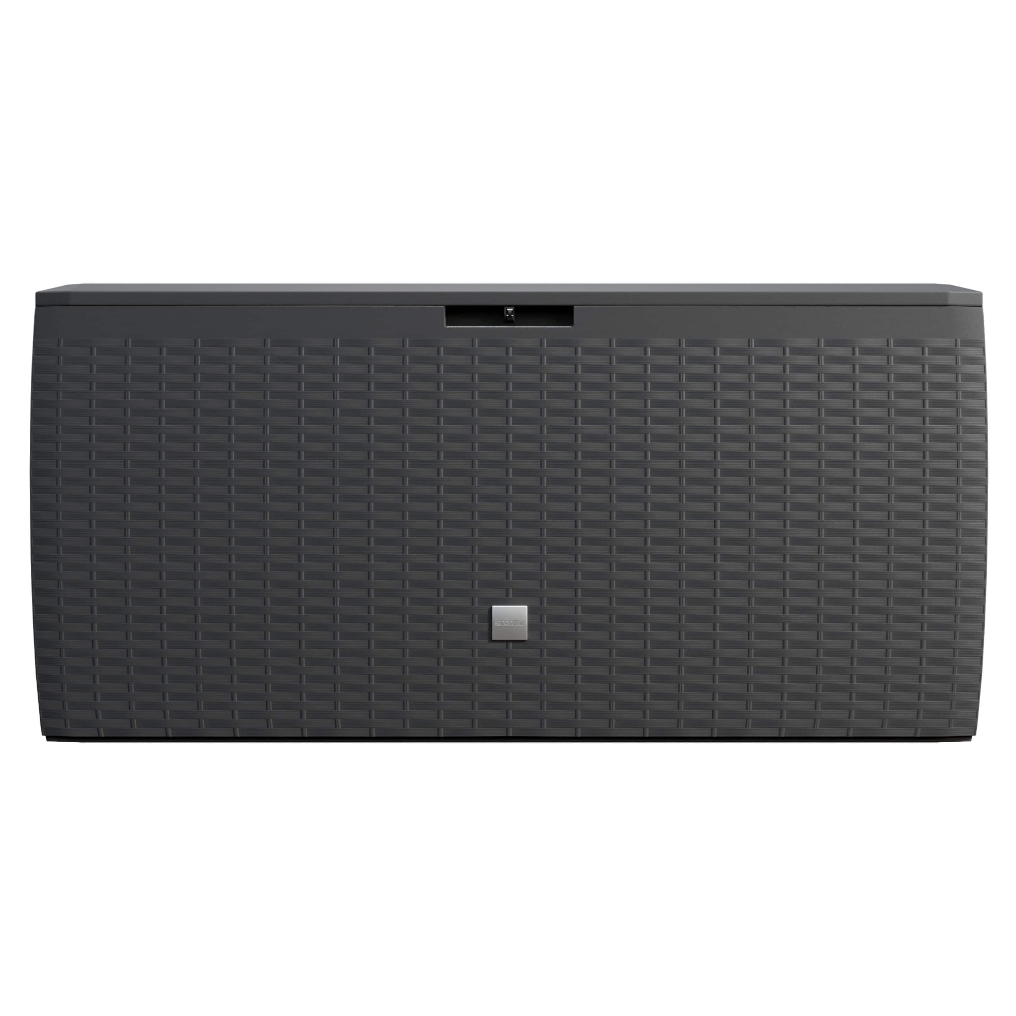 Je vyrobený z polypropylénu, odolného voči poveternostným vplyvom a UV žiareniu. Je teda ideálnou voľbou na celoročné používanie. Jeho robustné vyhotovenie s objemom 290 l ponúka dostatok úložného priestoru na vankúše, deky, hračky a ďalšie doplnky.