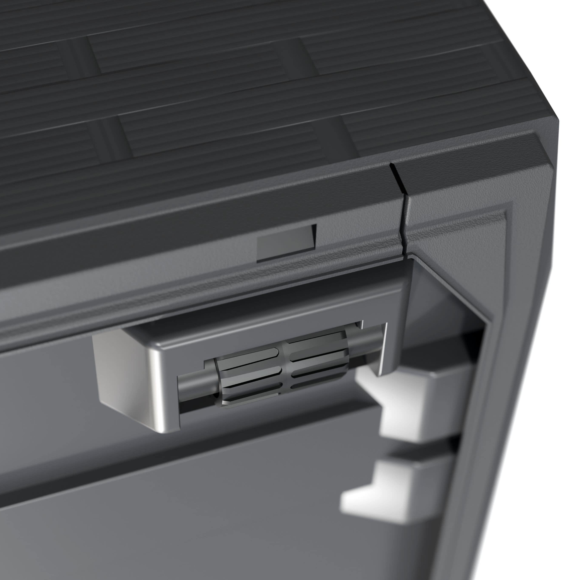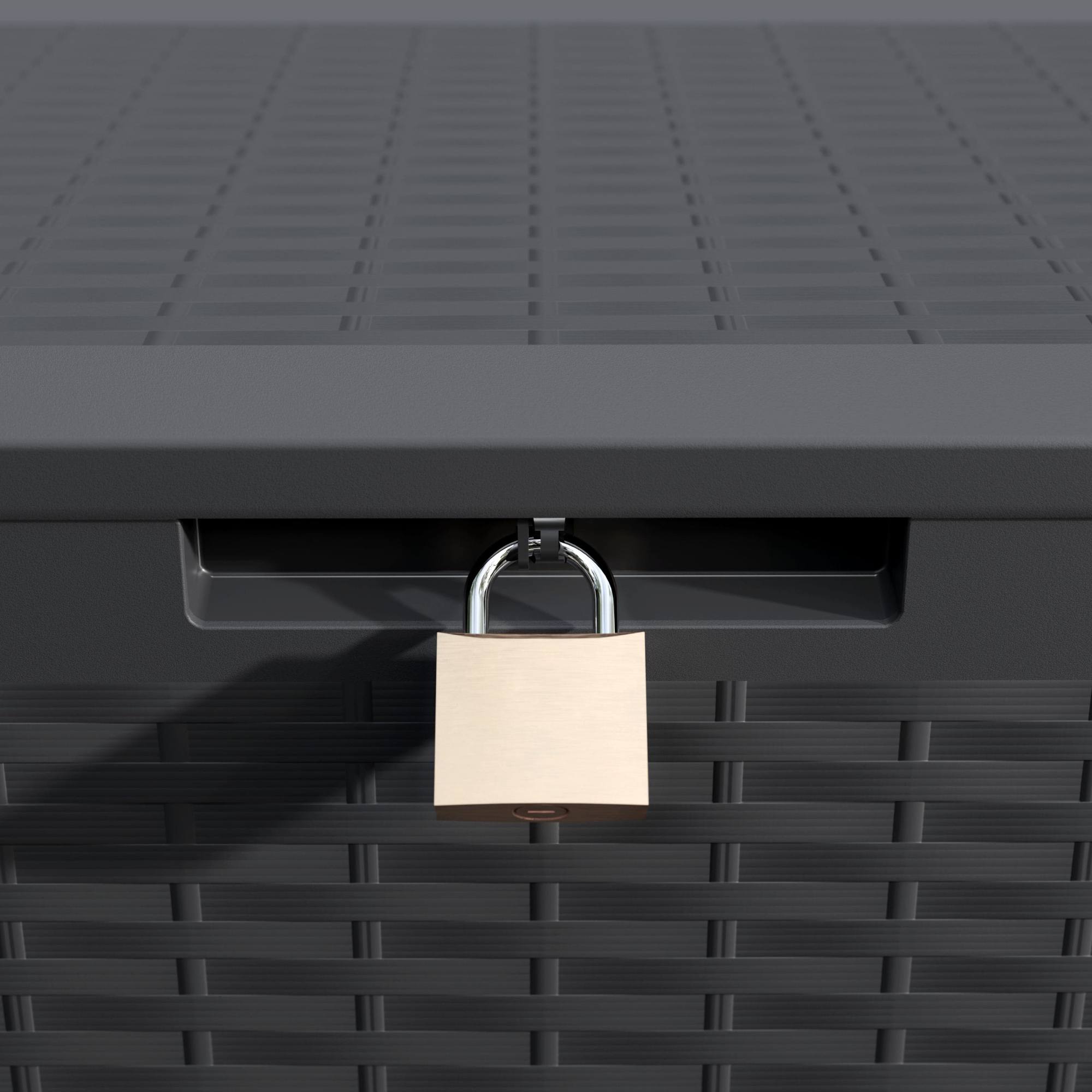 Výklopné veko je možné uzamknúť pomocou visiaceho zámku (nie je súčasťou balenia), takže obsah bude v bezpečí. Box je vybavený 2 úchytmi a 6 kolieskami na jednoduchú manipuláciu. Pomocou zacvakávacieho systému ho jednoducho a rýchlo zostavíte.