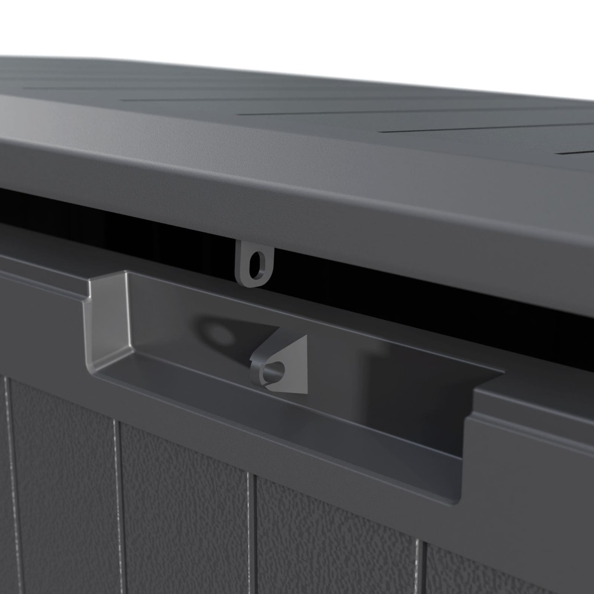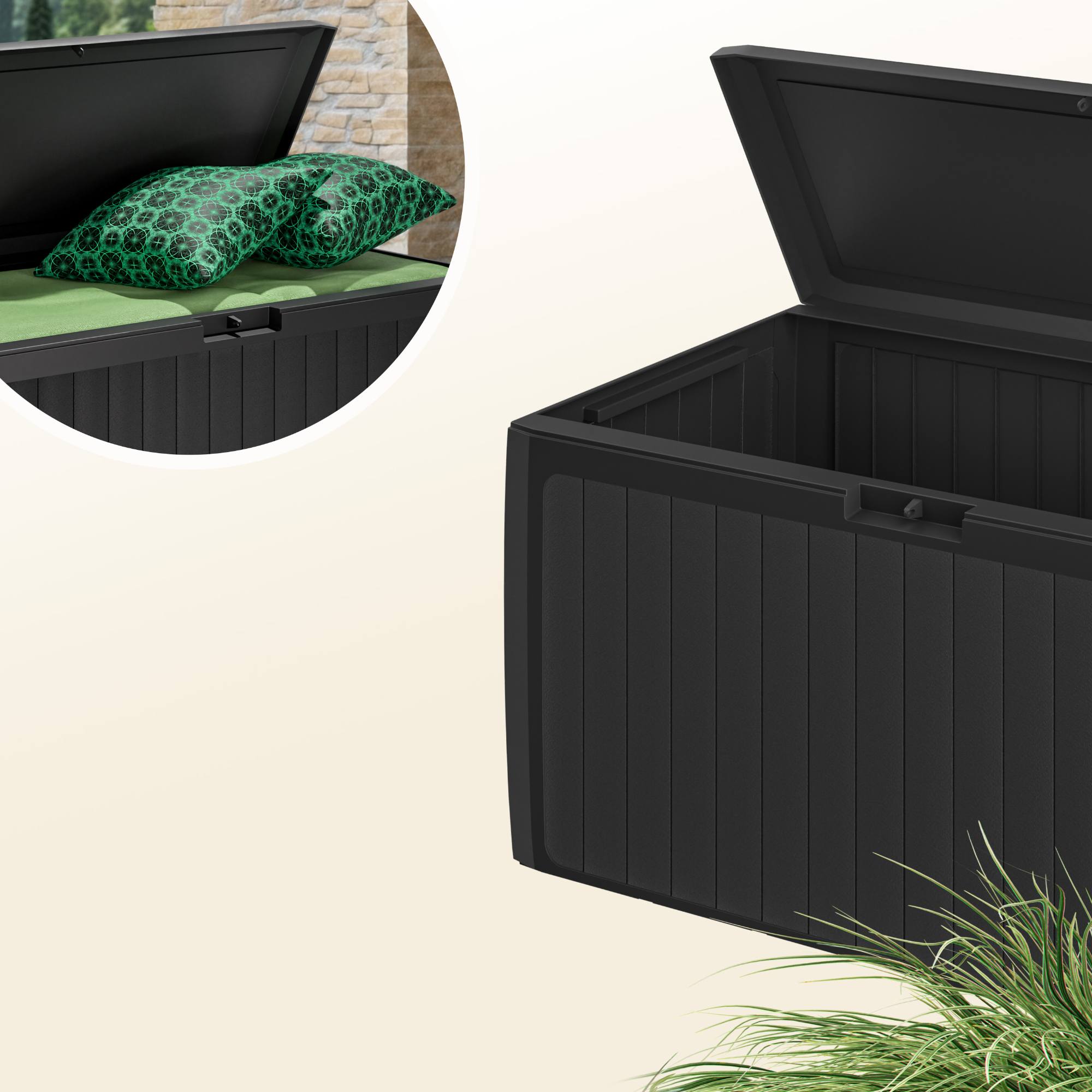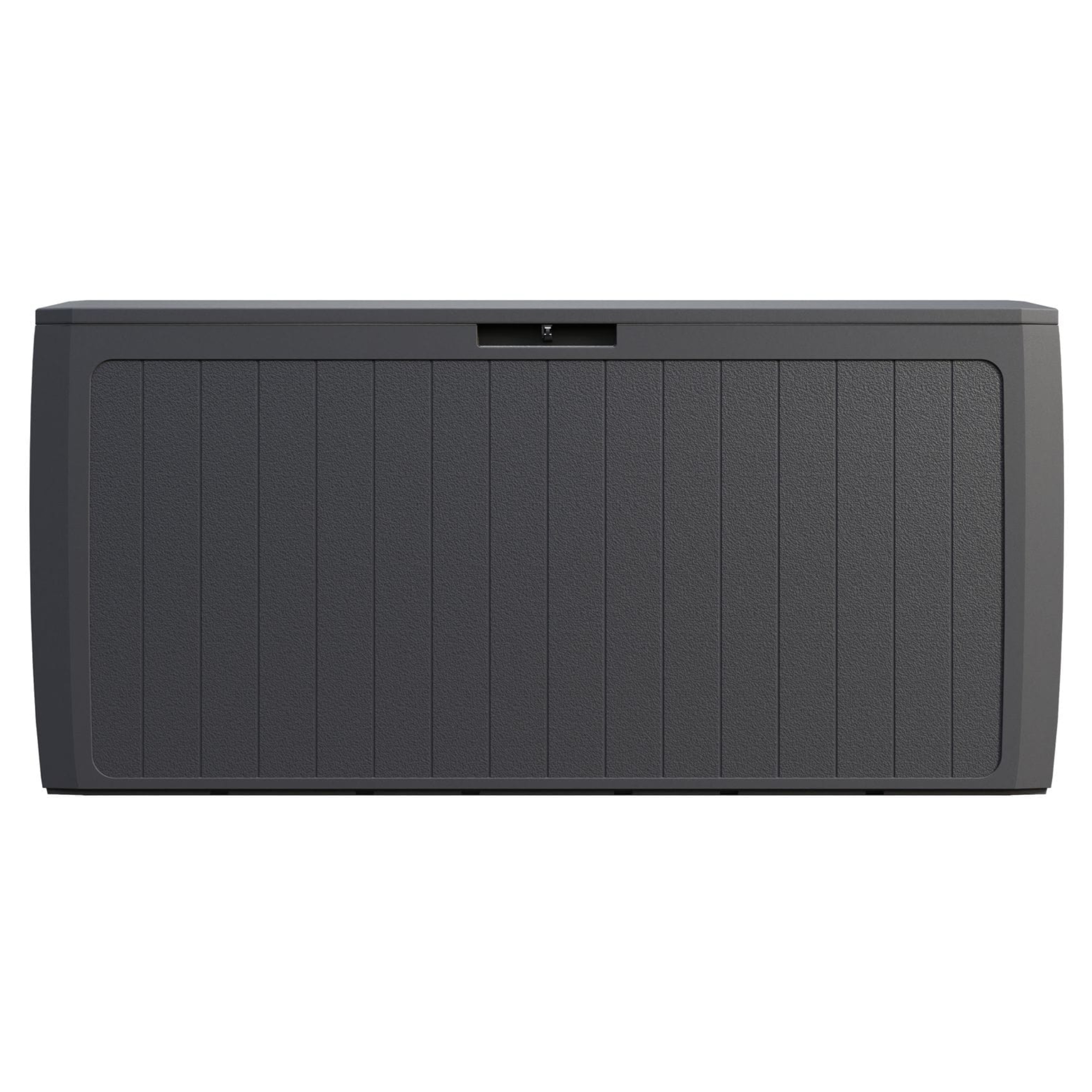 Je vyrobený z polypropylénu, odolného voči poveternostným vplyvom a UV žiareniu. Je teda ideálnou voľbou na celoročné používanie. Jeho robustné vyhotovenie s objemom 290 l ponúka dostatok úložného priestoru na vankúše, deky, hračky a ďalšie doplnky.