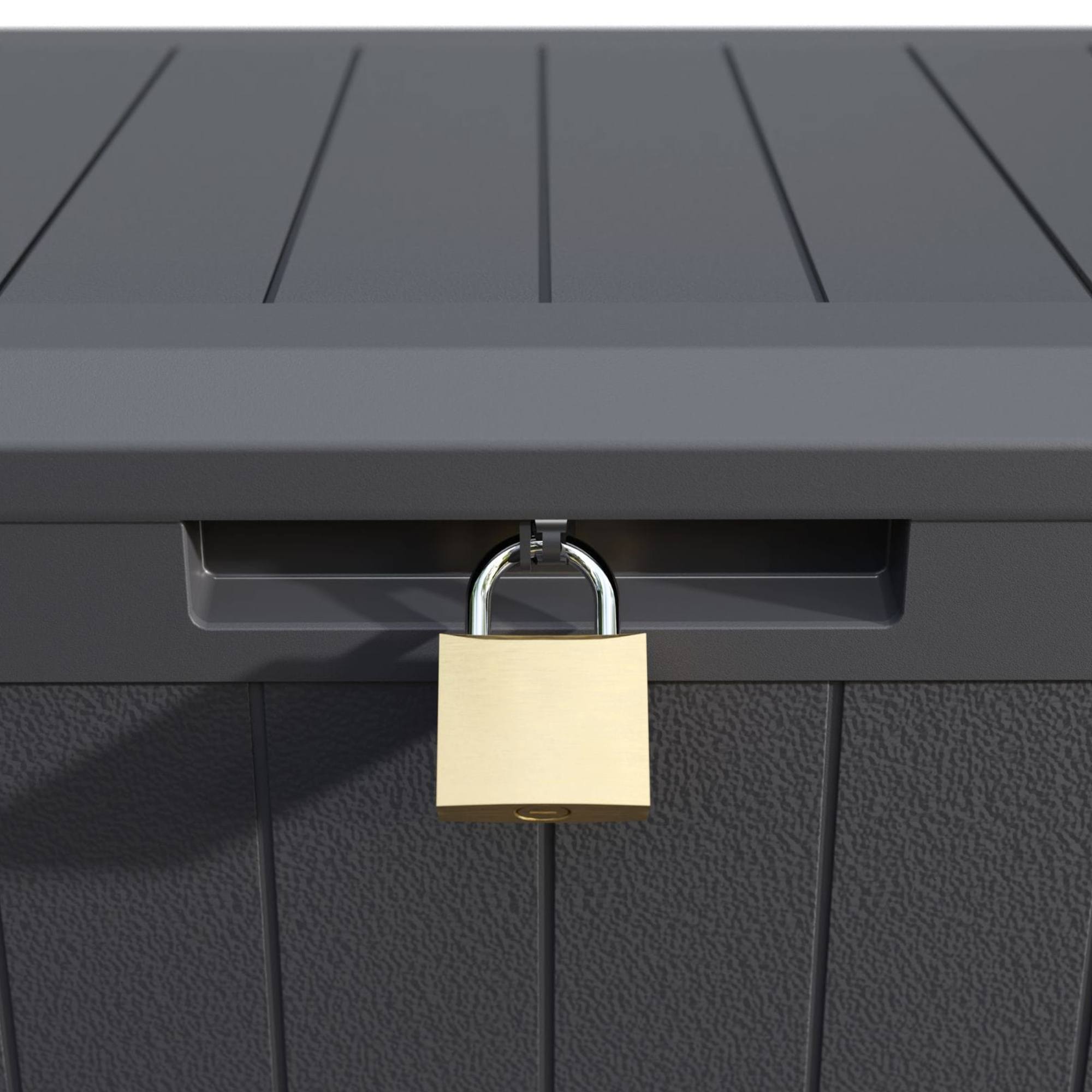 Výklopné veko je možné uzamknúť pomocou visiaceho zámku (nie je súčasťou balenia), takže obsah bude v bezpečí. Box je vybavený 2 úchytmi a 6 kolieskami na jednoduchú manipuláciu. Pomocou zacvakávacieho systému ho jednoducho a rýchlo zostavíte.
