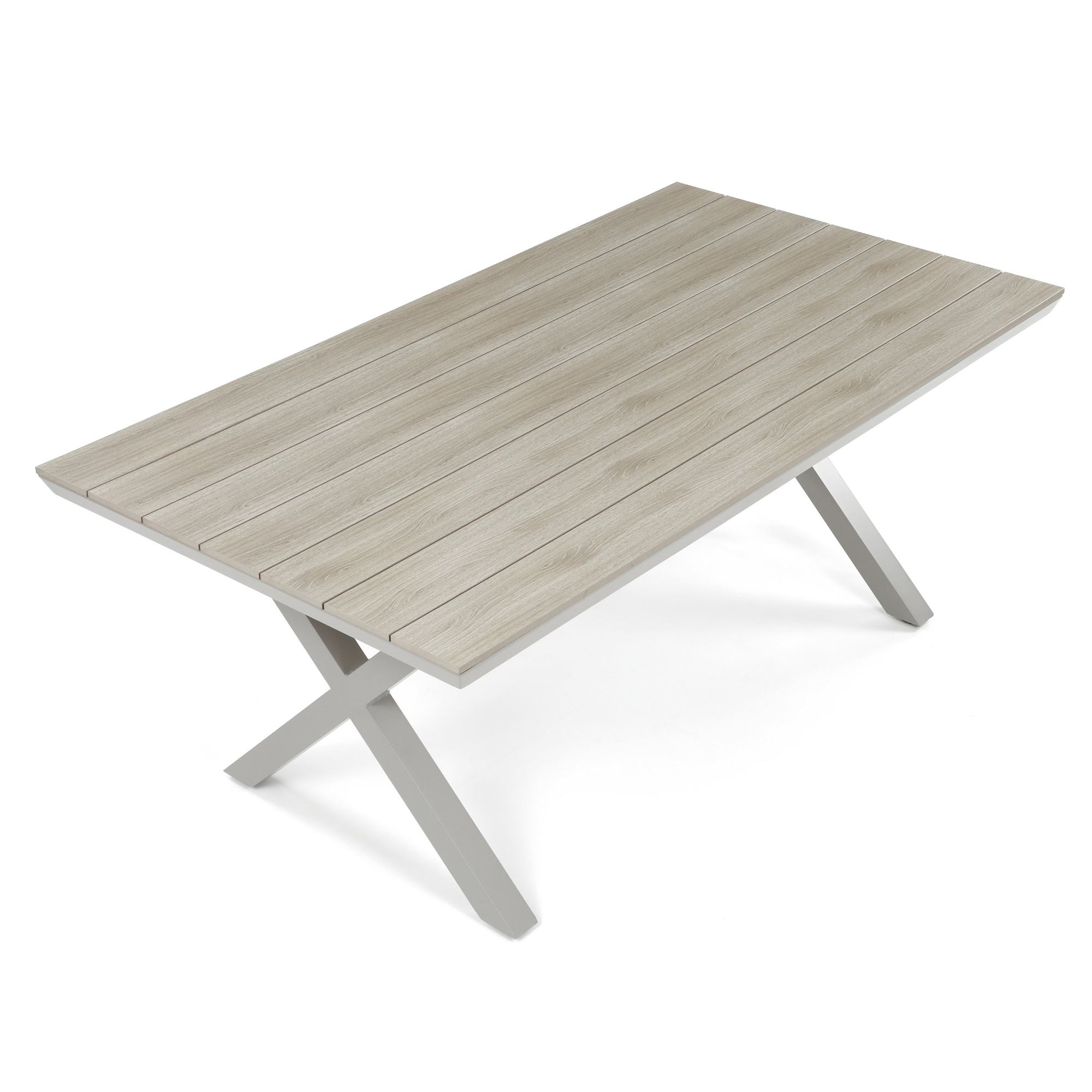 Záhradný hliníkový stôl BLASIUS moderného dizajnu, s hornou doskou z materiálu polywood v odtieni svetlého duba skvele zapadne do každého vonkajšieho priestoru.