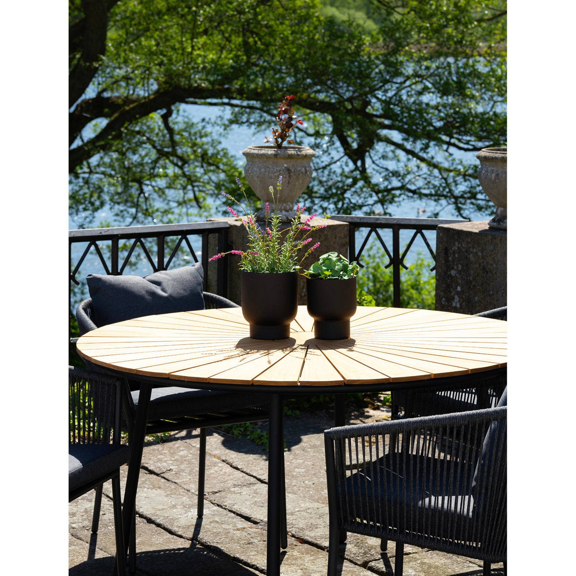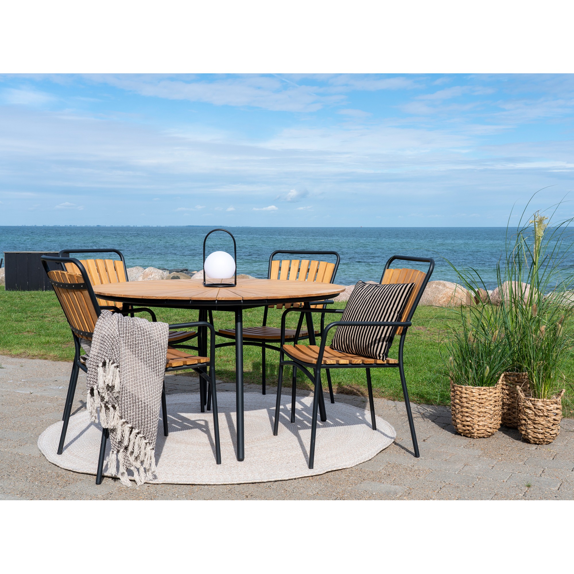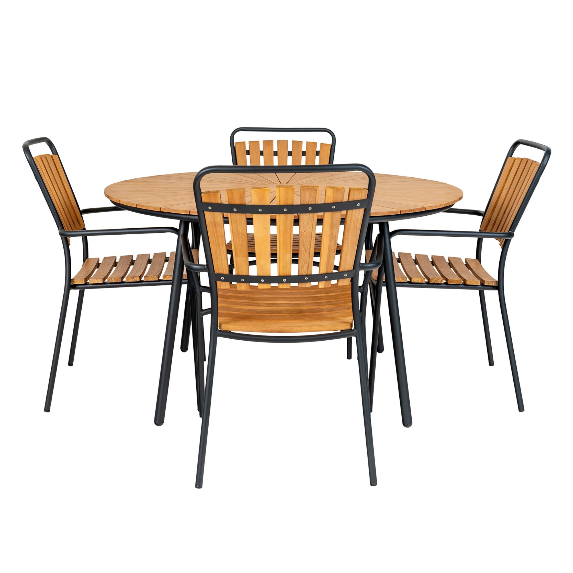 Nohy lakované čiernou farbou sú vyrobené z pevného kovu, čo stolu zaisťuje dostatočnú stabilitu. Doska z kvalitného masívneho teakového dreva poskytuje dostatok priestoru na pohostenie, ktoré ponúknete vašim blízkym.