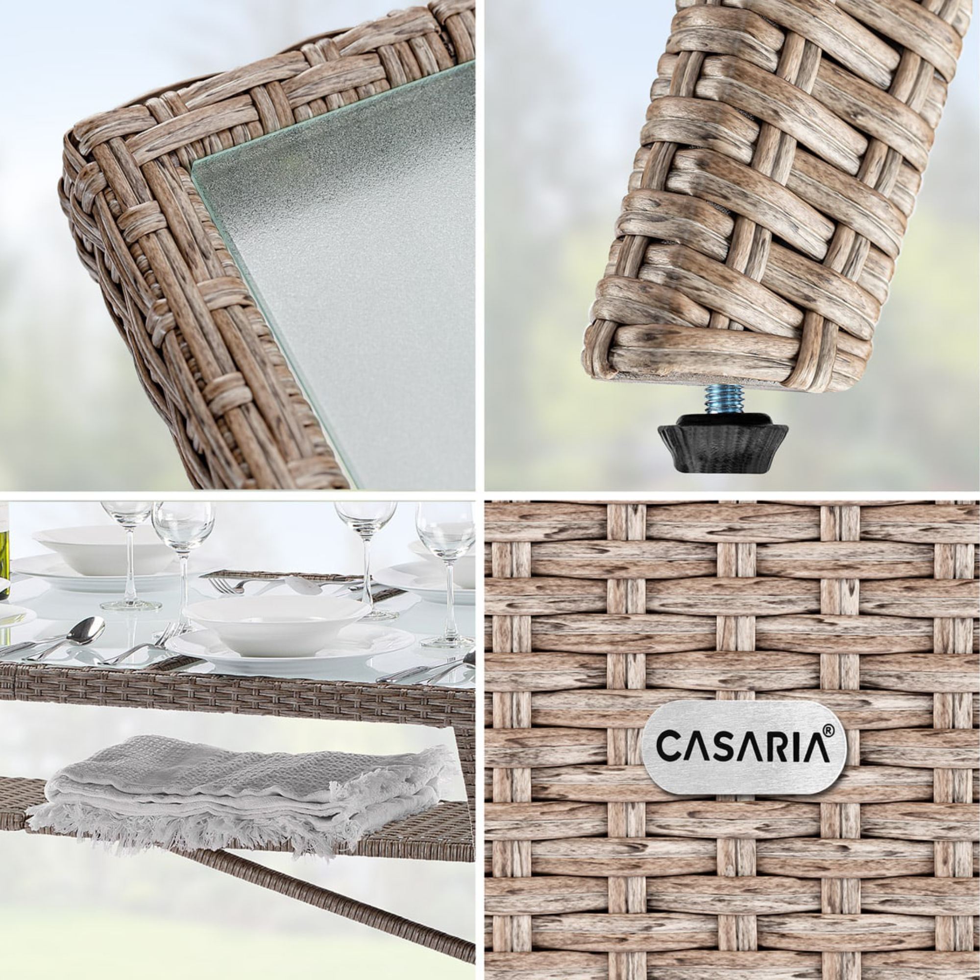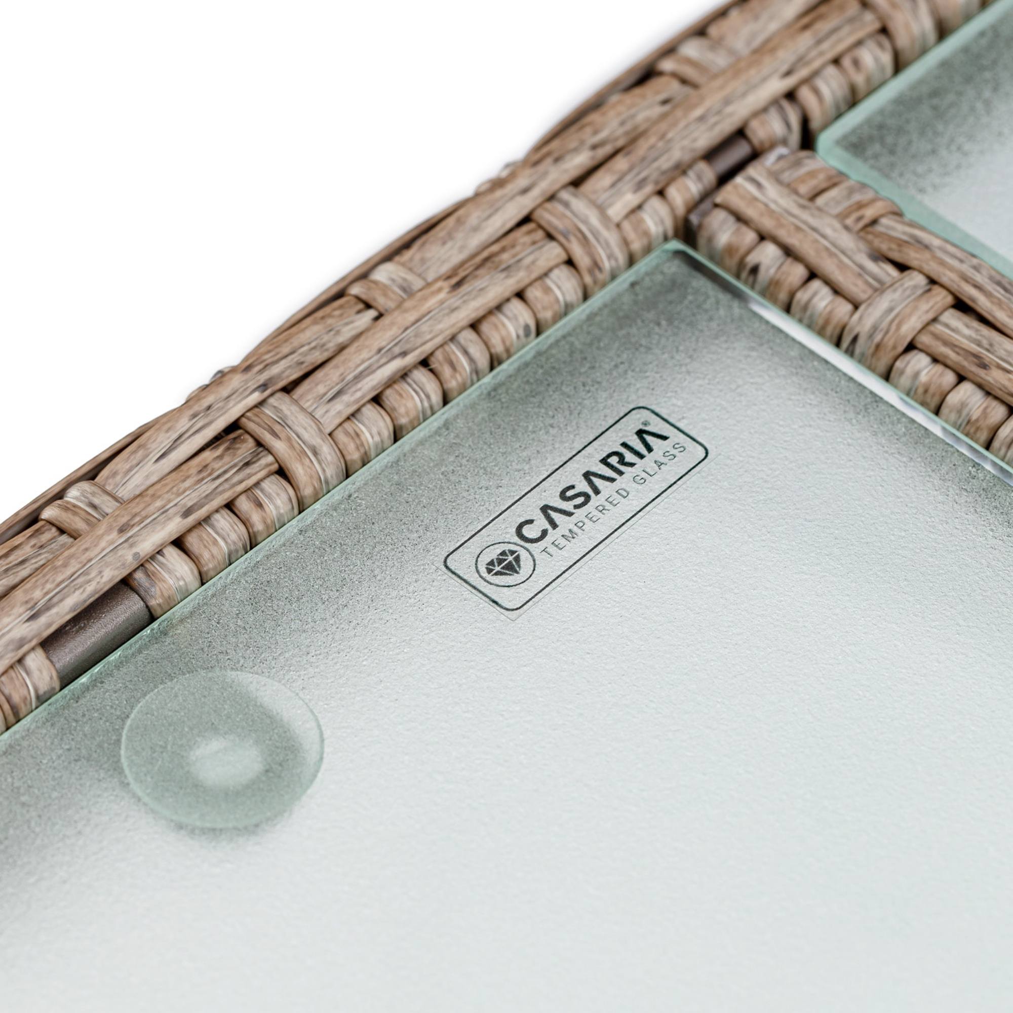 Stôl má pevnú a stabilnú oceľovú konštrukciu, ktorá je práškovo lakovaná a opletená polyratanom. Konštrukcia je odolná voči poveternostným vplyvom a UV žiareniu a ľahko sa čistí. Horná doska je vyrobená z kvalitného 5 mm hrubého tvrdeného skla. Súčasťou stola je 1 vložená polica, na ktorú si môžete odložiť časopisy aj rôzne drobnosti.