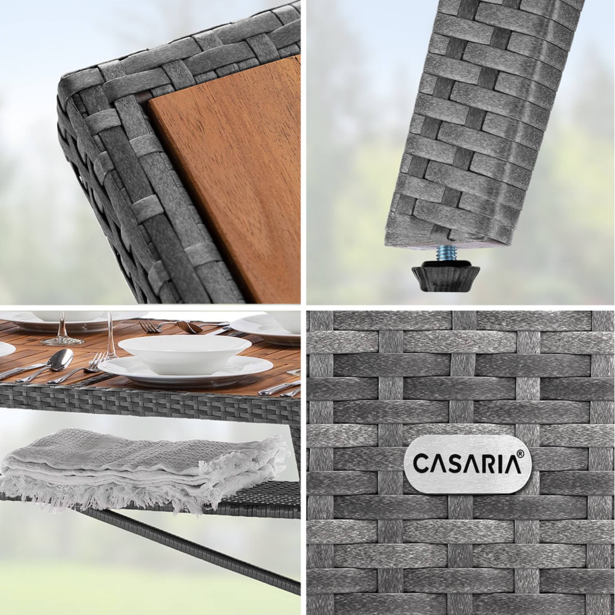 Stôl má pevnú a stabilnú oceľovú konštrukciu, ktorá je práškovo lakovaná a opletená polyratanom. Konštrukcia je odolná voči poveternostným vplyvom a UV žiareniu a ľahko sa čistí. Horná doska je vyrobená z masívneho akáciového dreva, ktorého povrch je olejovaný. Súčasťou stola je 1 vložená polica, na ktorú si môžete odložiť časopisy aj rôzne drobnosti.