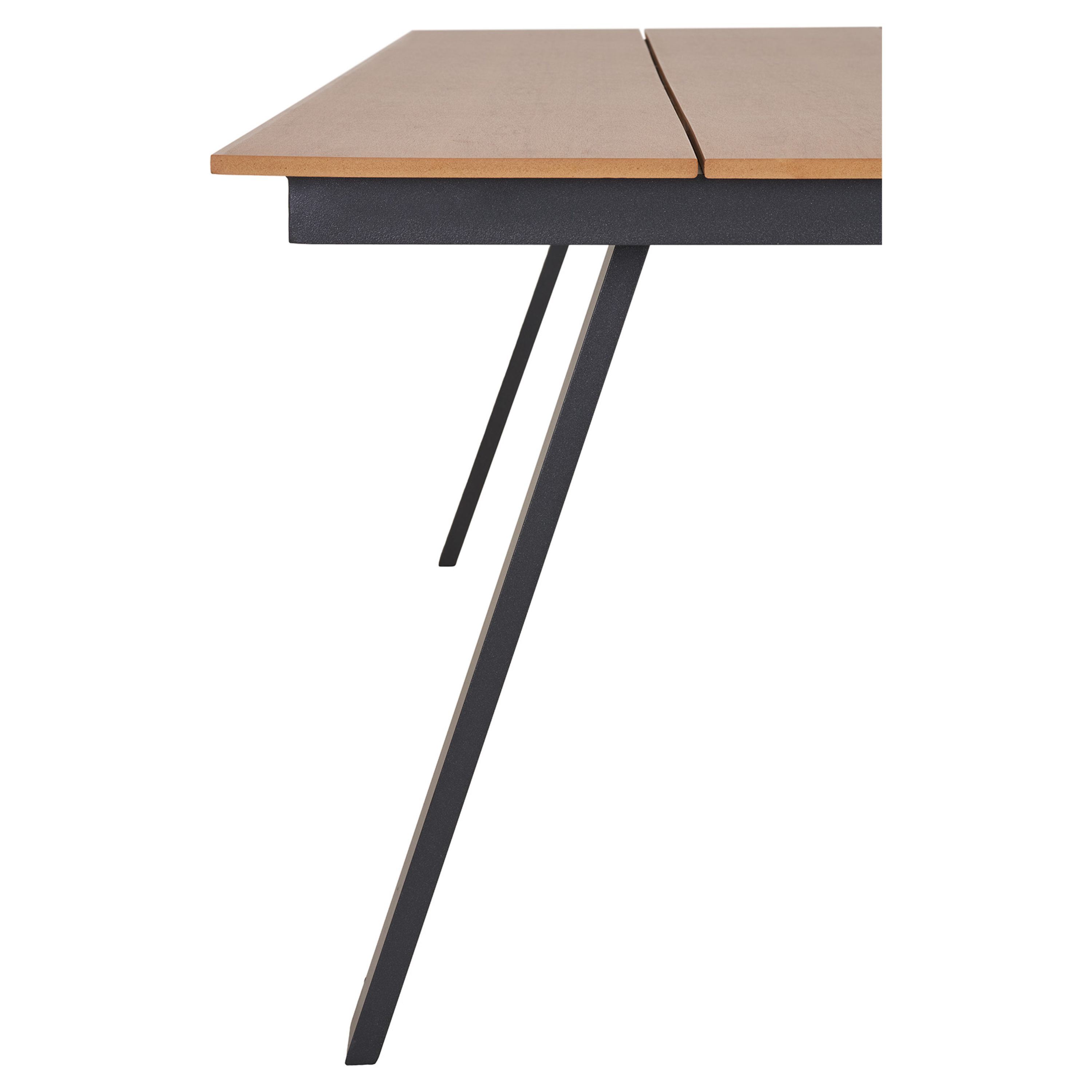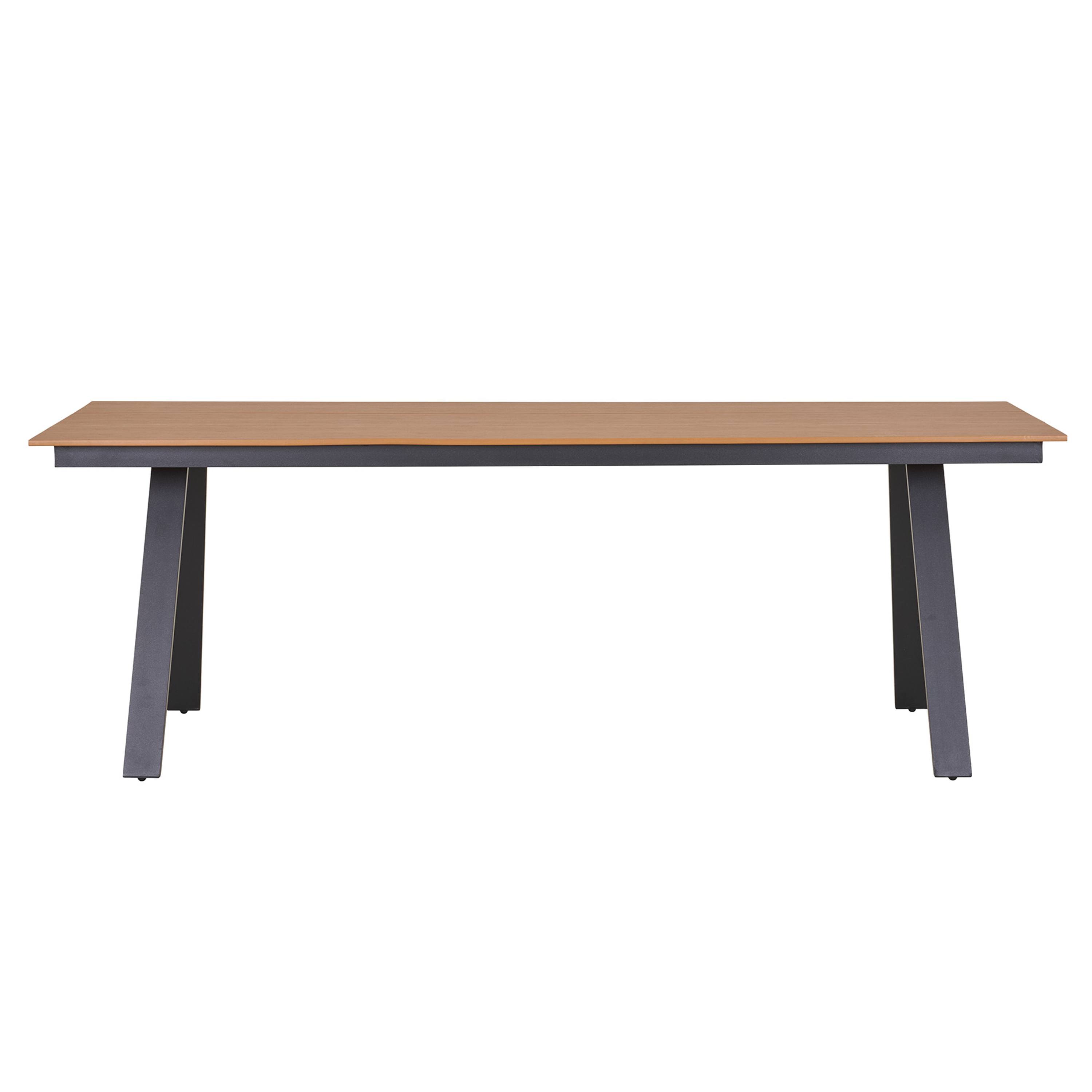 Priestranná obdĺžniková doska je vyrobená z nedreveného materiálu vierohodne pripomínajúceho reálne drevo. Na rozdiel od masívneho dreva však nevyžaduje žiadnu špeciálnu údržbu a odoláva vplyvom počasia. Dosku podopierajú 4 pevné hliníkové nohy, ktoré zaisťujú stabilitu a nosnosť celého stola.