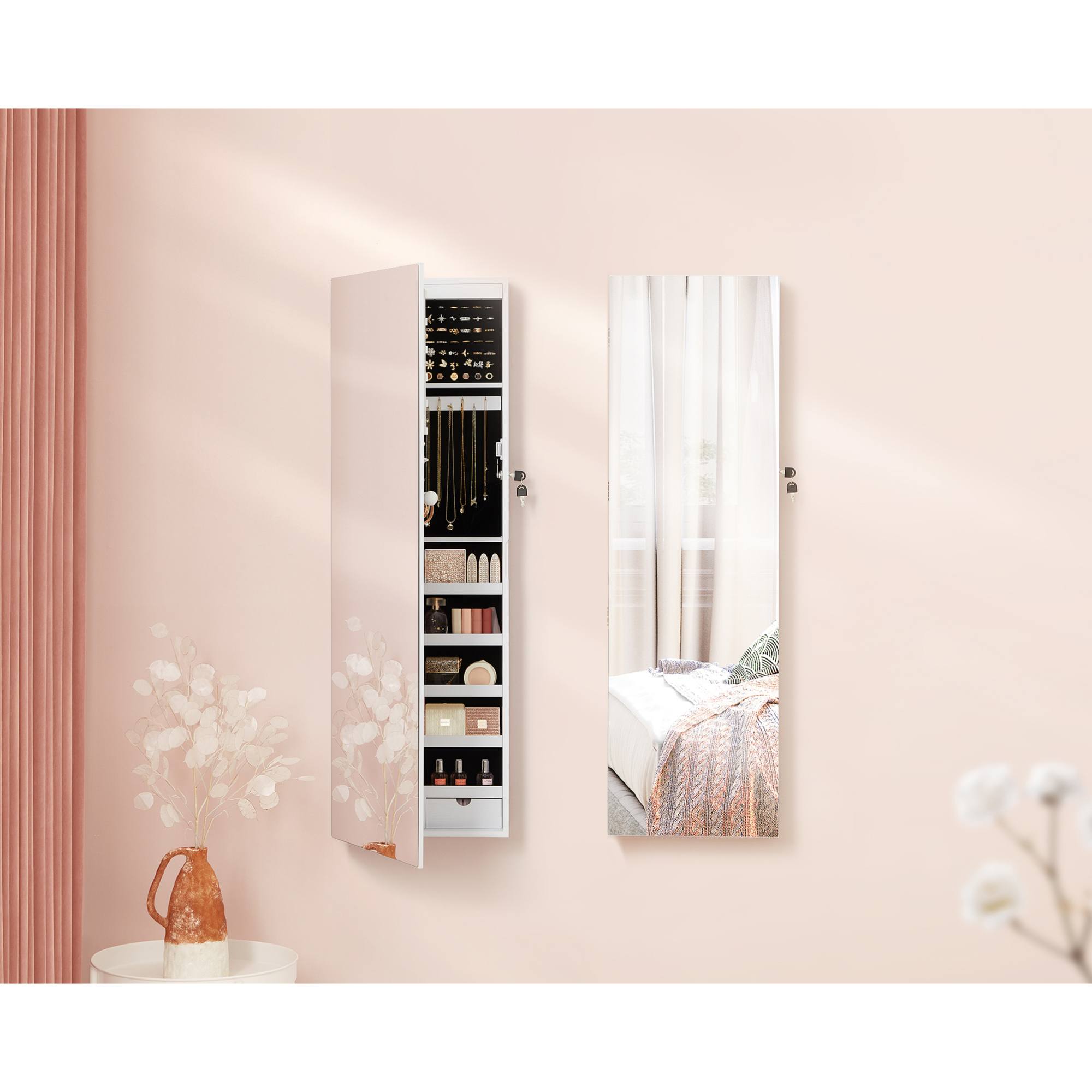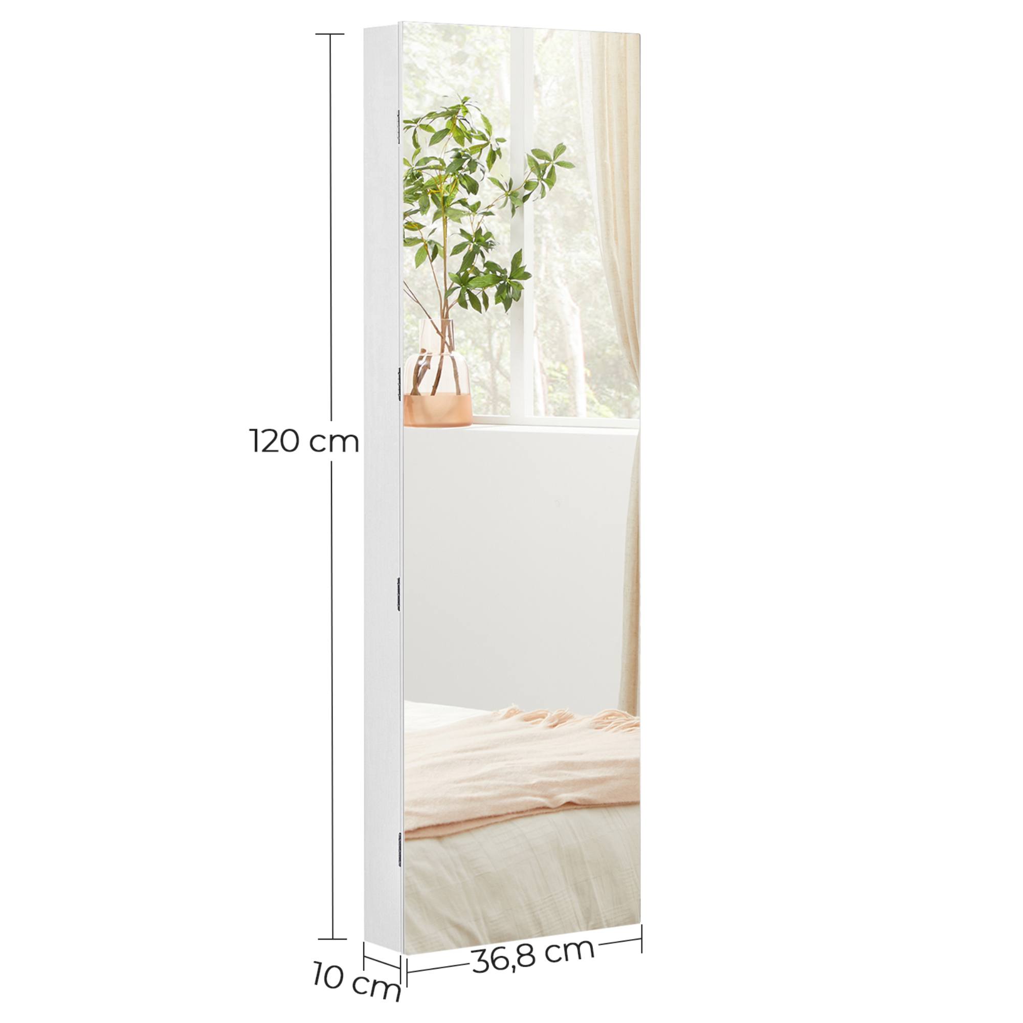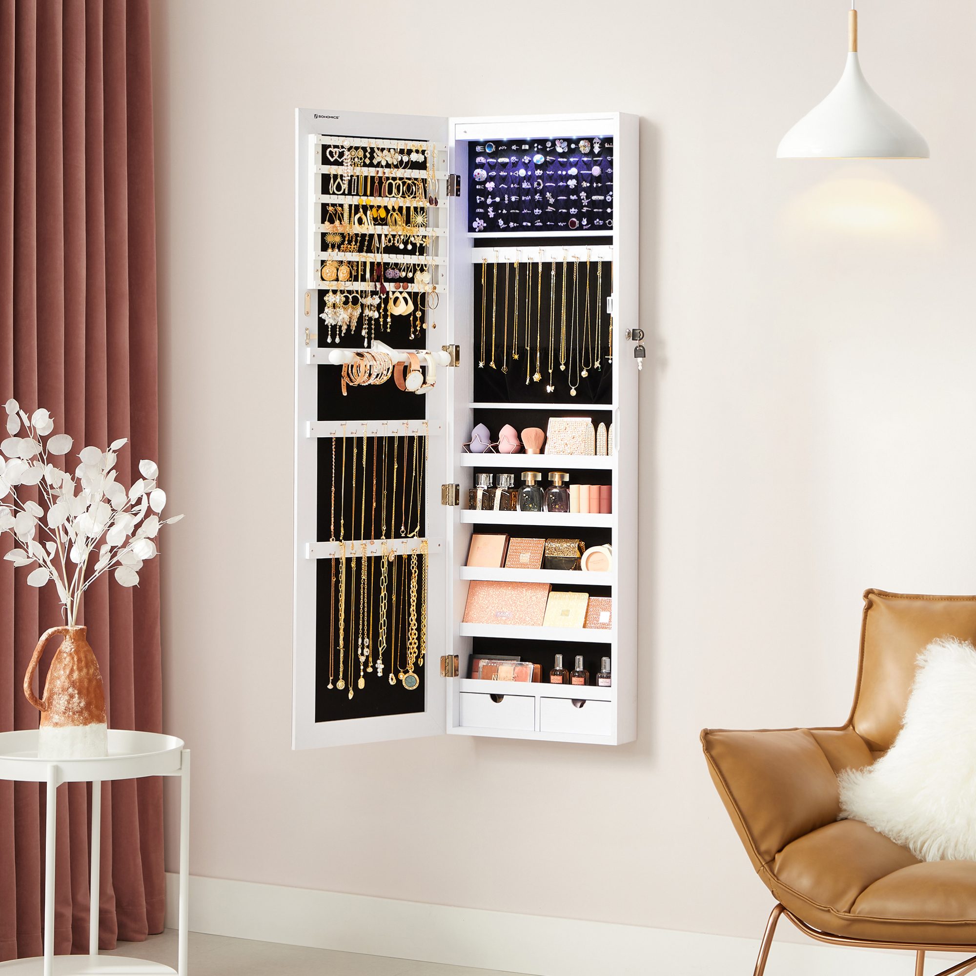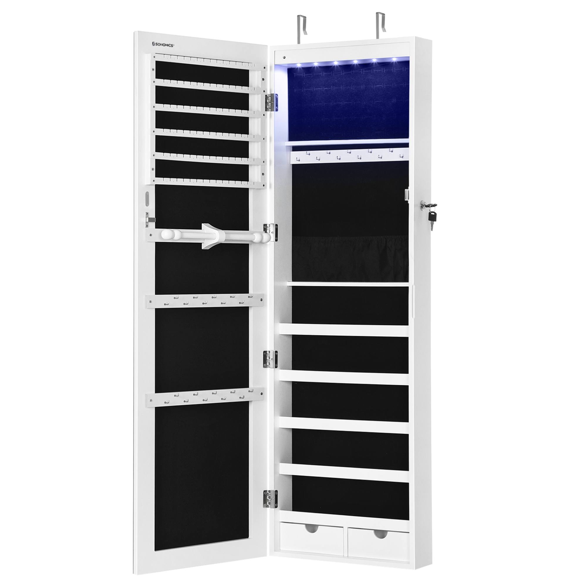 Závesná šperkovnica LOVA I so zrkadlom dokonale ozdobí dvere vašej spálne alebo stenu v obývacej izbe. Na dvere ju upevníte pomocou háčikov, na stenu zase s dodávanými klincami. Vnútro uzamykateľného kabinetu vás očarí zamatovou podšívkou a LED osvetlením, ktoré sa pri otvorení dvierok zapne. Prakticky rozdelené priehradky vám umožnia mať všetky svoje poklady vždy usporiadané. Drevený materiál je ľahký na údržbu.