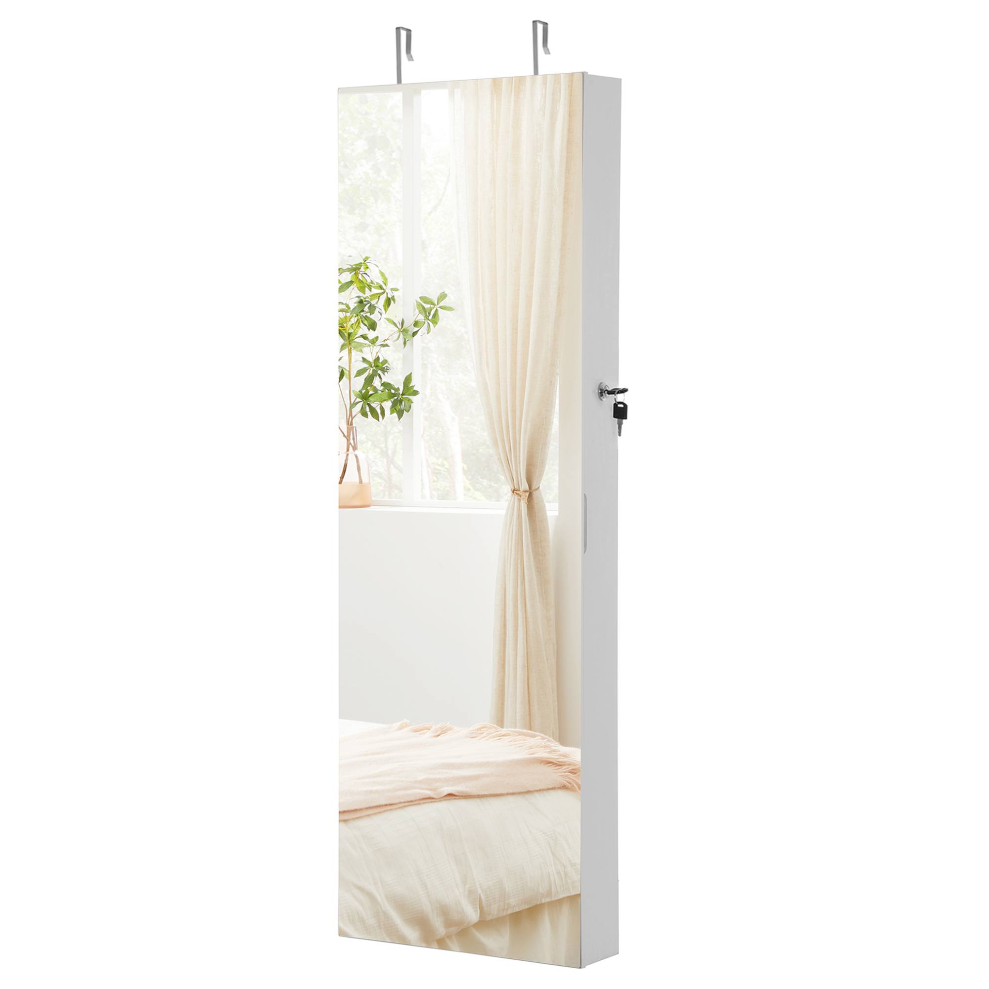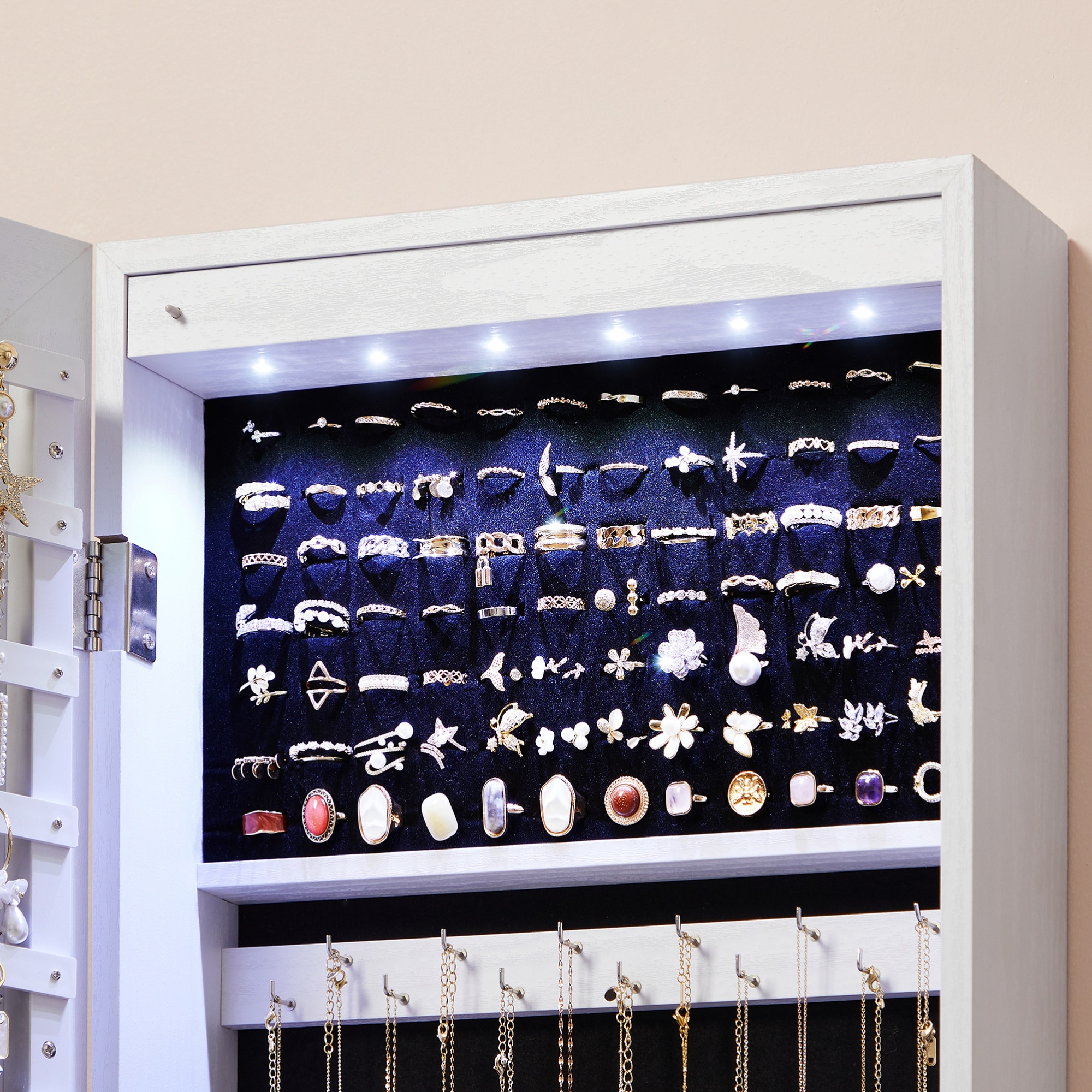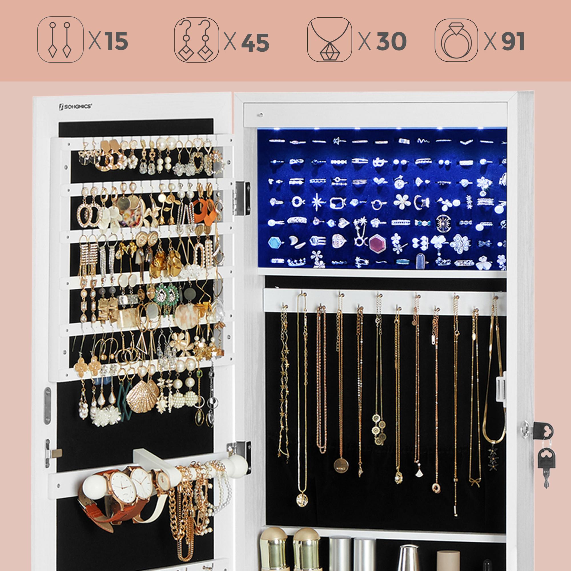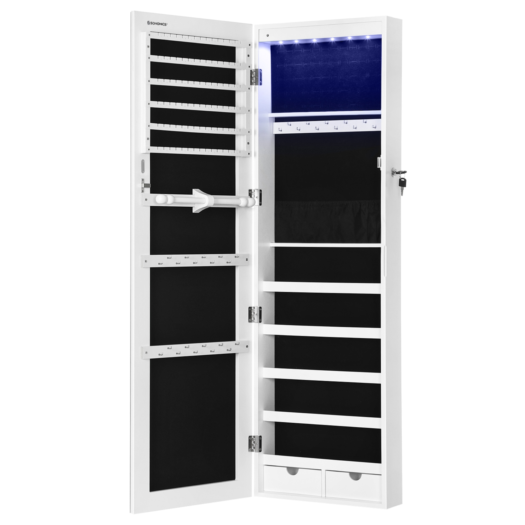 Závesná šperkovnica LOVA I so zrkadlom dokonale ozdobí dvere vašej spálne alebo stenu v obývacej izbe. Na dvere ju upevníte pomocou háčikov, na stenu zase s dodávanými klincami. Vnútro uzamykateľného kabinetu vás očarí zamatovou podšívkou a LED osvetlením, ktoré sa pri otvorení dvierok zapne. Prakticky rozdelené priehradky vám umožnia mať všetky svoje poklady vždy usporiadané. Drevený materiál je ľahký na údržbu.