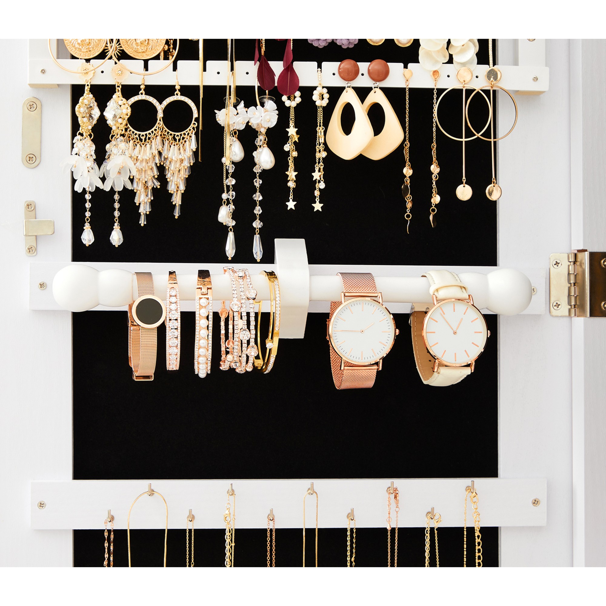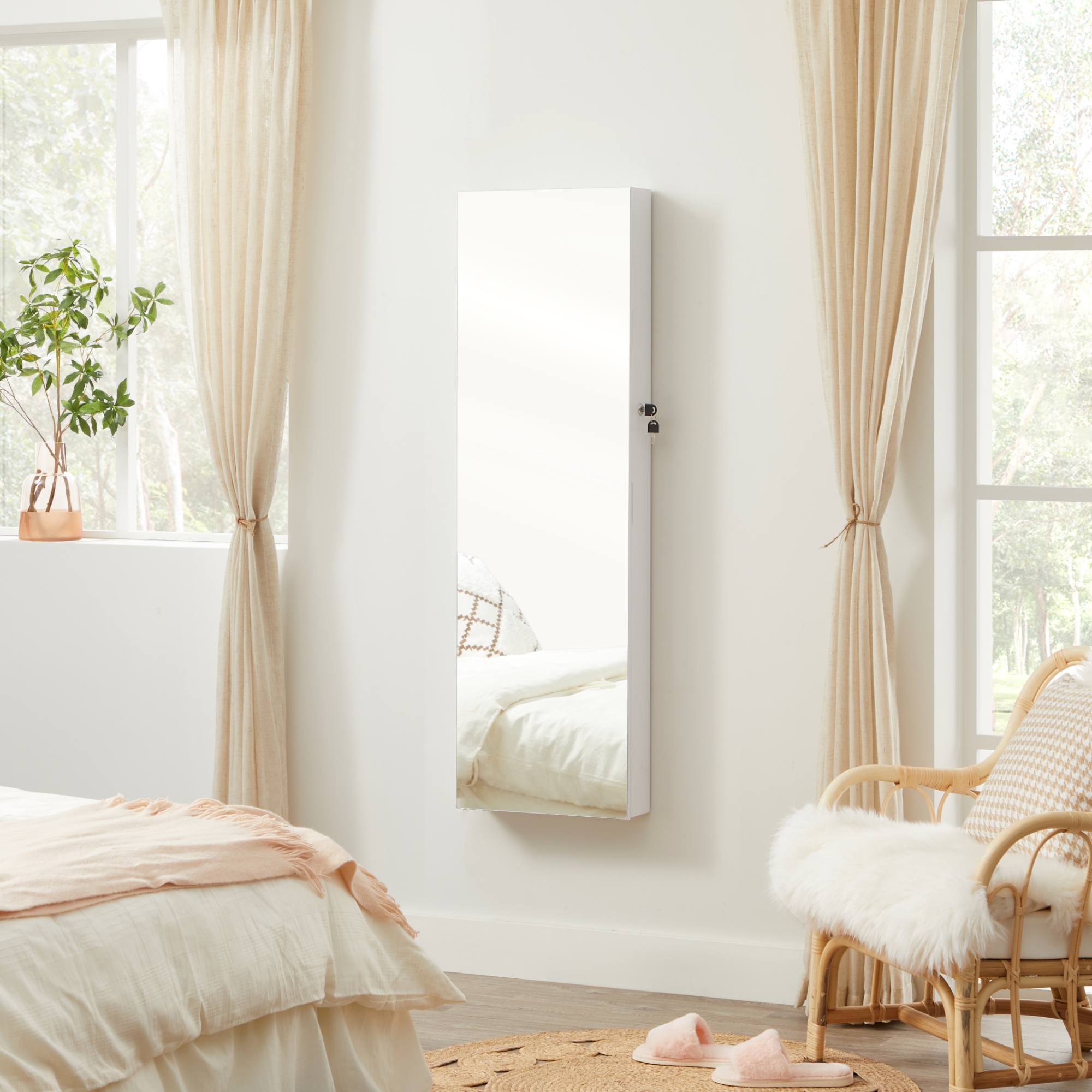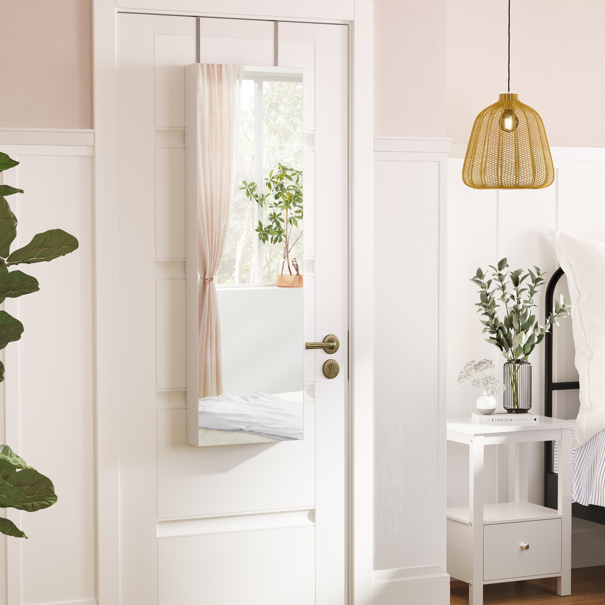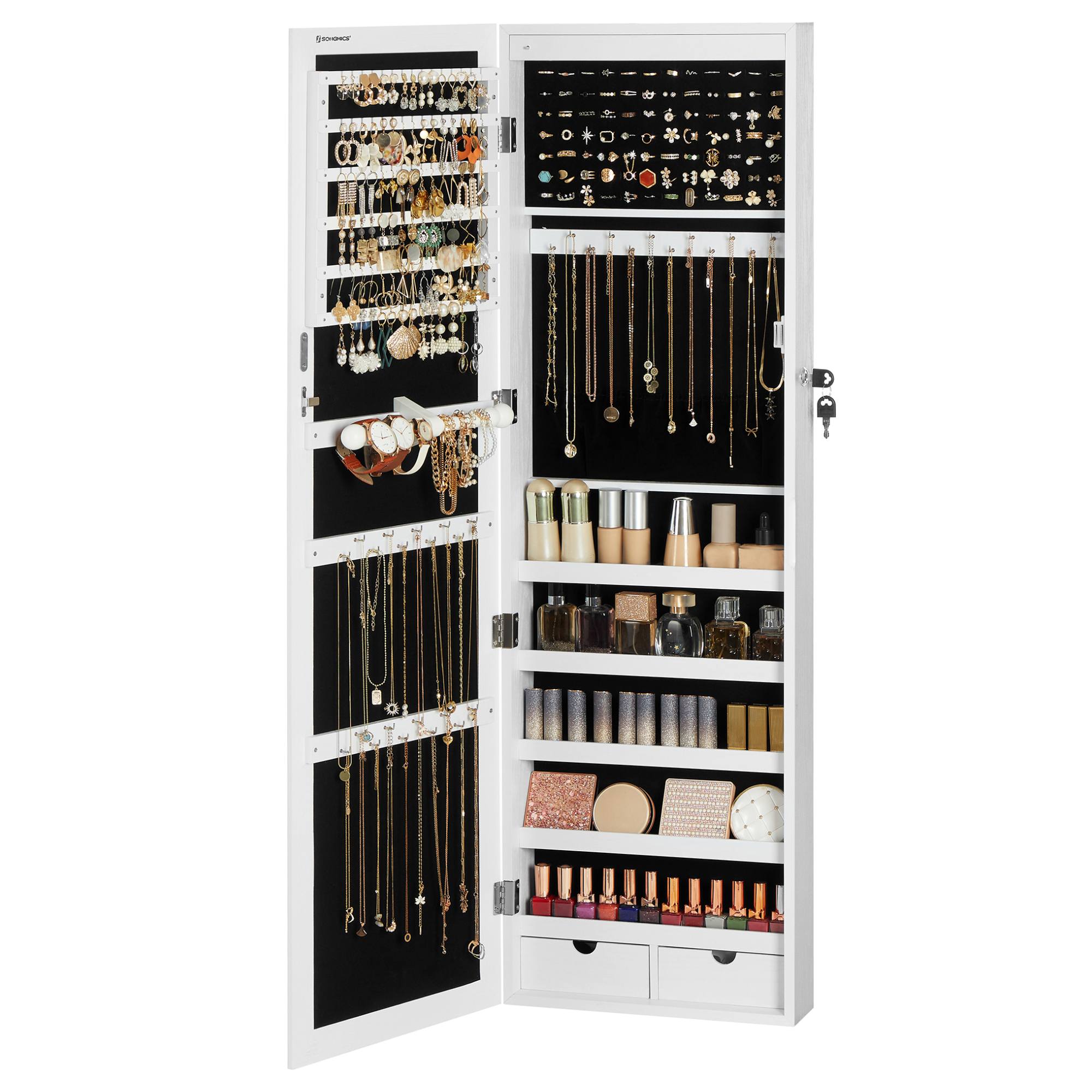 Závesná šperkovnica LOVA I so zrkadlom dokonale ozdobí dvere vašej spálne alebo stenu v obývacej izbe. Na dvere ju upevníte pomocou háčikov, na stenu zase s dodávanými klincami. Vnútro uzamykateľného kabinetu vás očarí zamatovou podšívkou a LED osvetlením, ktoré sa pri otvorení dvierok zapne. Prakticky rozdelené priehradky vám umožnia mať všetky svoje poklady vždy usporiadané. Drevený materiál je ľahký na údržbu.