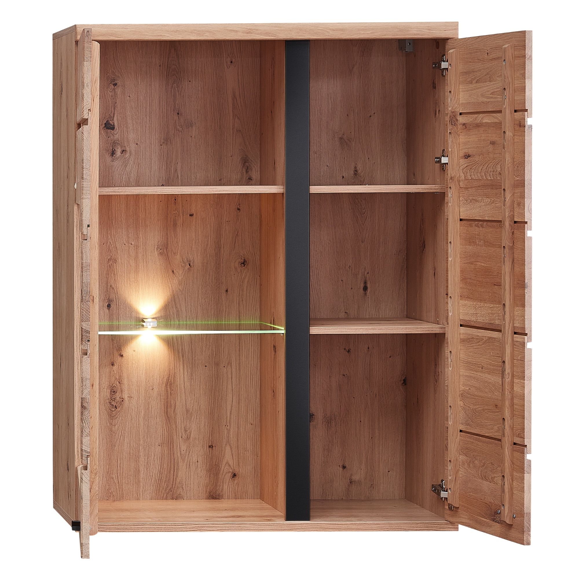 Za jej 2 dvierkami, z ktorých jedny sú čiastočne presklené, sa nachádzajú 4 vložené police. Jedna polica je vyrobená zo skla. Nechýba ani LED osvetlenie, ktoré umožní vystaveným predmetom vyniknúť naplno.