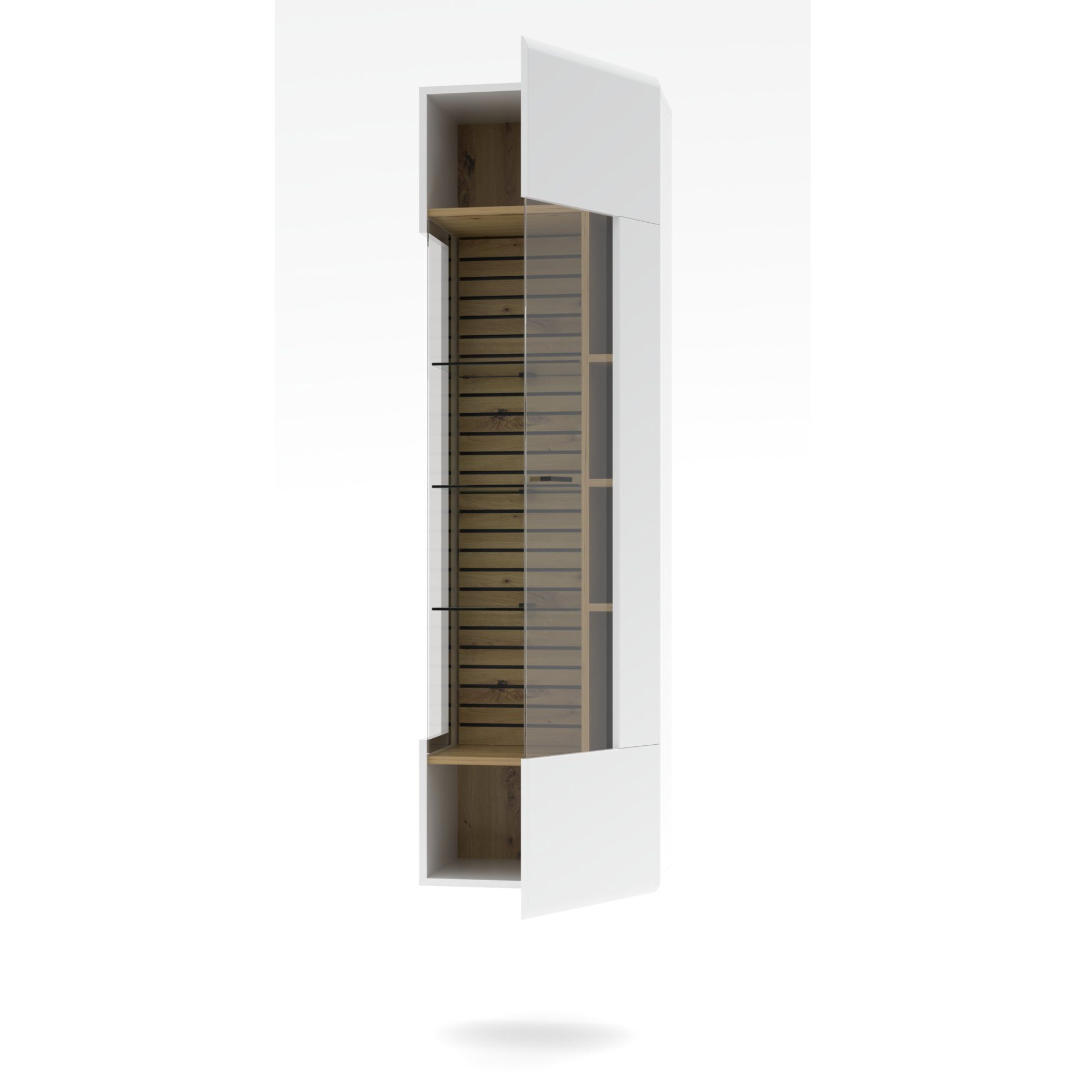 Za čiastočne presklenými dvierkami vitríny sa nachádza 5 políc, z ktorých 3 sú zo skla. Vitrína tak ponúkne dostatok úložného priestoru a zároveň vám umožní vystaviť vaše obľúbené predmety. Aby sa s dvierkami ľahšie manipulovalo, sú vybavené kovovou rúčkou. Dvierka je možné namontovať na ľavú aj pravú stranu vitríny. Do vitríny si môžete dokúpiť aj LED osvetlenie.