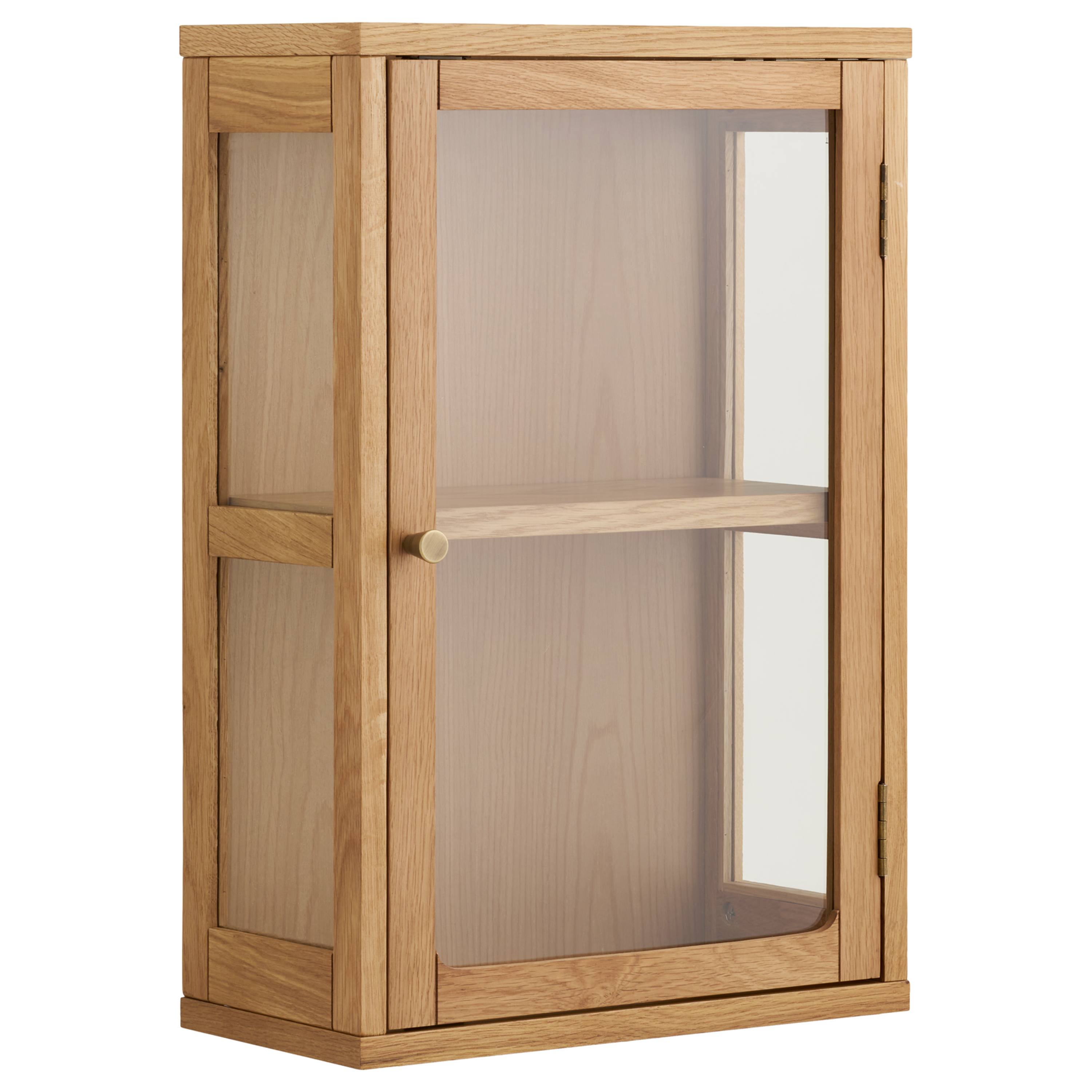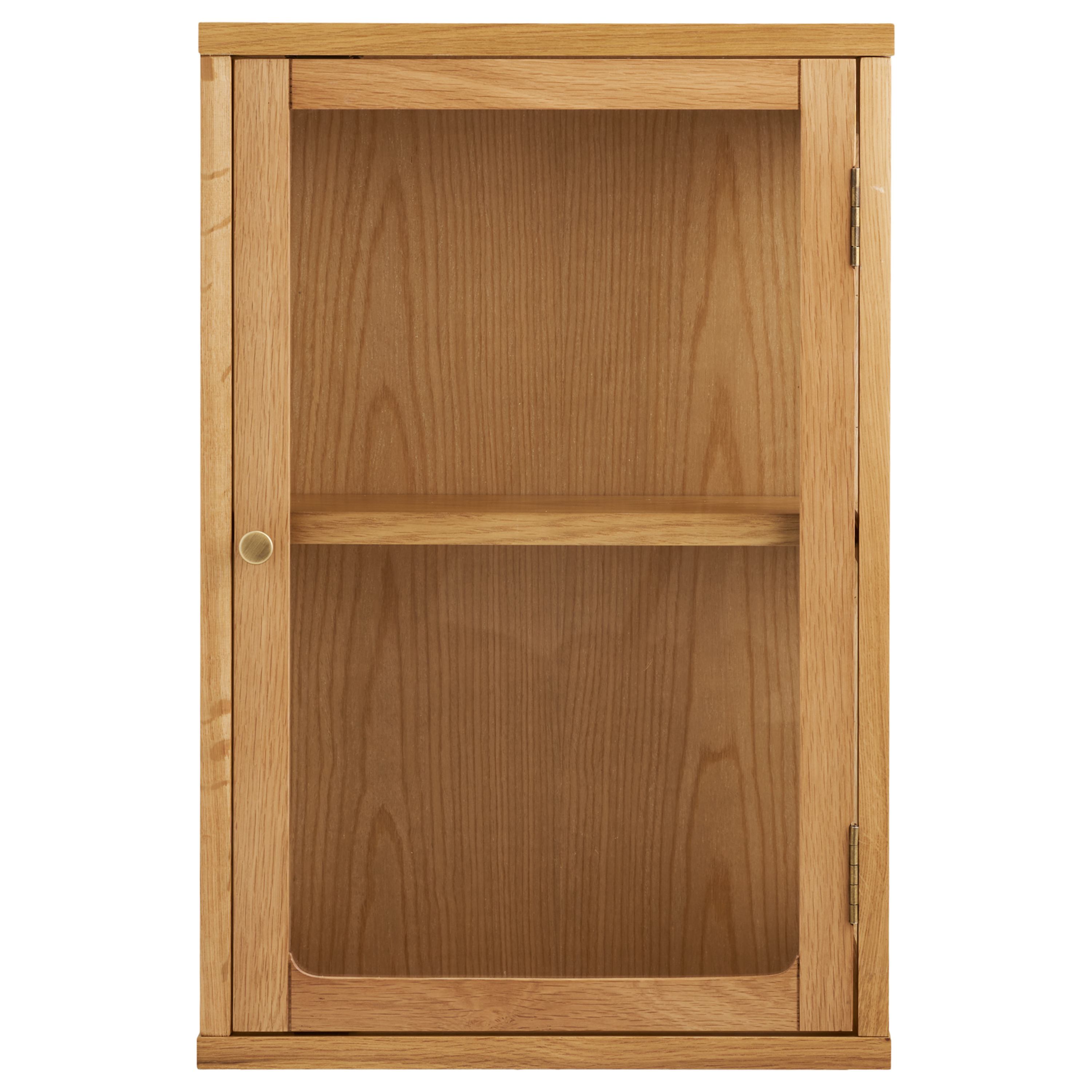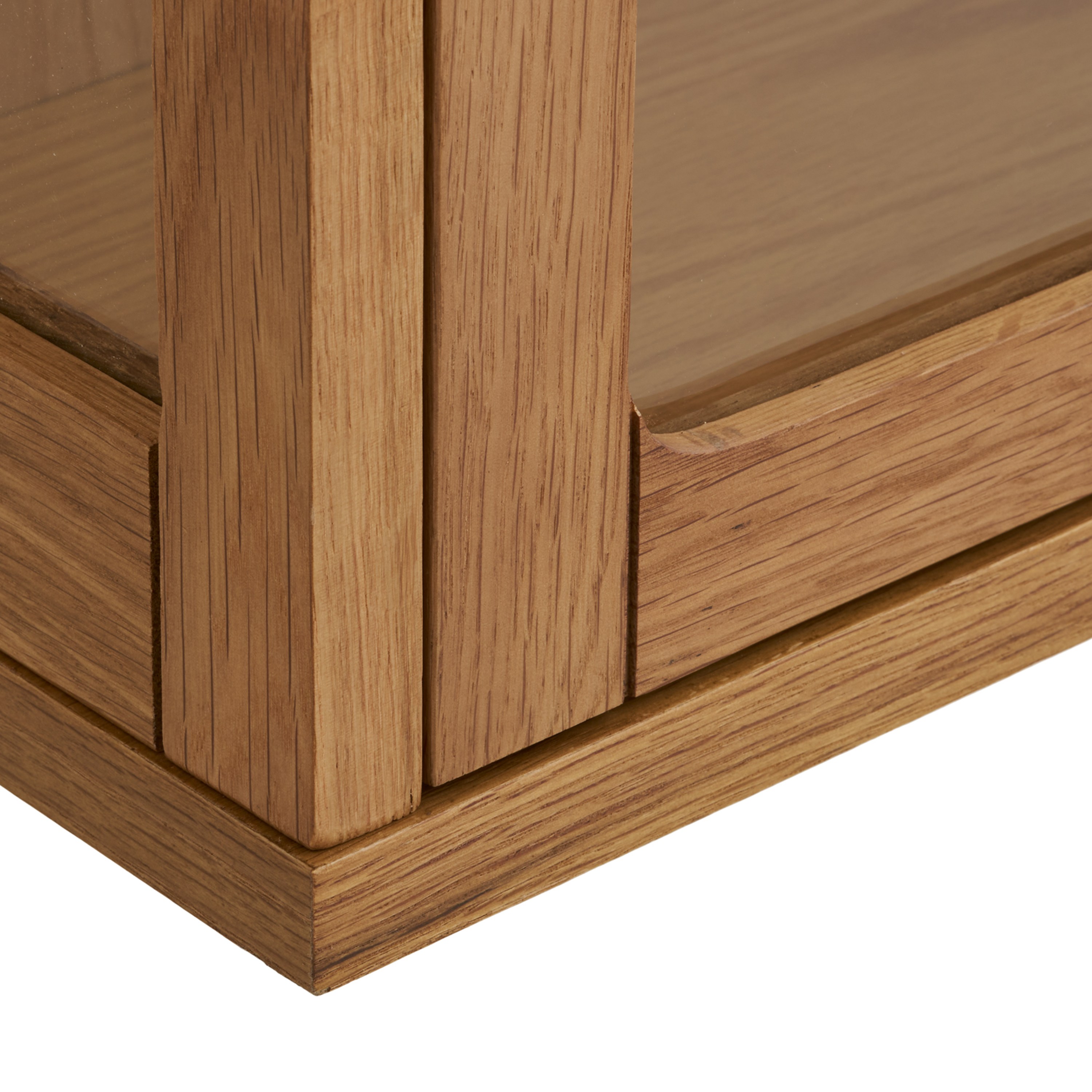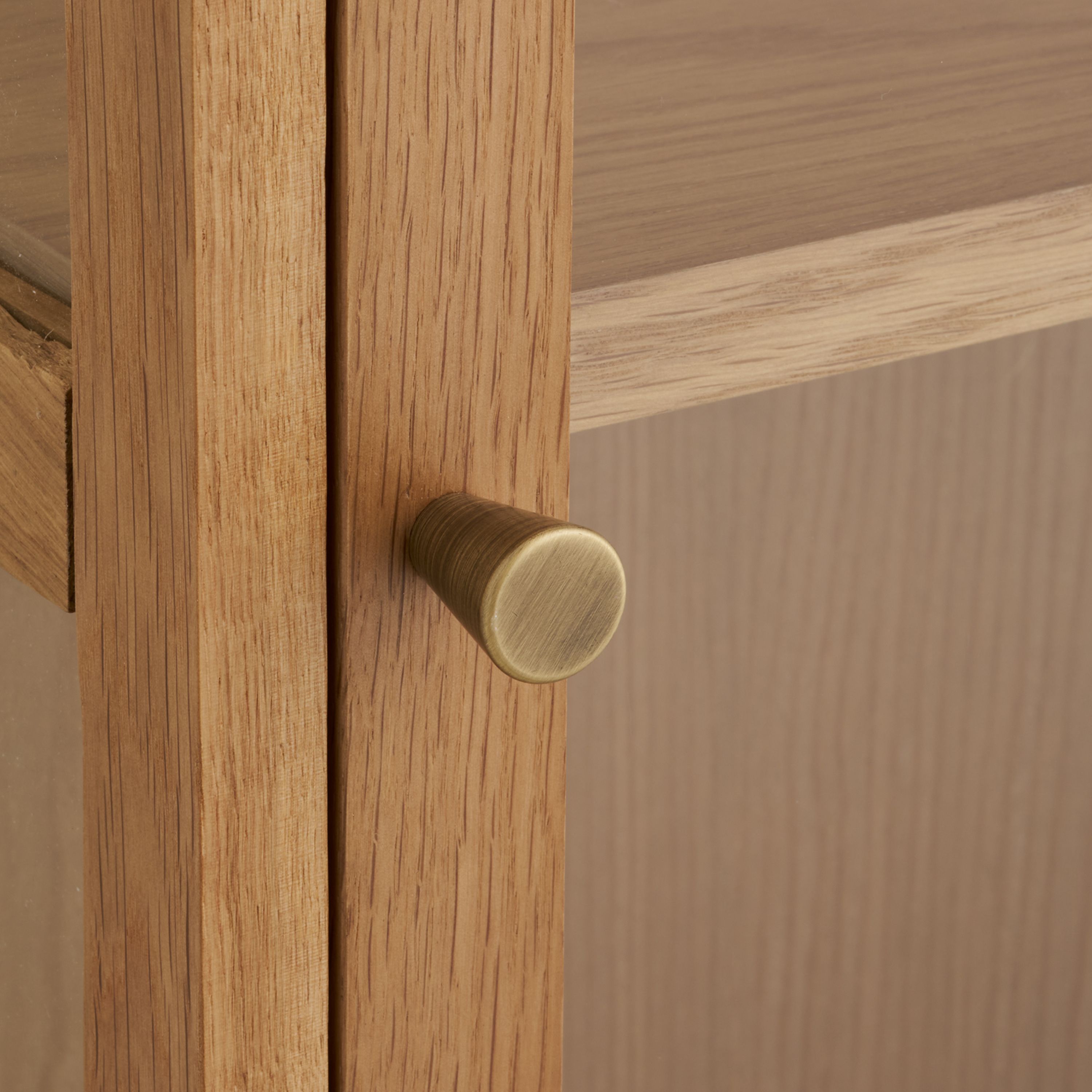 Konštrukcia je vybavená presklenými otočnými dverami, v ktorých sa nachádzajú vložené police, ktoré vám umožnia skladovanie s jednoduchým prístupom. Jednoduchú každodennú manipuláciu následne zabezpečujú drobné úchyty. Konštrukcia je vyrobená z kvalitného MDF materiálu s dubovou dyhou.