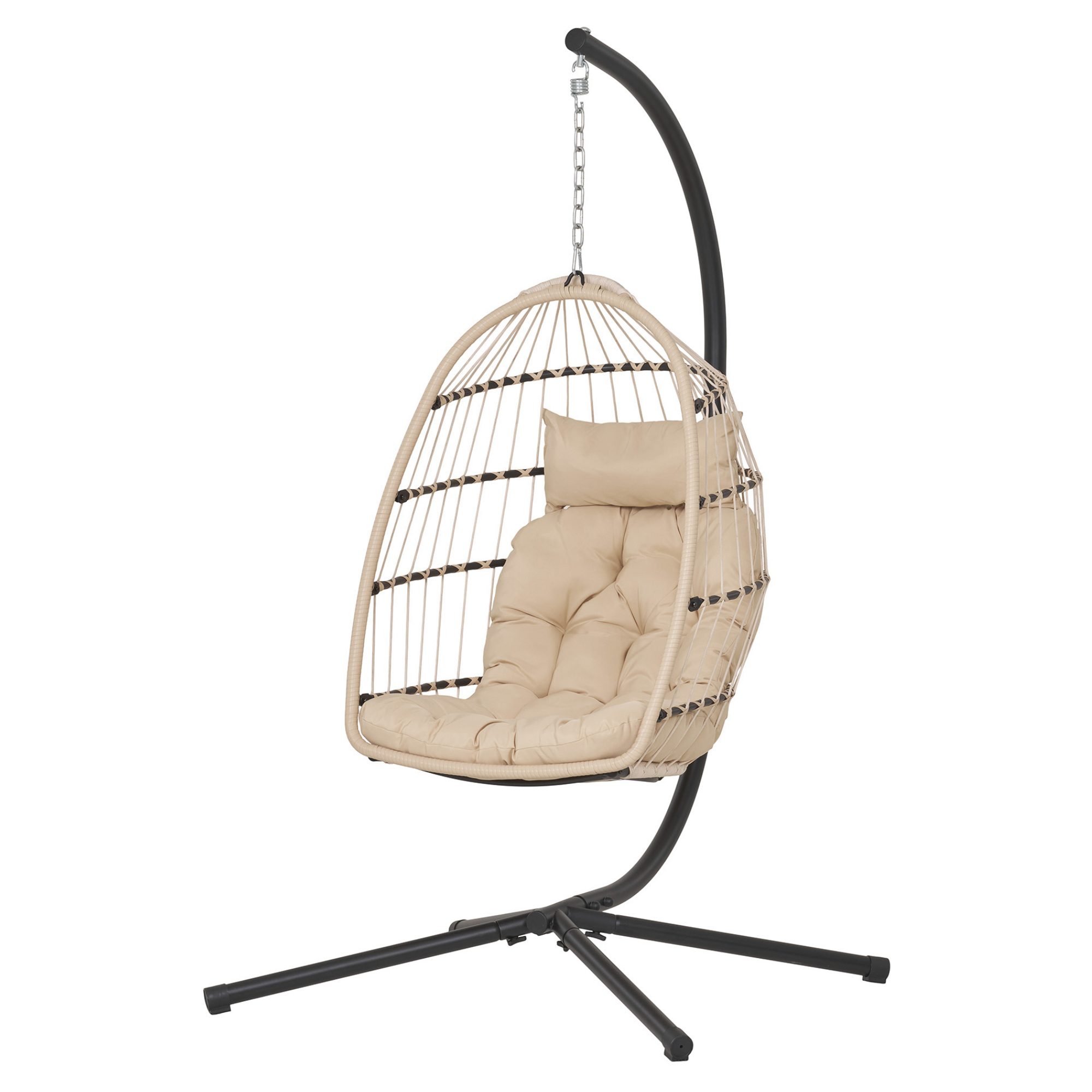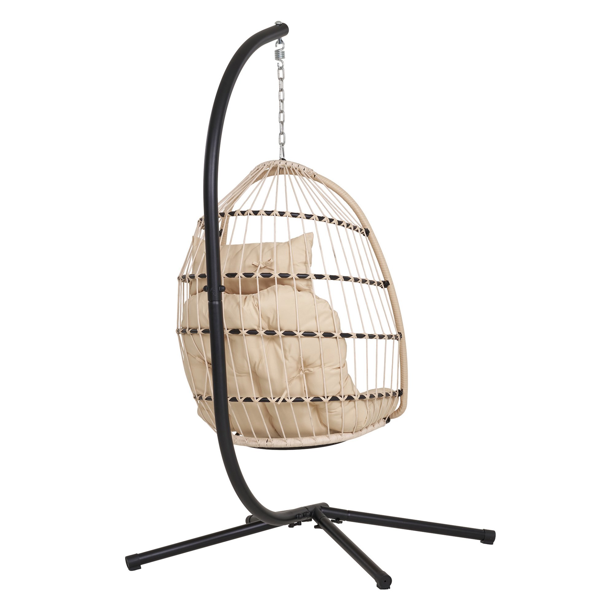 Pevná a stabilná konštrukcia tohto kresla je vyrobená z kovu a jej povrch je lakovaný. Na konštrukcii visí vajíčko vypletané polyratanom a vybavené pohodlným sedákom potiahnutým hladkou tkaninou.