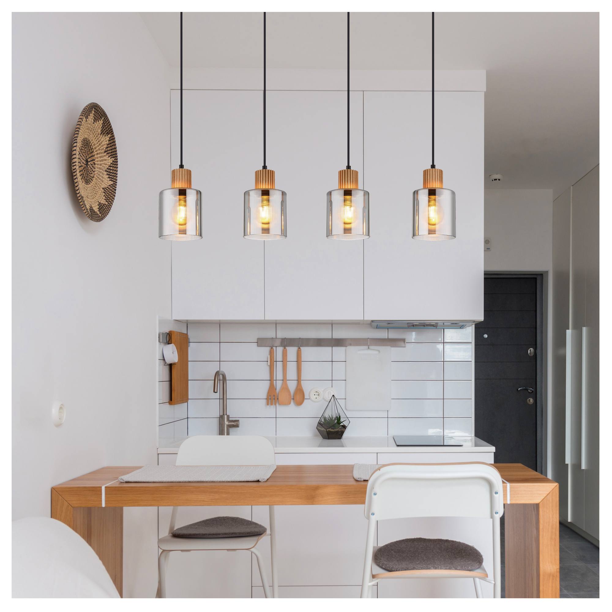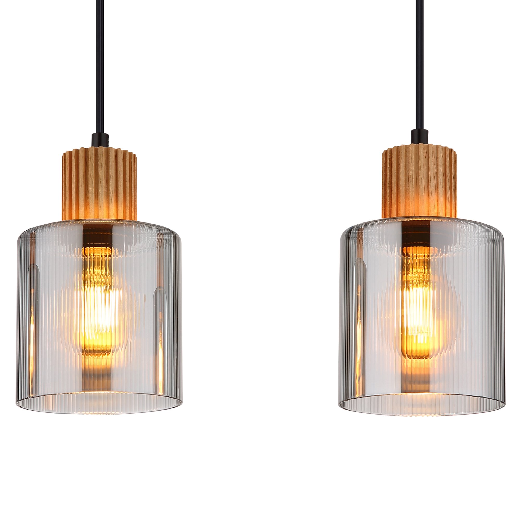 Konštrukcia svietidla je vyrobená z kovu v čiernej farbe. Disponuje 4 tienidlami zo skla s použitím dymového efektu, ktorý v kombinácii s vrúbkovaným prevedením dodáva svietidlu výnimočný retro nádych. Zaujímavým detailom je drevený doplnok s dekoratívnym výrezom. Tento elegantný dizajn robí zo svietidla nielen funkčný, ale aj štýlový doplnok každého interiéru. Praktickým prvkom svietidla je nastaviteľná výška, ktorá umožňuje prispôsobenie podľa vašich potrieb.