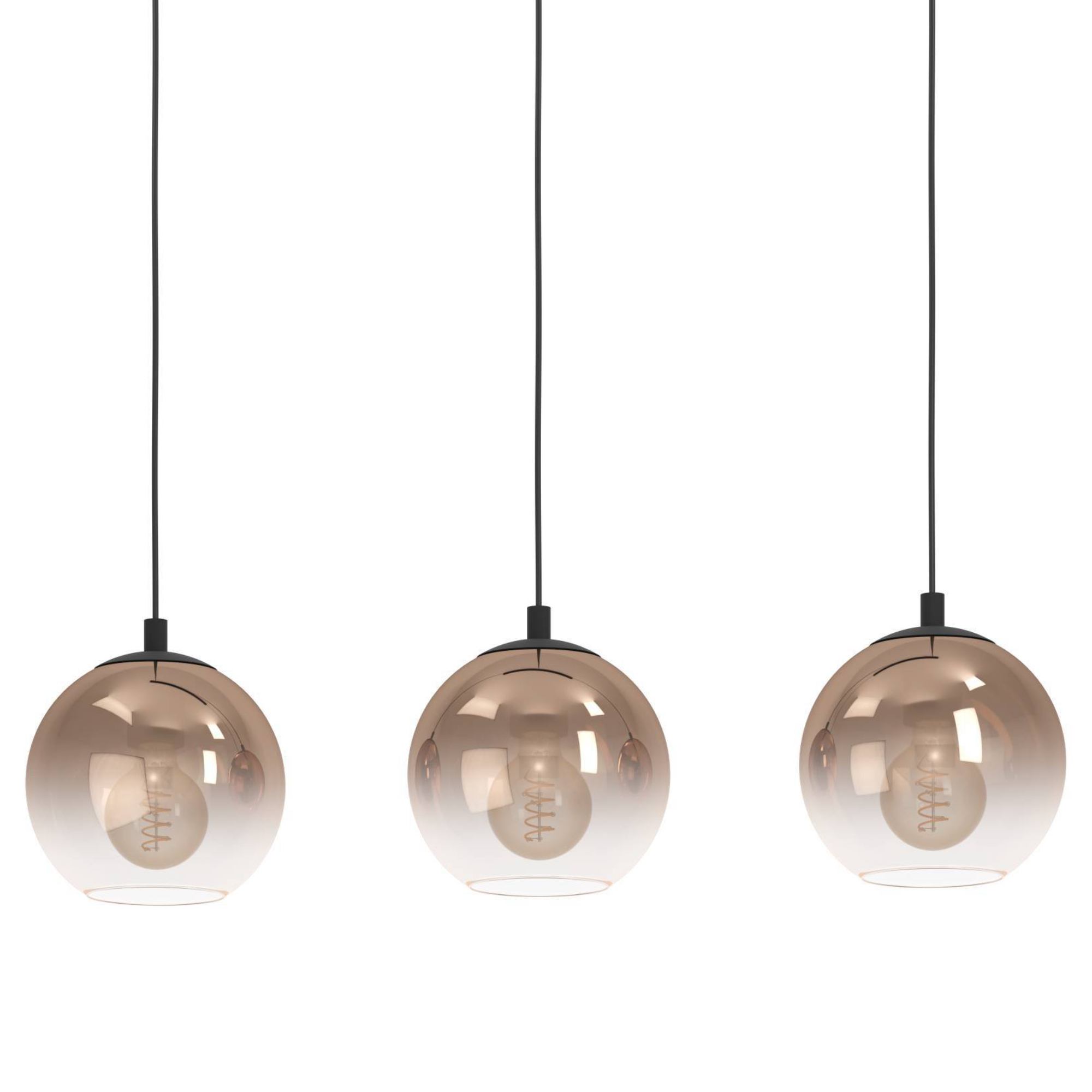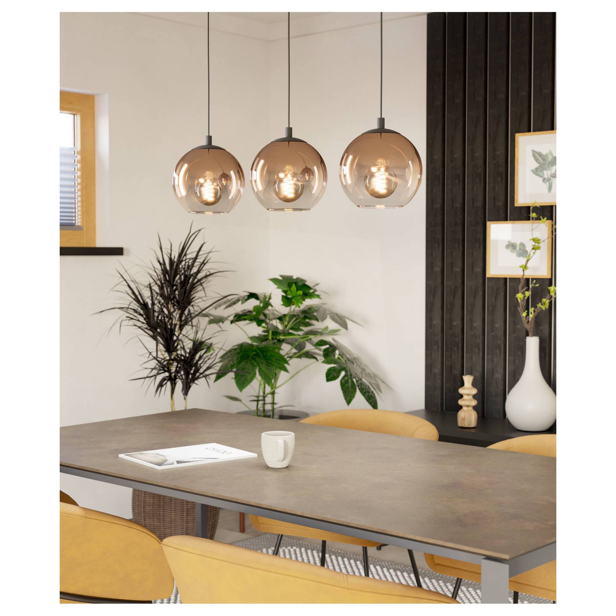 Má kovovú konštrukciu so šírkou 77 cm v matnom čiernom prevedení, na ktorej sú zavesené 3 tienidlá. Tie sú vyrobené zo skla s použitím dymového efektu, ktorý im dodáva neobyčajný retro nádych. Odporúčame použiť žiarovky v retro dizajne napríklad so špirálovou diódou, čím posuniete svietidlo na vyššiu úroveň. Je ideálnym osvetlením nad jedálenský stôl či barový pult.