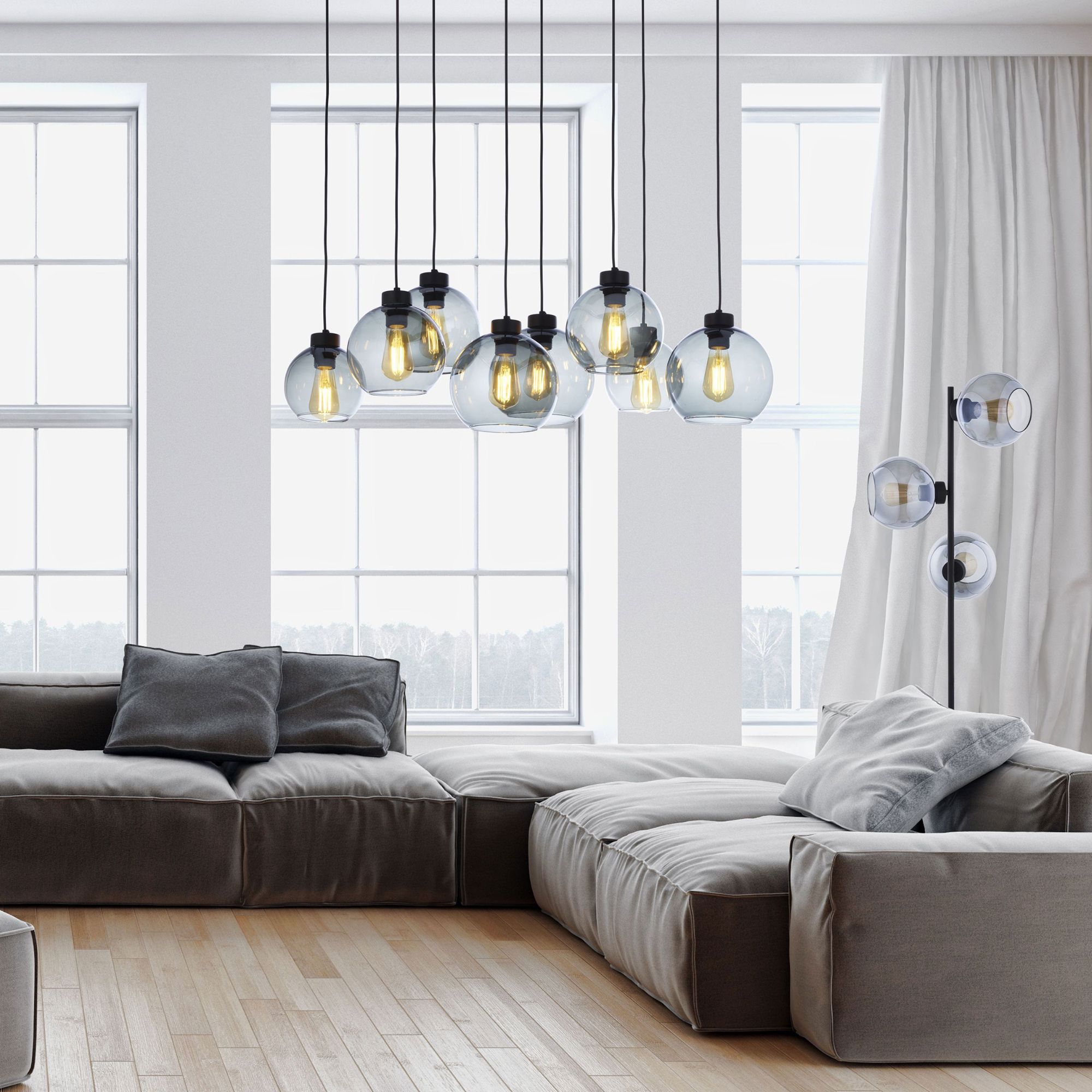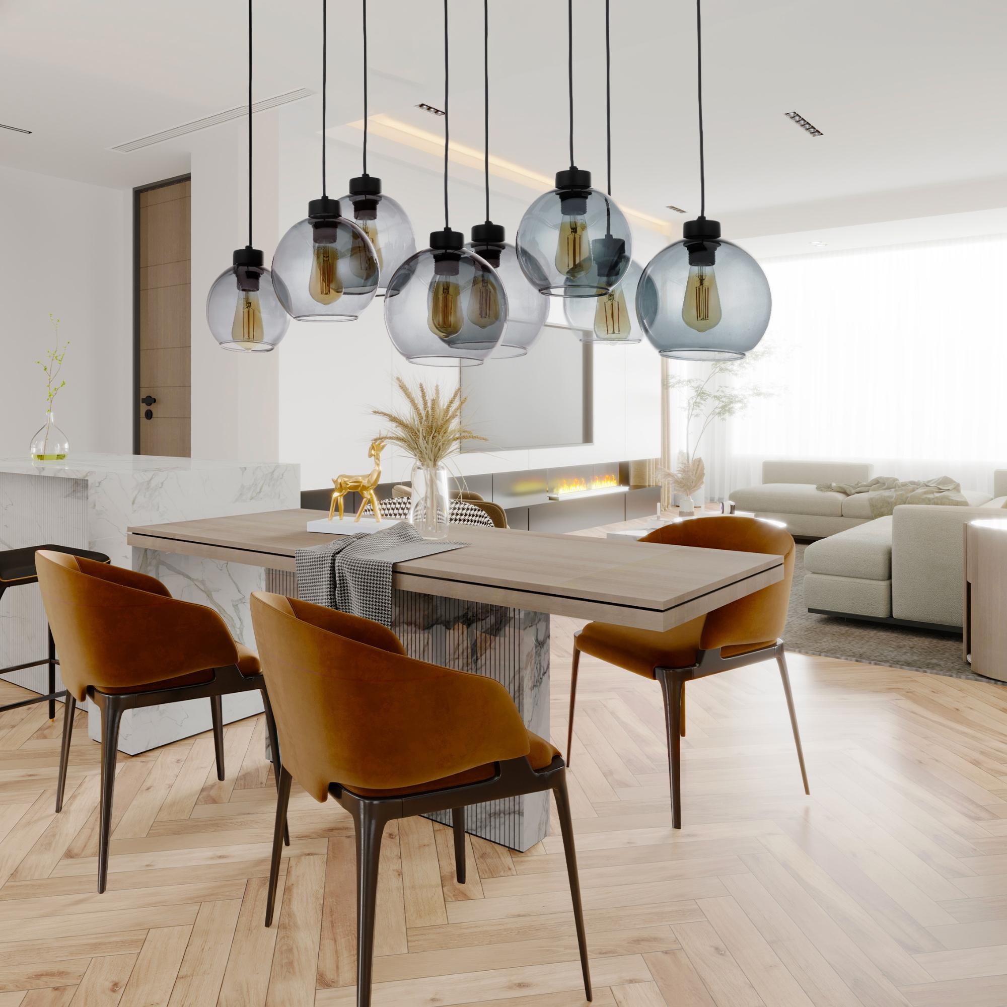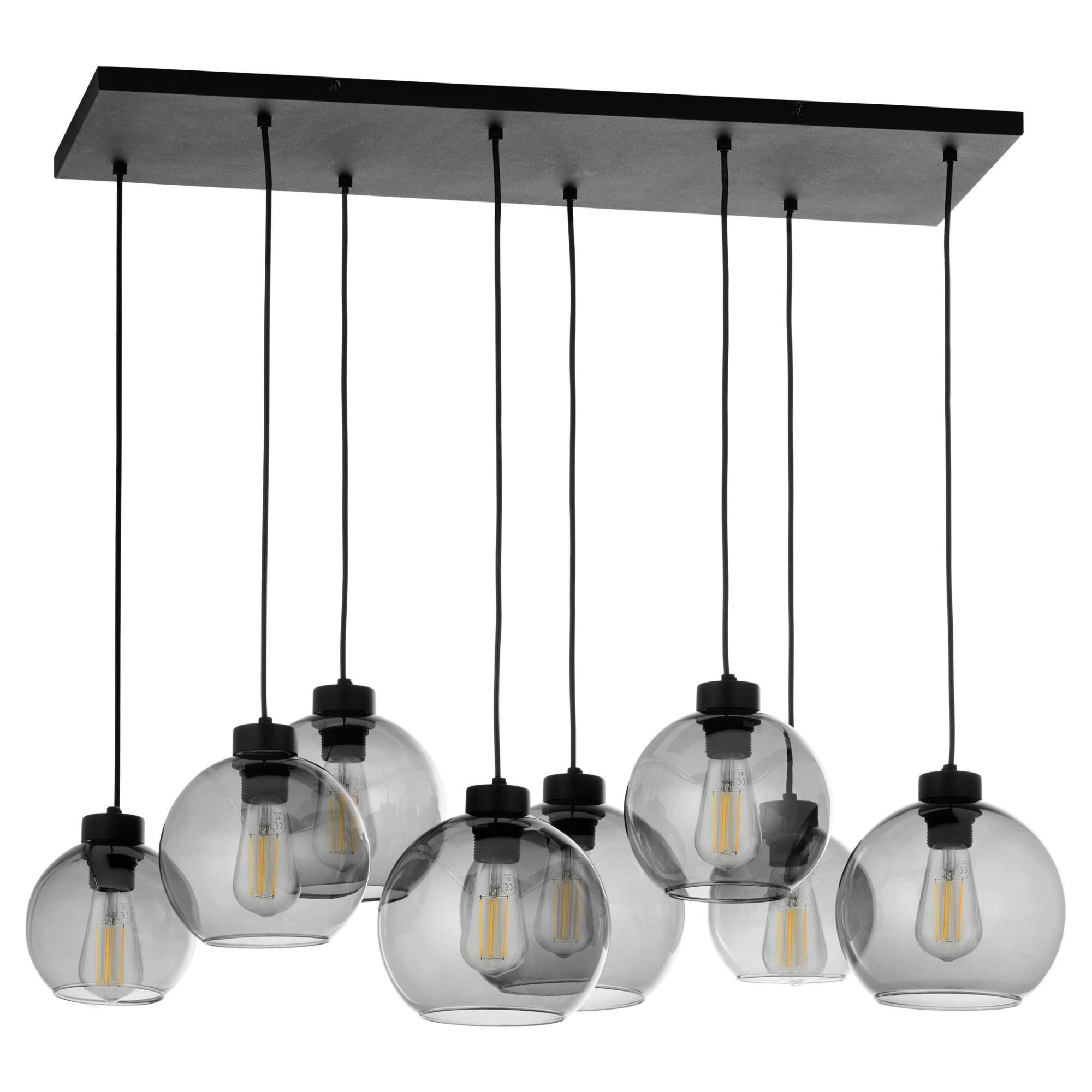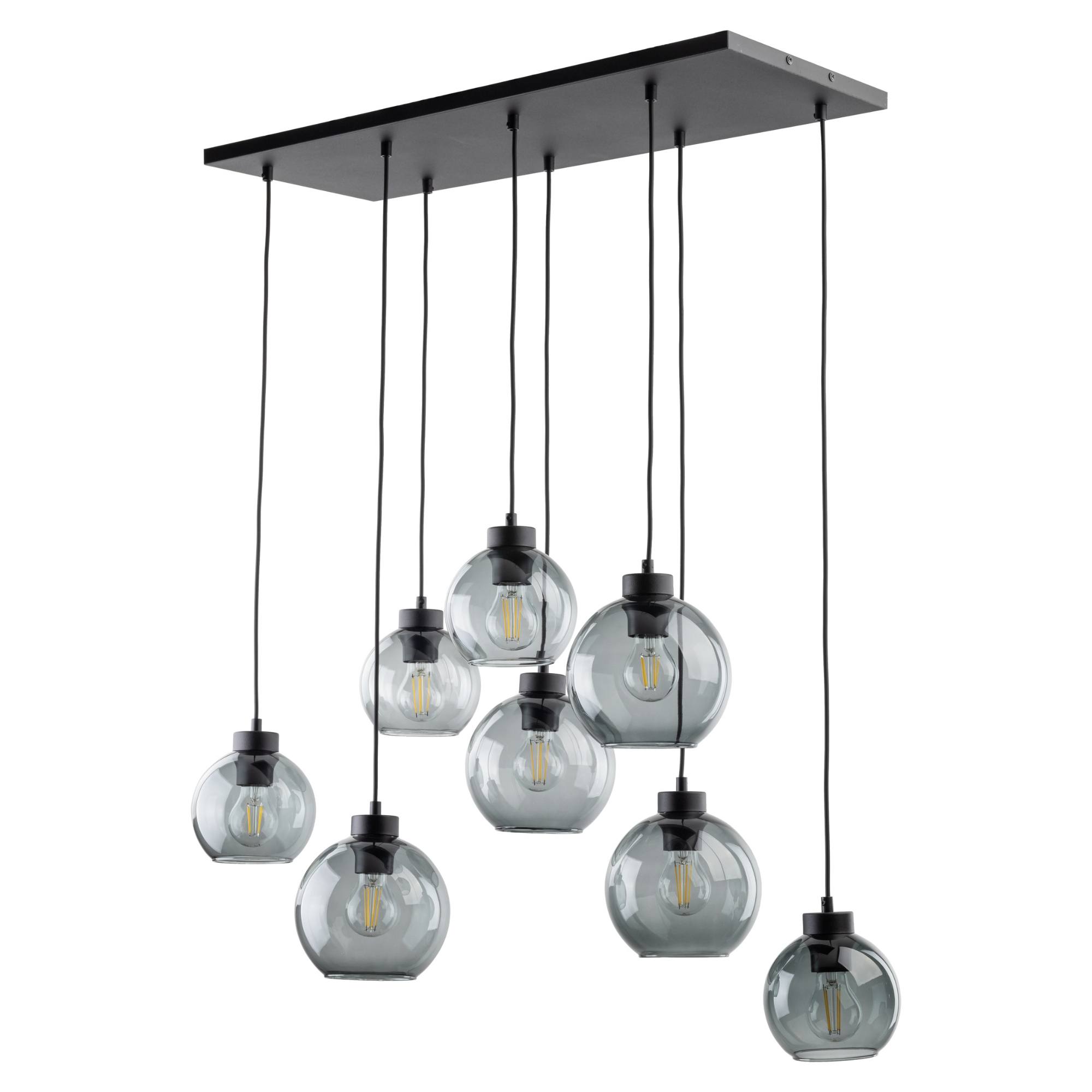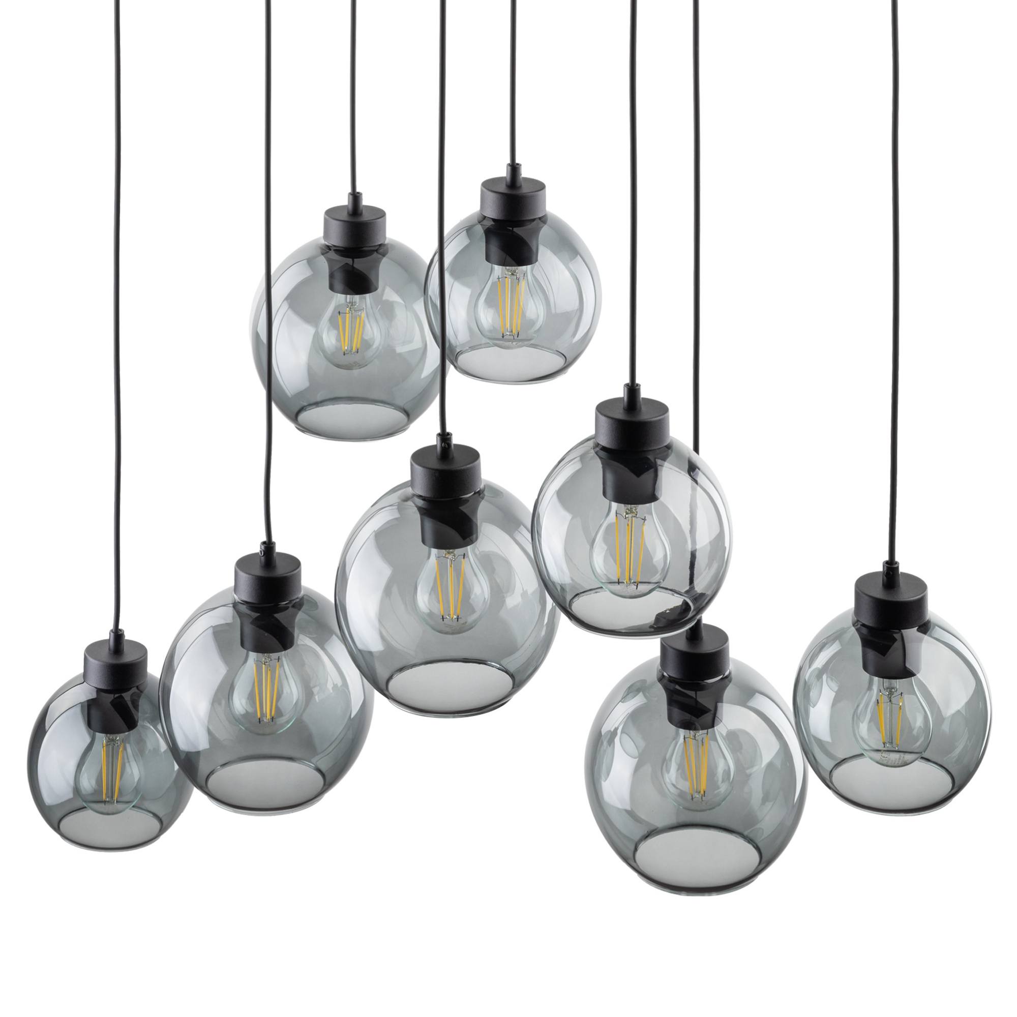 Má čiernu kovovú konštrukciu doplnenú o 8 guľatých tienidiel zo skla s dymovým efektom, ktorý im dodáva neobyčajný retro nádych. Tento elegantný dizajn z neho robí nielen funkčný, ale aj štýlový prvok každého interiéru. Je ideálne nad konferenčný či jedálenský stôl. Odporúčame ho doplniť zaujímavými žiarovkami, ktoré vďaka priesvitnému sklu krásne vyniknú a posunú tento dizajn na vyššiu úroveň.